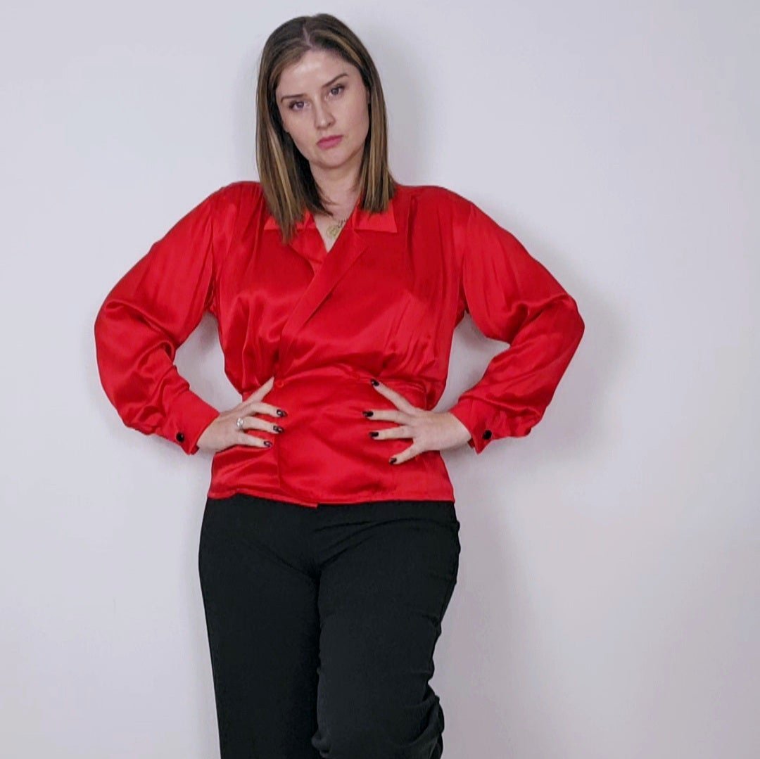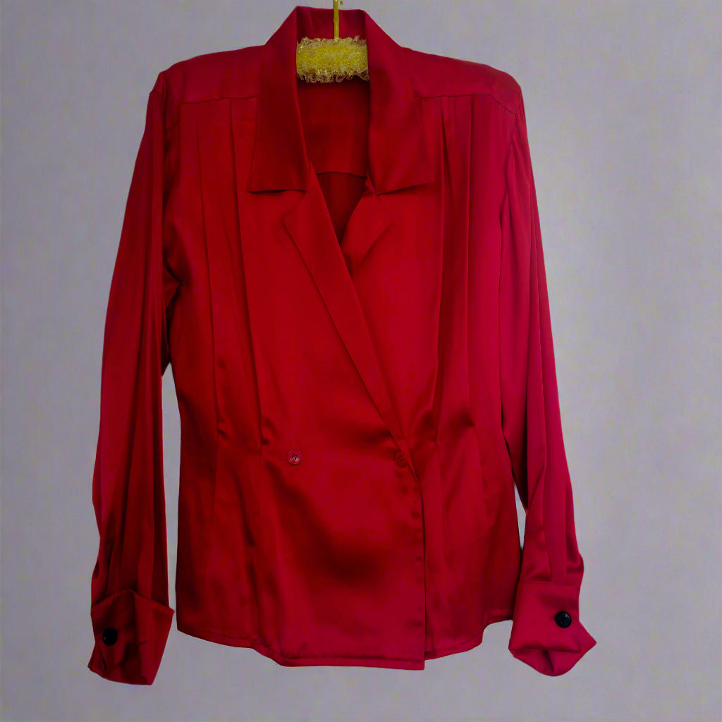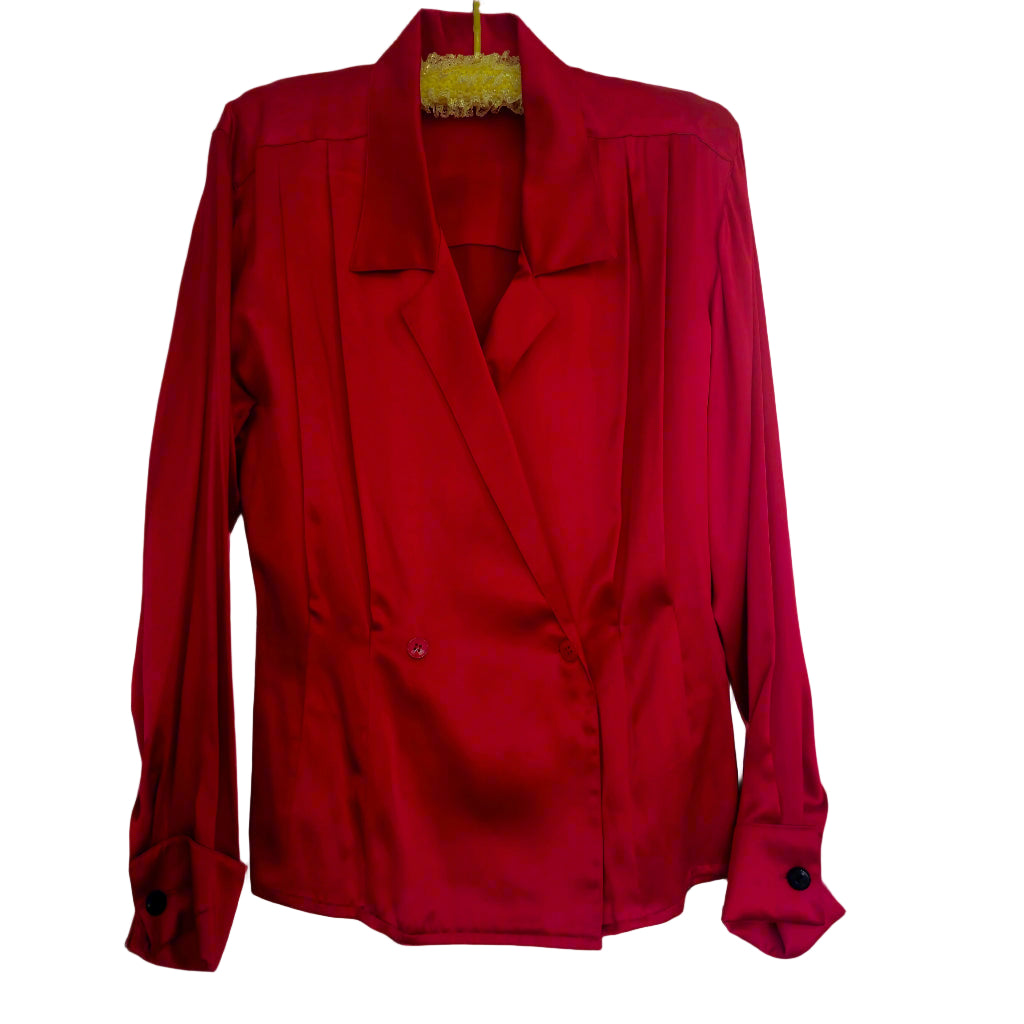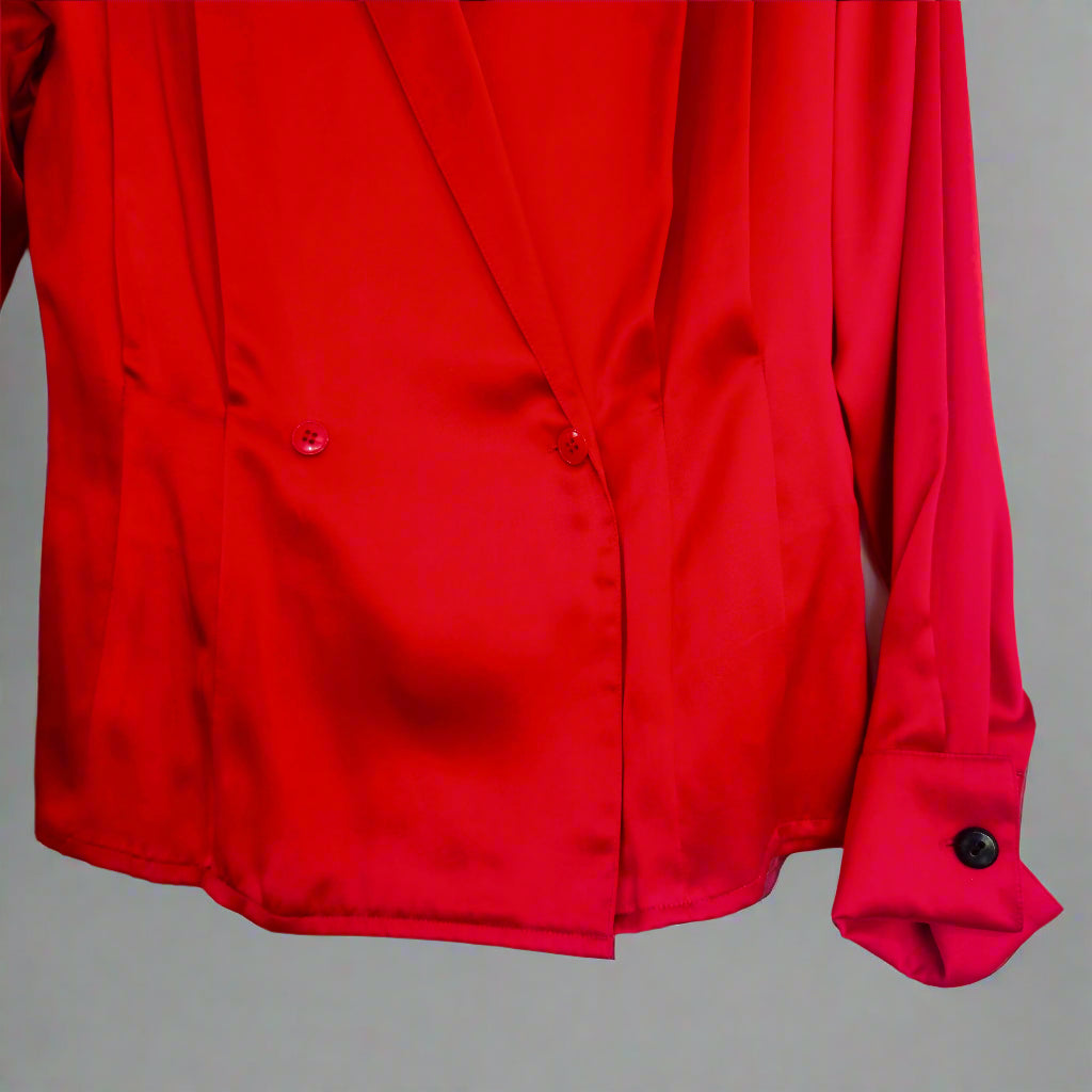 Transport yourself to the glamour of the 1980s with our Vintage Anne Klein II Red Silk Blouse. Crafted from luxurious silk, this timeless piece exudes elegance and sophistication. Adorned with unique black square buttons on the wrist cuffed sleeves, the blouse features darting on both the front and back, creating a cinched waist and enhancing its structural appeal. The double-breasted style is accentuated by two red buttons and two hidden snap buttons along the neckline, ensuring a secure fit without any gaping. Despite a minor scratch on the right-hand wrist cuff, this blouse remains in good condition, with its original shoulder pads removed for a more contemporary silhouette. Elevate your wardrobe with this chic and timeless piece.