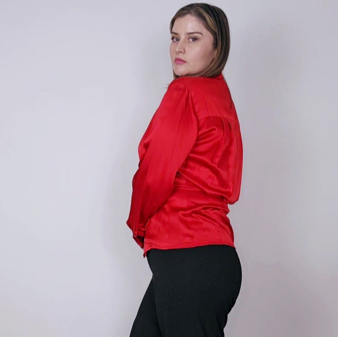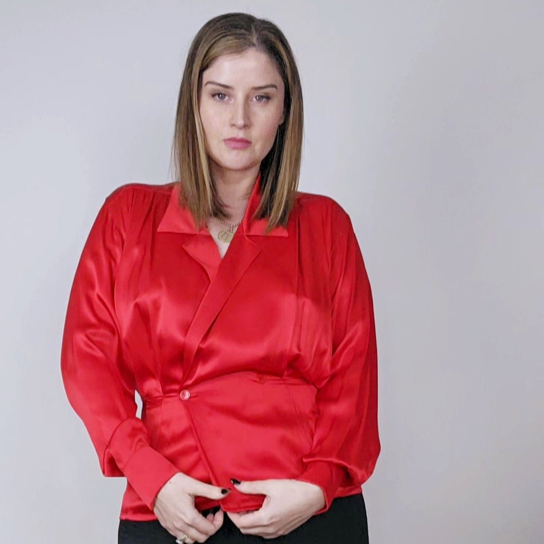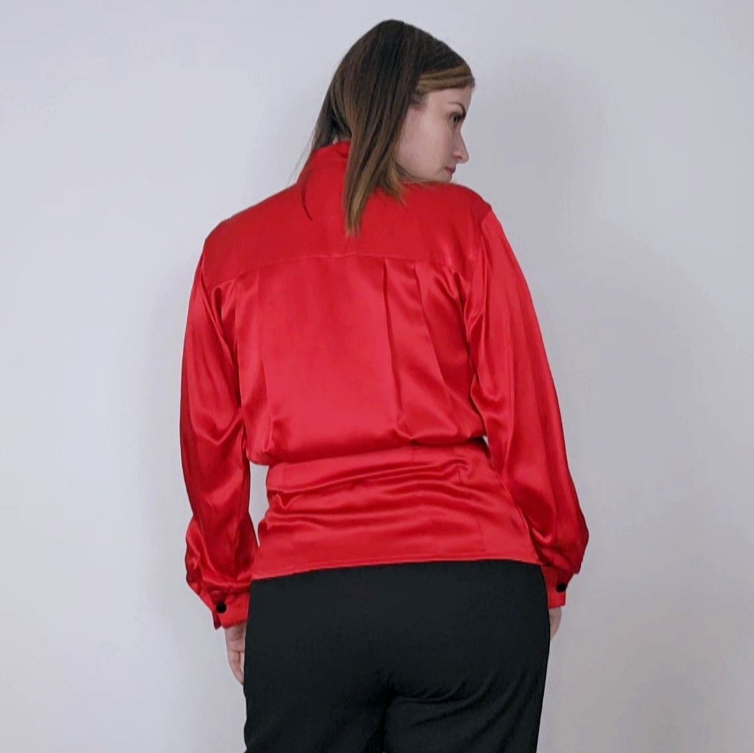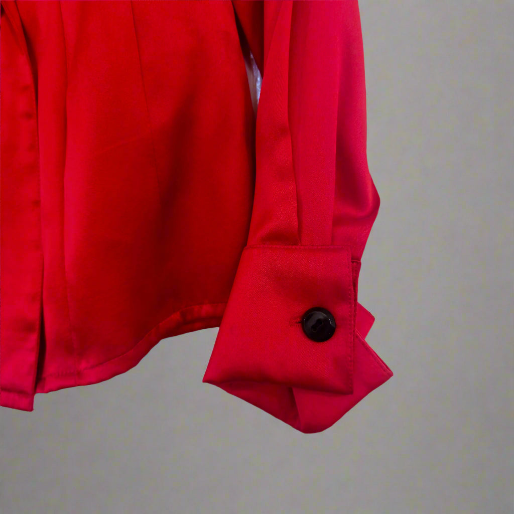 Transport yourself to the glamour of the 1980s with our Vintage Anne Klein II Red Silk Blouse. Crafted from luxurious silk, this timeless piece exudes elegance and sophistication. Adorned with unique black square buttons on the wrist cuffed sleeves, the blouse features darting on both the front and back, creating a cinched waist and enhancing its structural appeal. The double-breasted style is accentuated by two red buttons and two hidden snap buttons along the neckline, ensuring a secure fit without any gaping. Despite a minor scratch on the right-hand wrist cuff, this blouse remains in good condition, with its original shoulder pads removed for a more contemporary silhouette. Elevate your wardrobe with this chic and timeless piece.