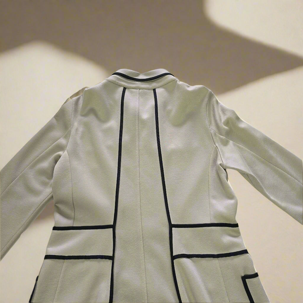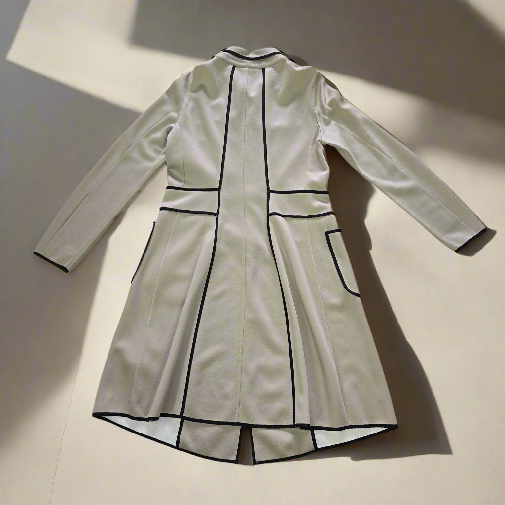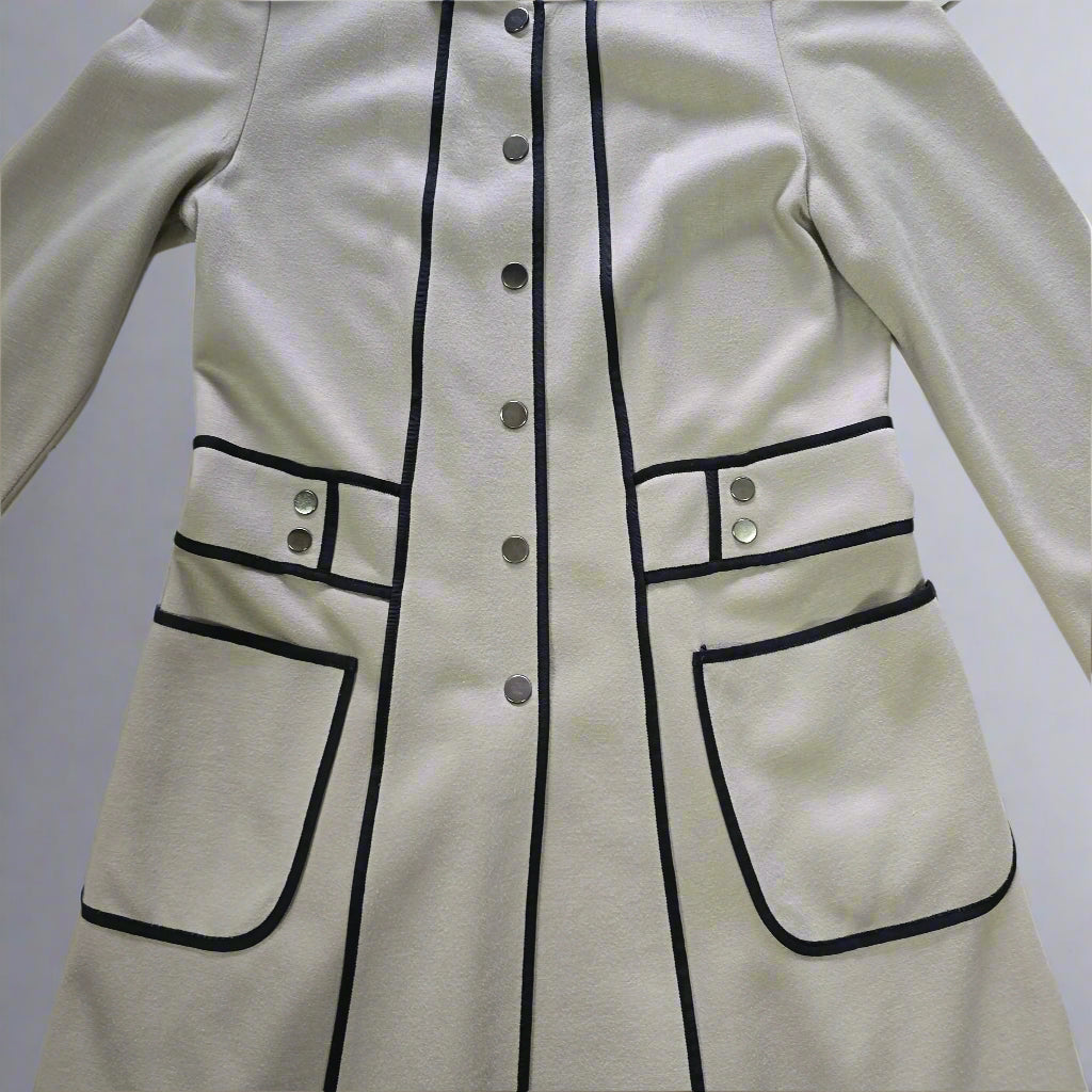 Tailored with precision, this jacket features bold black piping details that define the silhouette and create a flattering shape. The A-line cut, full-length sleeves, and button-down front bring a touch of retro-mod charm, while the oversized patch pockets and decorative button tabs at the waist add a playful, polished finish.