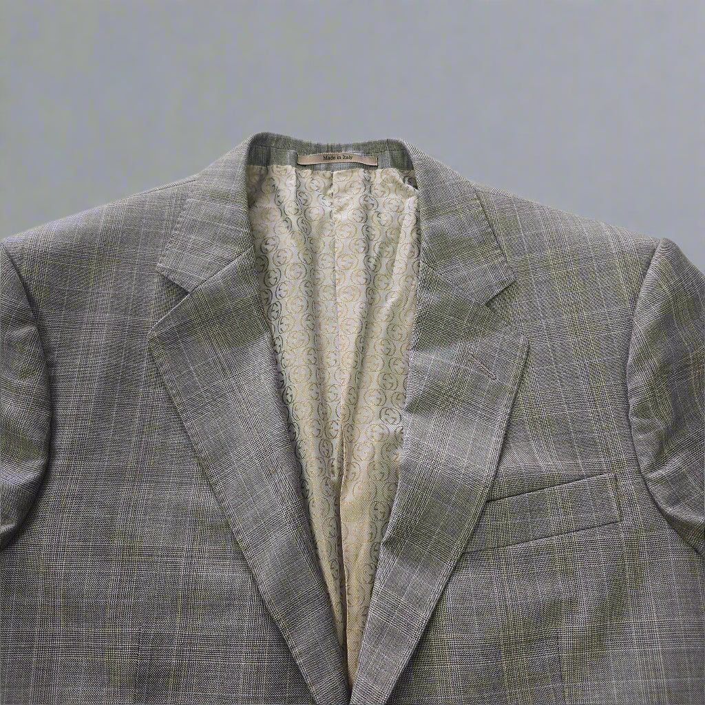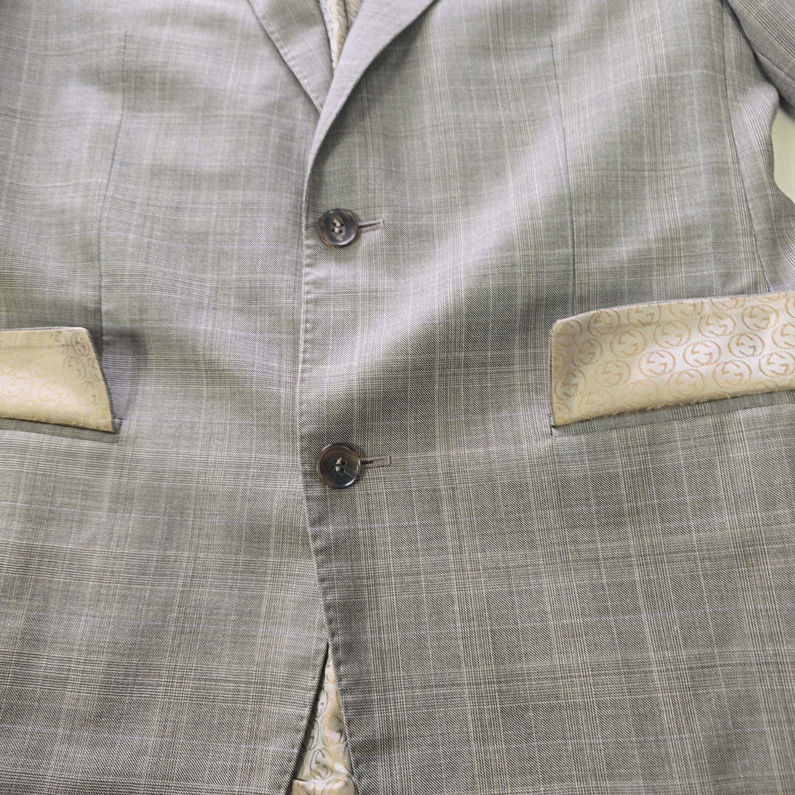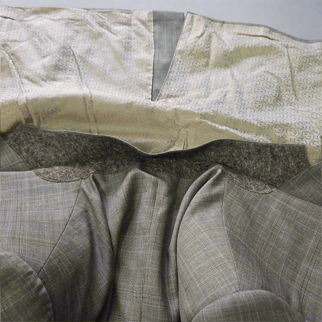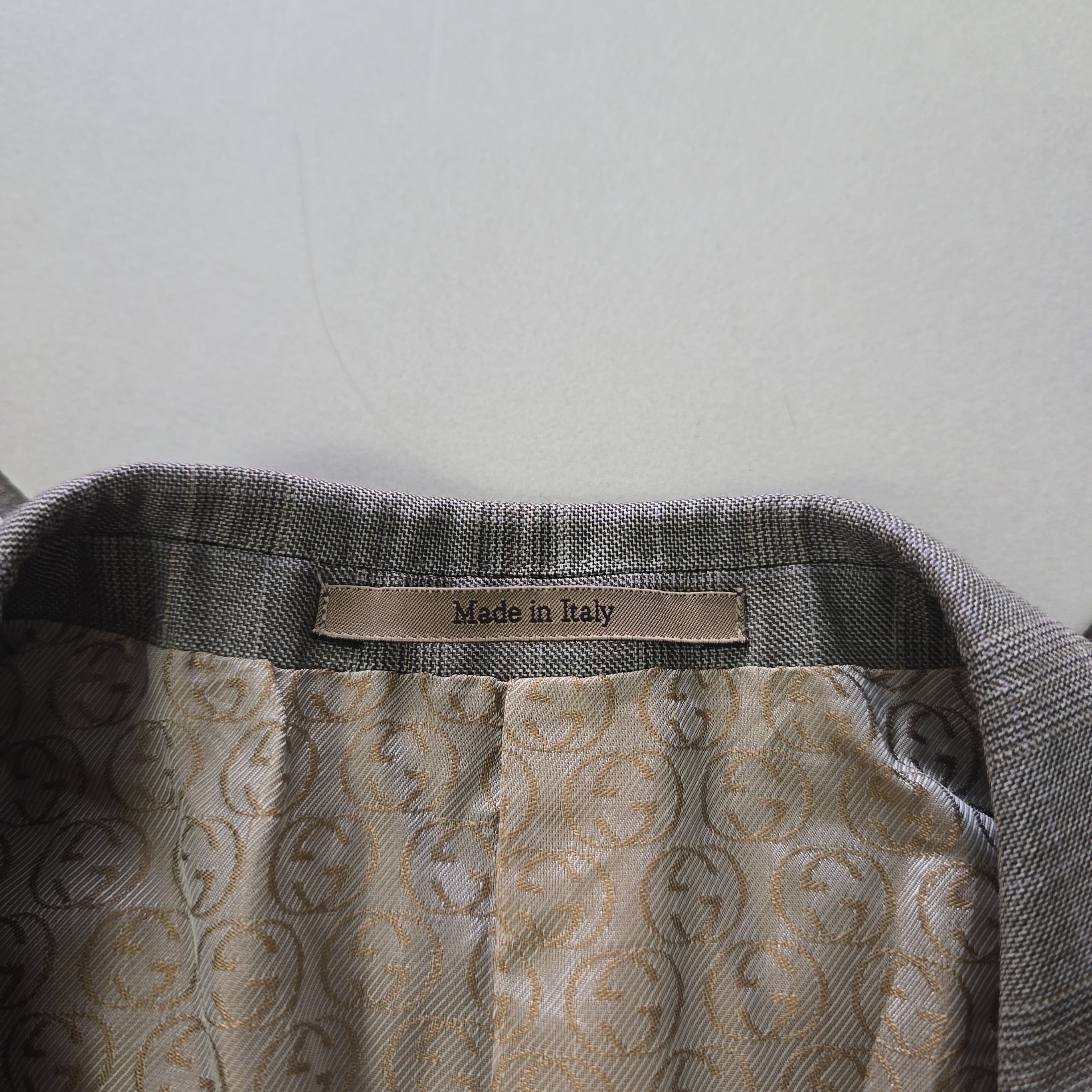 There’s something timeless about a beautifully tailored blazer — especially one that carries quiet details and a story of care. This Gucci jacket in size 46R is crafted from pure wool and lined in an iridescent gold GG monogram that shifts delicately with the light, revealing hints of soft beige. Thoughtfully constructed with subtle shoulder pads, internal and external pockets, and accompanied by replacement buttons, this piece balances precision with understated flair.
