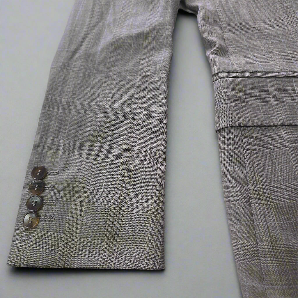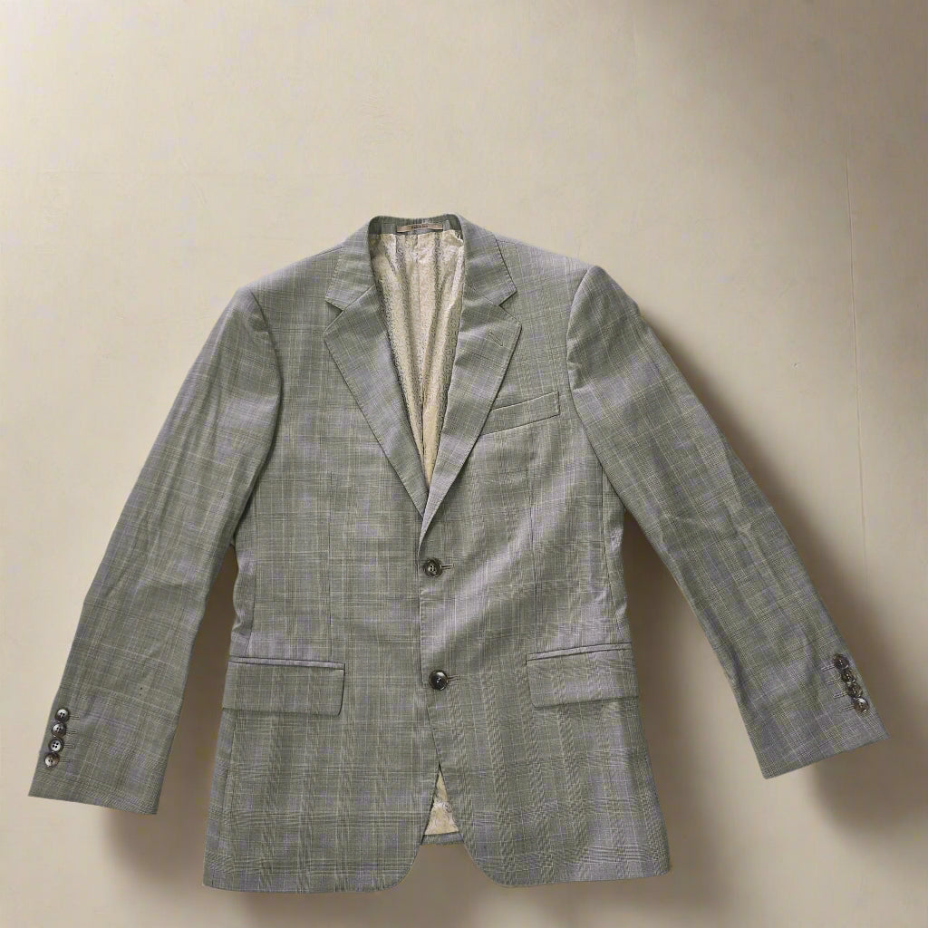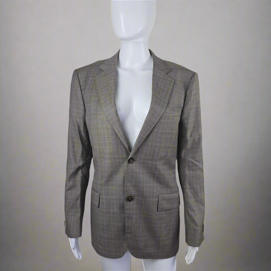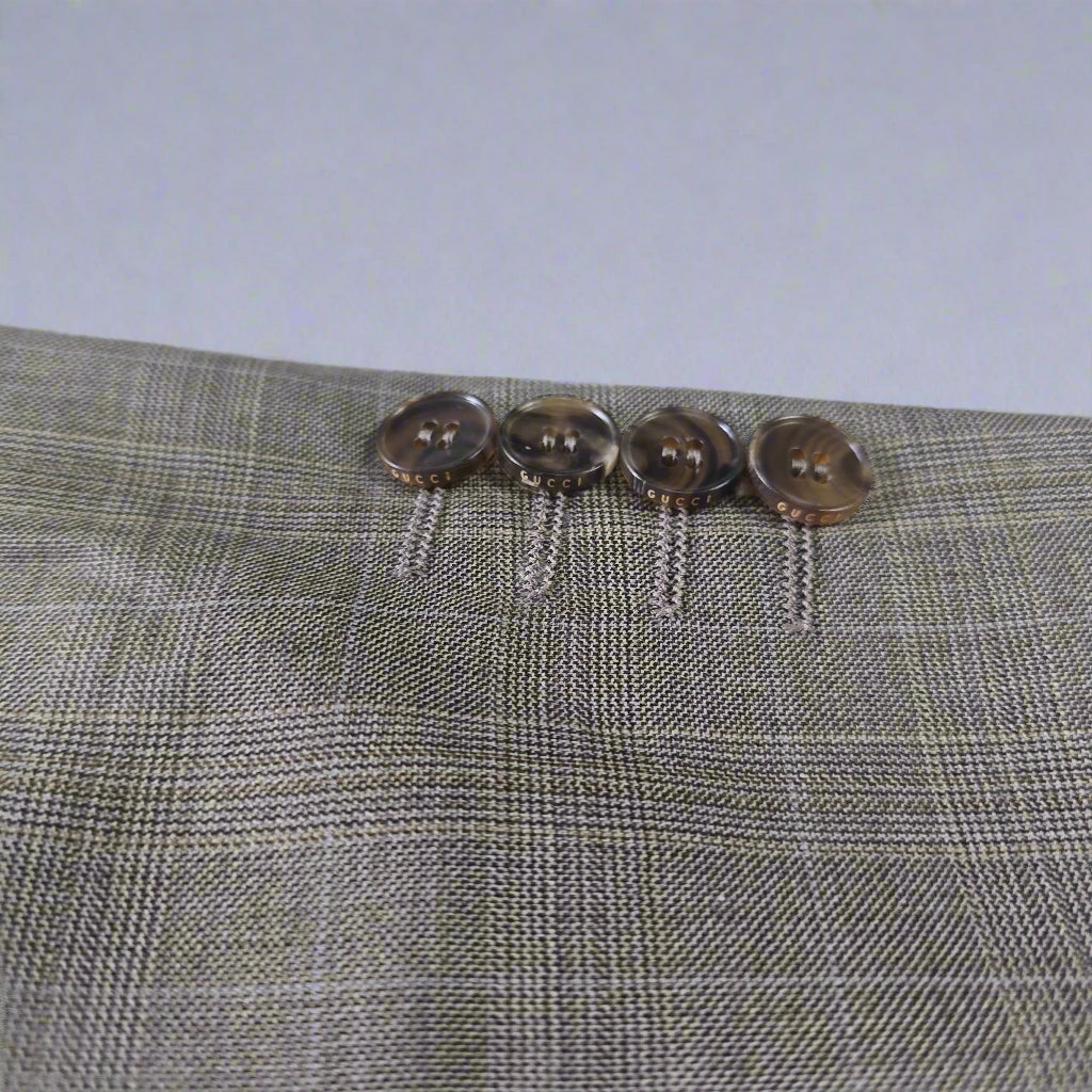 There’s something timeless about a beautifully tailored blazer — especially one that carries quiet details and a story of care. This Gucci jacket in size 46R is crafted from pure wool and lined in an iridescent gold GG monogram that shifts delicately with the light, revealing hints of soft beige. Thoughtfully constructed with subtle shoulder pads, internal and external pockets, and accompanied by replacement buttons, this piece balances precision with understated flair.