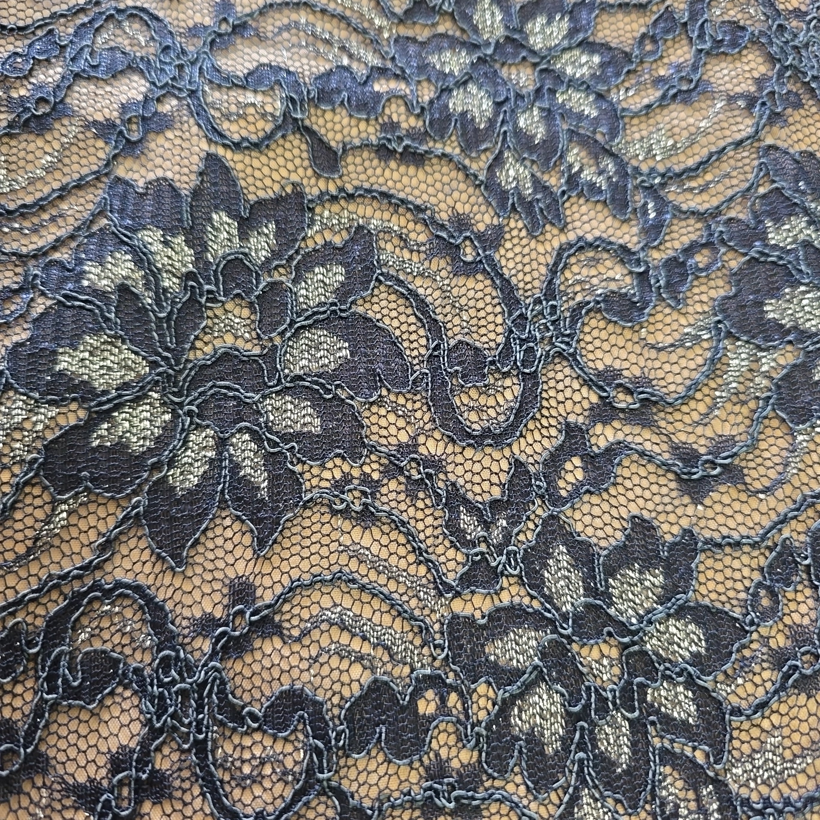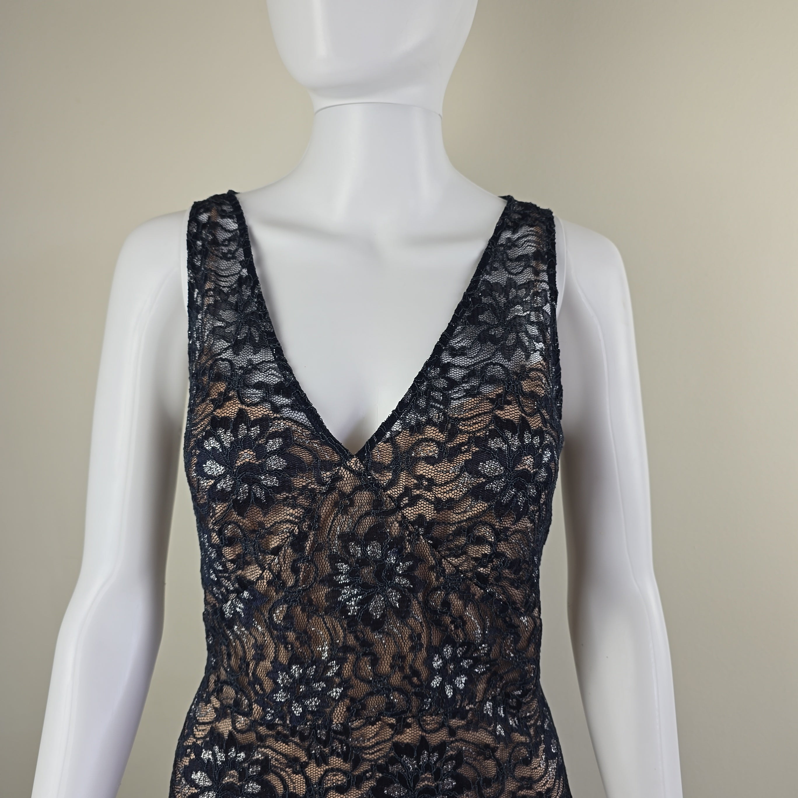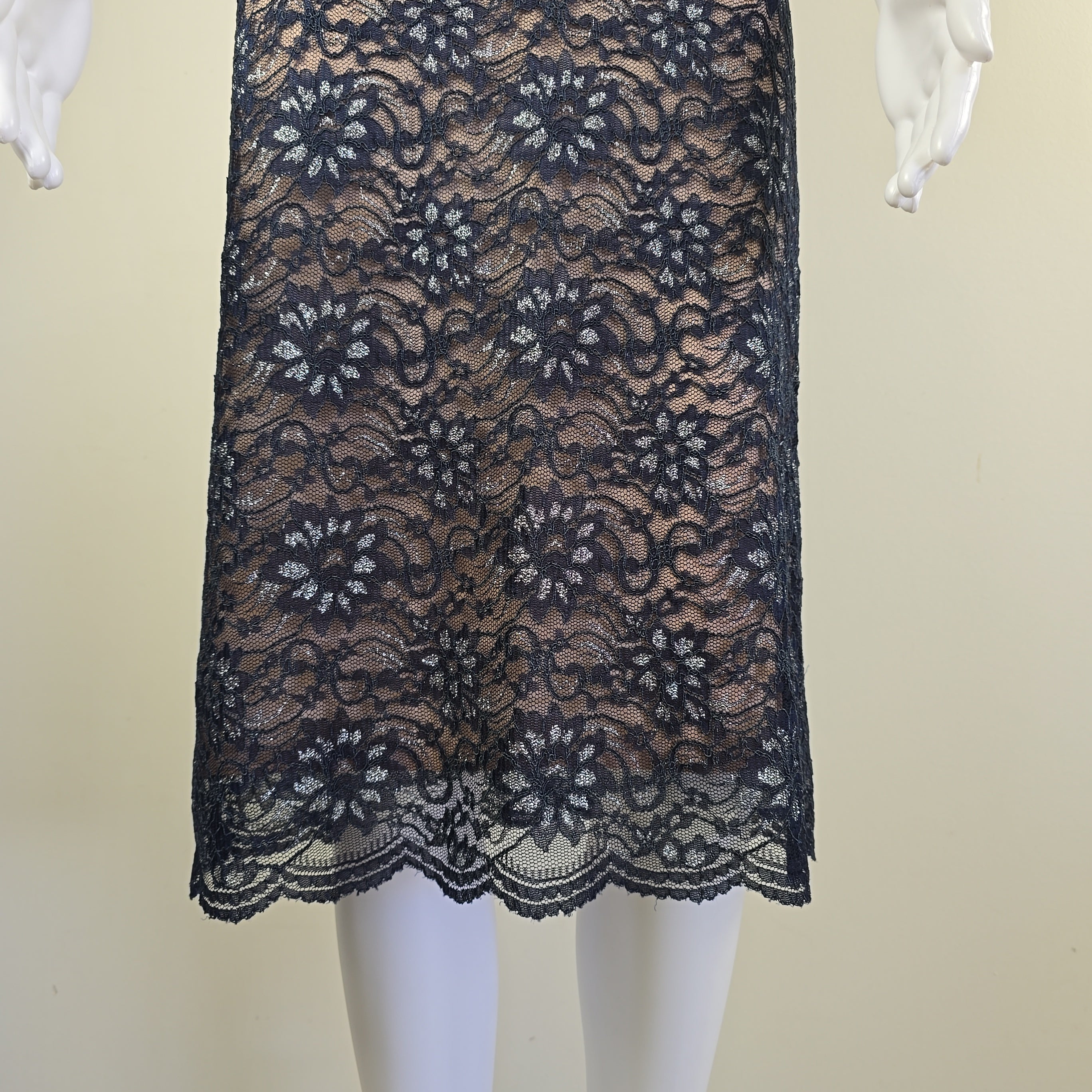 An utterly breathtaking piece that radiates refined glamour, this BCBG Max Azria dress is your go-to for cocktail soirées, elegant dinners, or romantic evenings. Featuring a nude-beige slip underneath and an intricately detailed navy mesh lace overlay, the entire piece shimmers subtly with silver floral accents that catch the light in all the right ways.