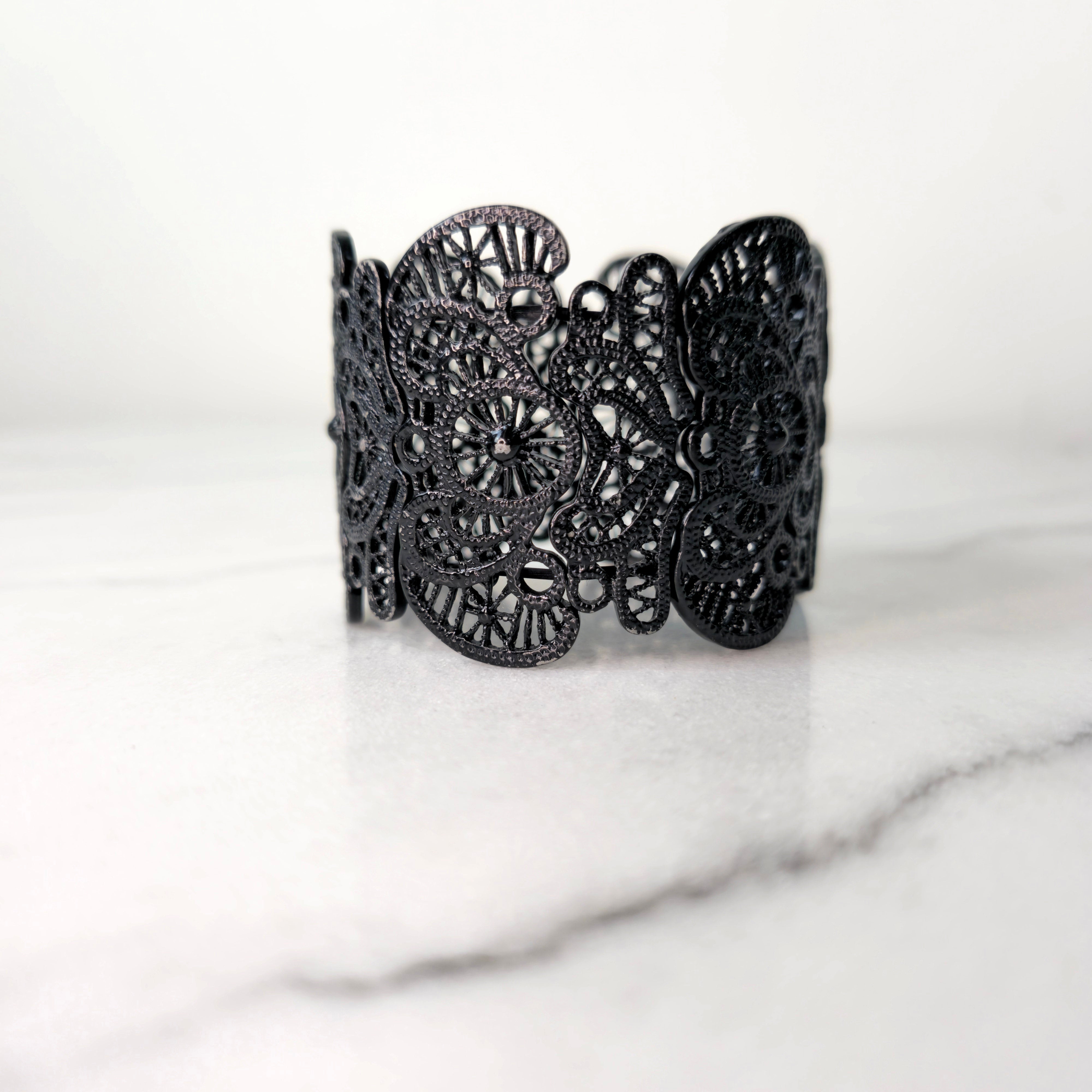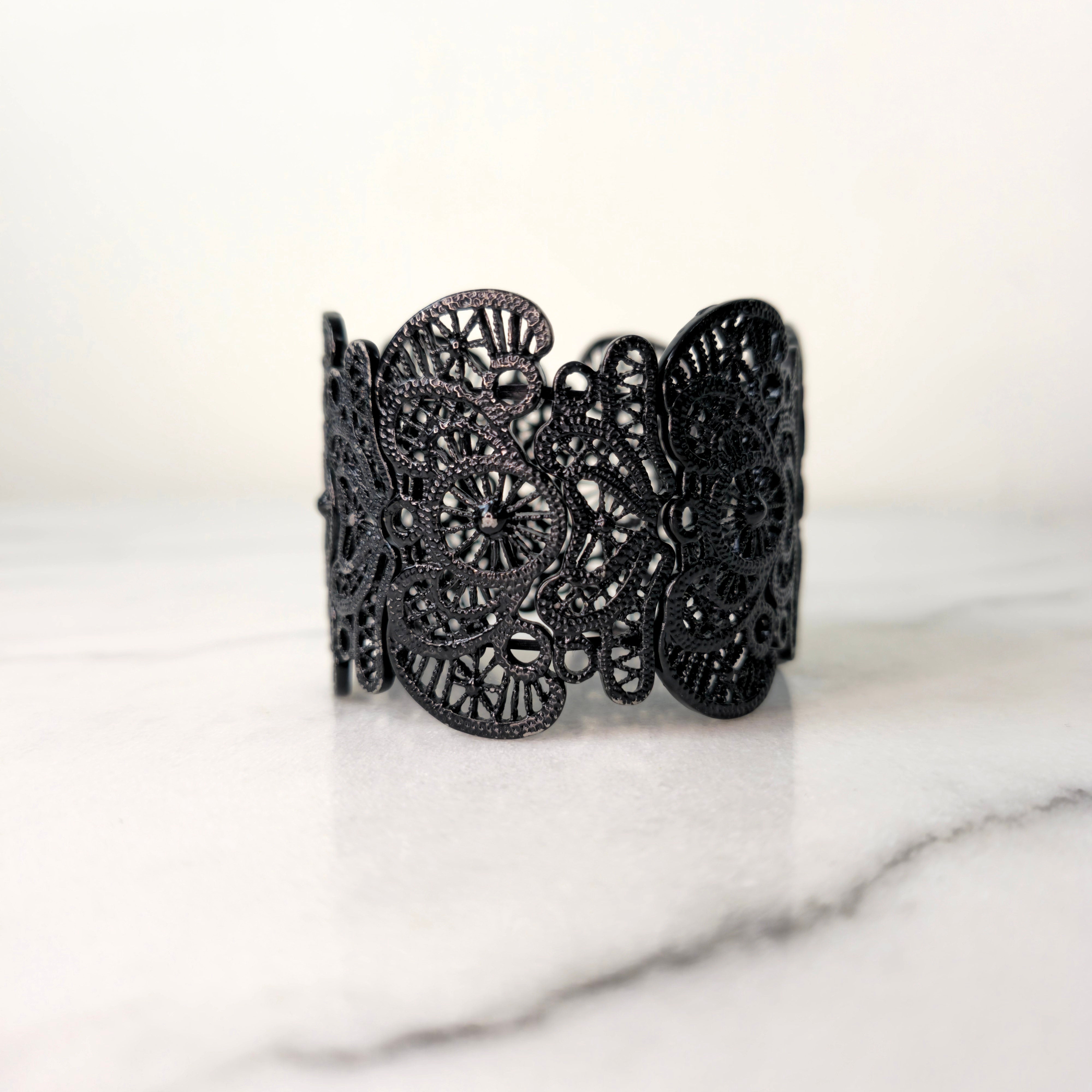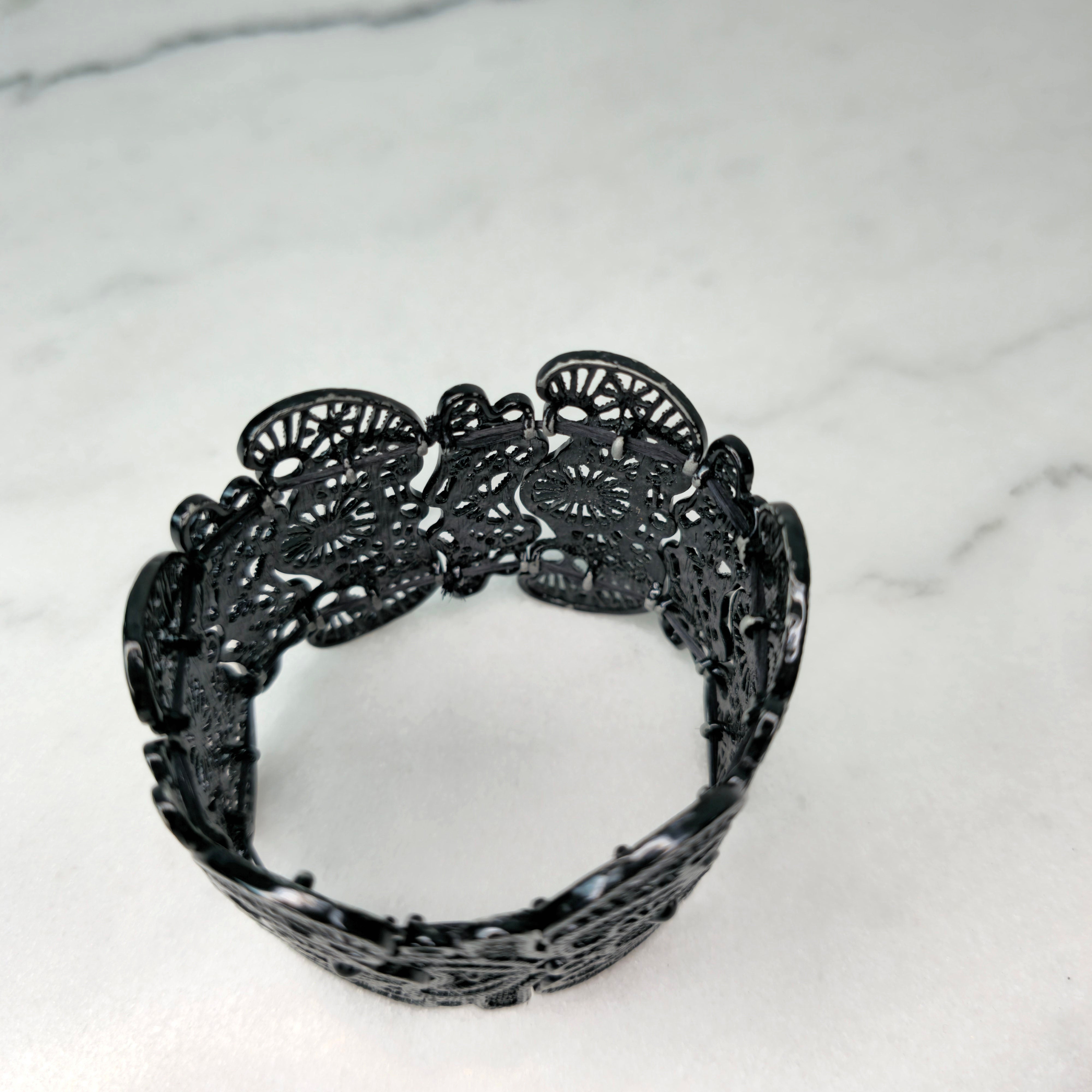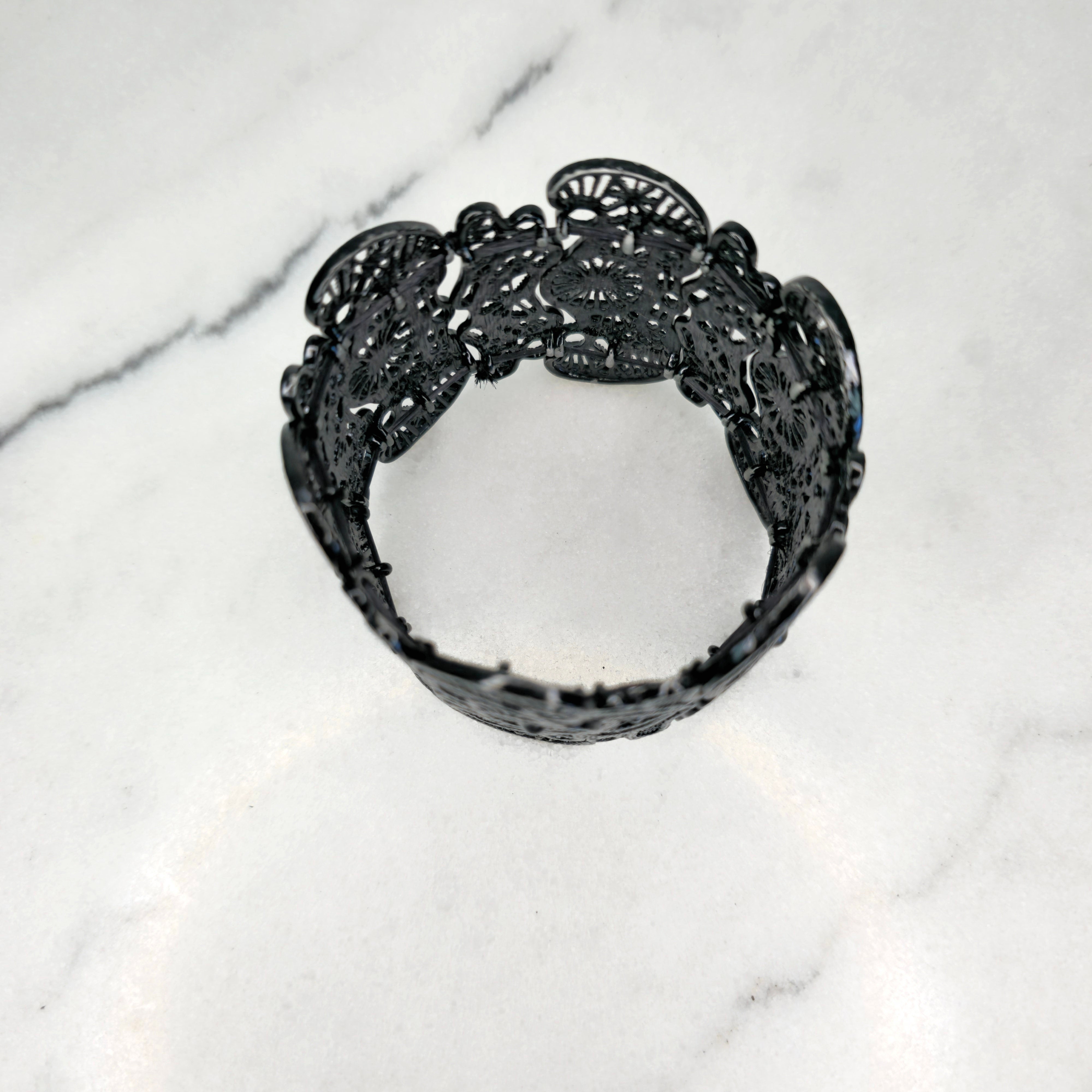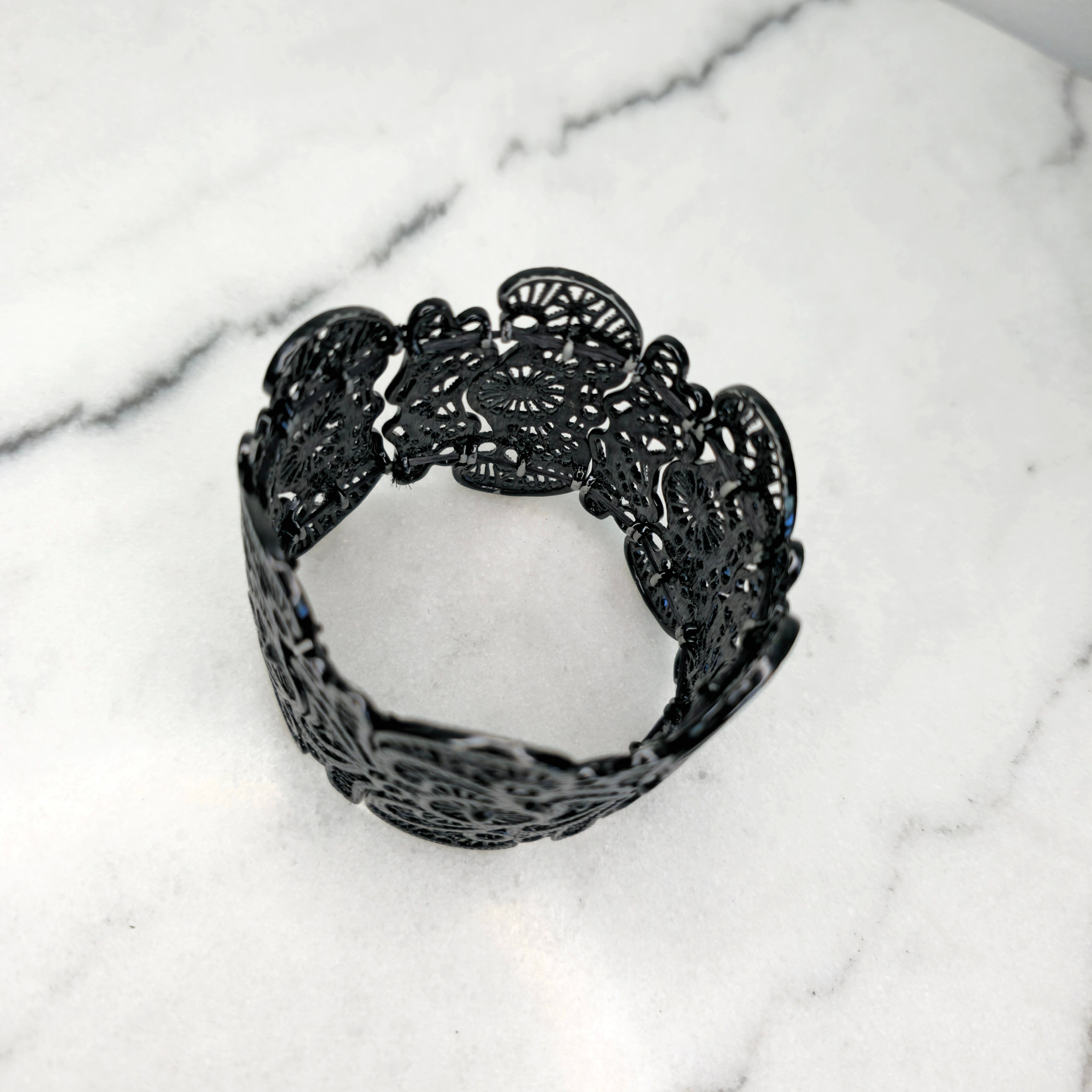 This Black Unsigned Lace Cut Metal Bracelet is a bold and sophisticated accessory, perfect for adding an edgy yet elegant touch to any ensemble. Here’s a detailed description of this stunning piece: