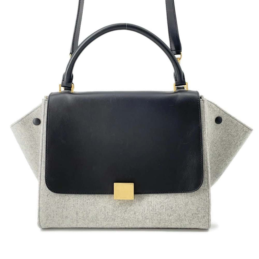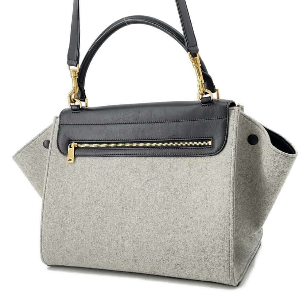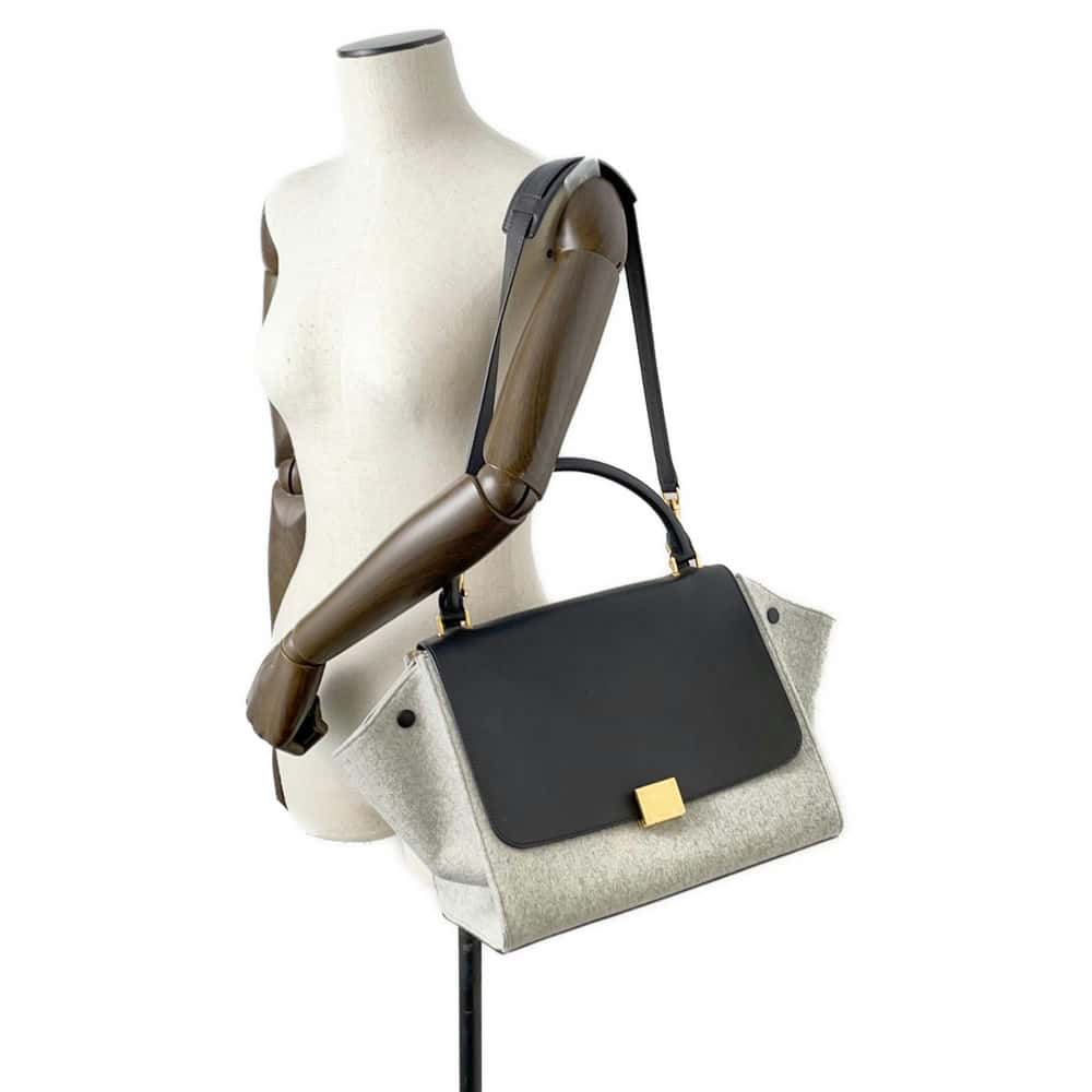 The Celine Trapeze Wool Handbag is a masterpiece of luxury and style. Crafted from high-quality wool and leather, this structured handbag features the signature trapeze shape, making it both stylish and functional. The sleek design is accented with gold hardware, and the spacious interior is perfect for carrying all your essentials with ease. This bag is a true statement piece for any wardrobe.
