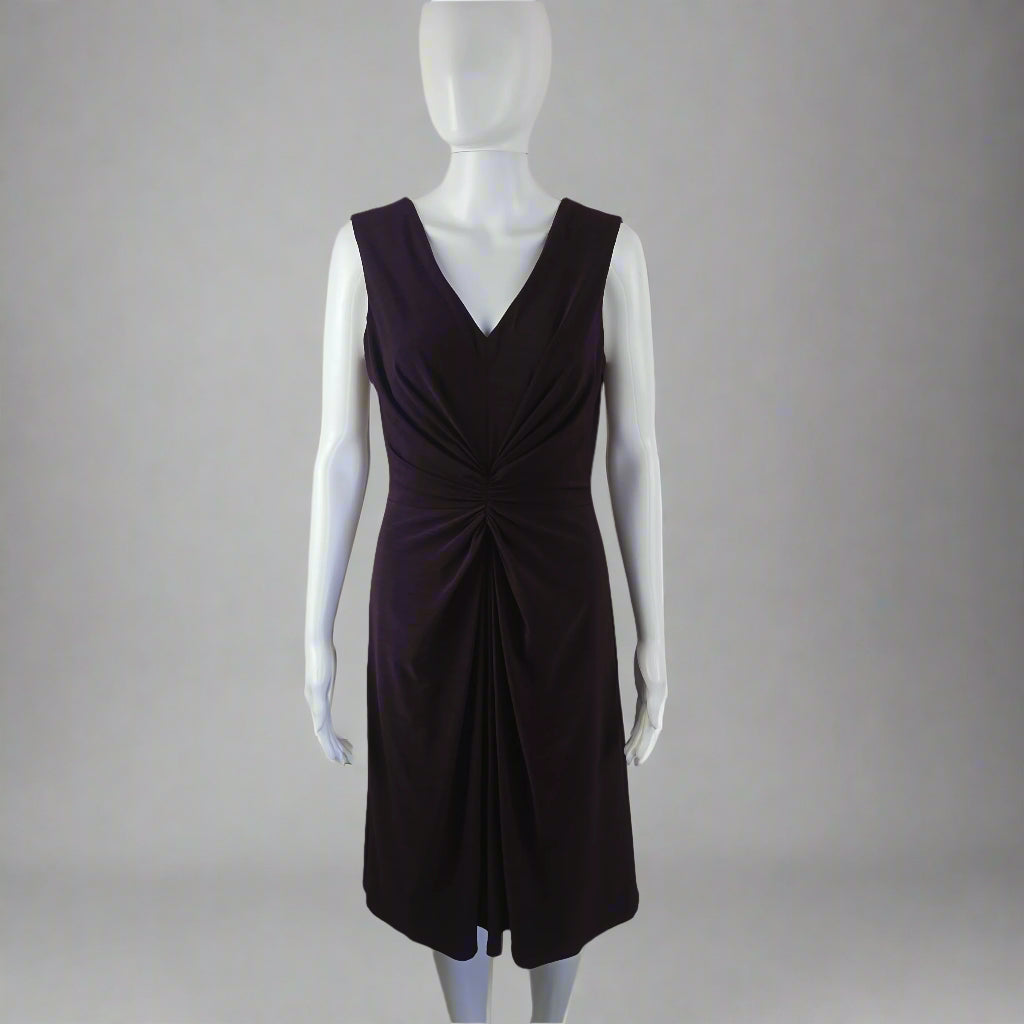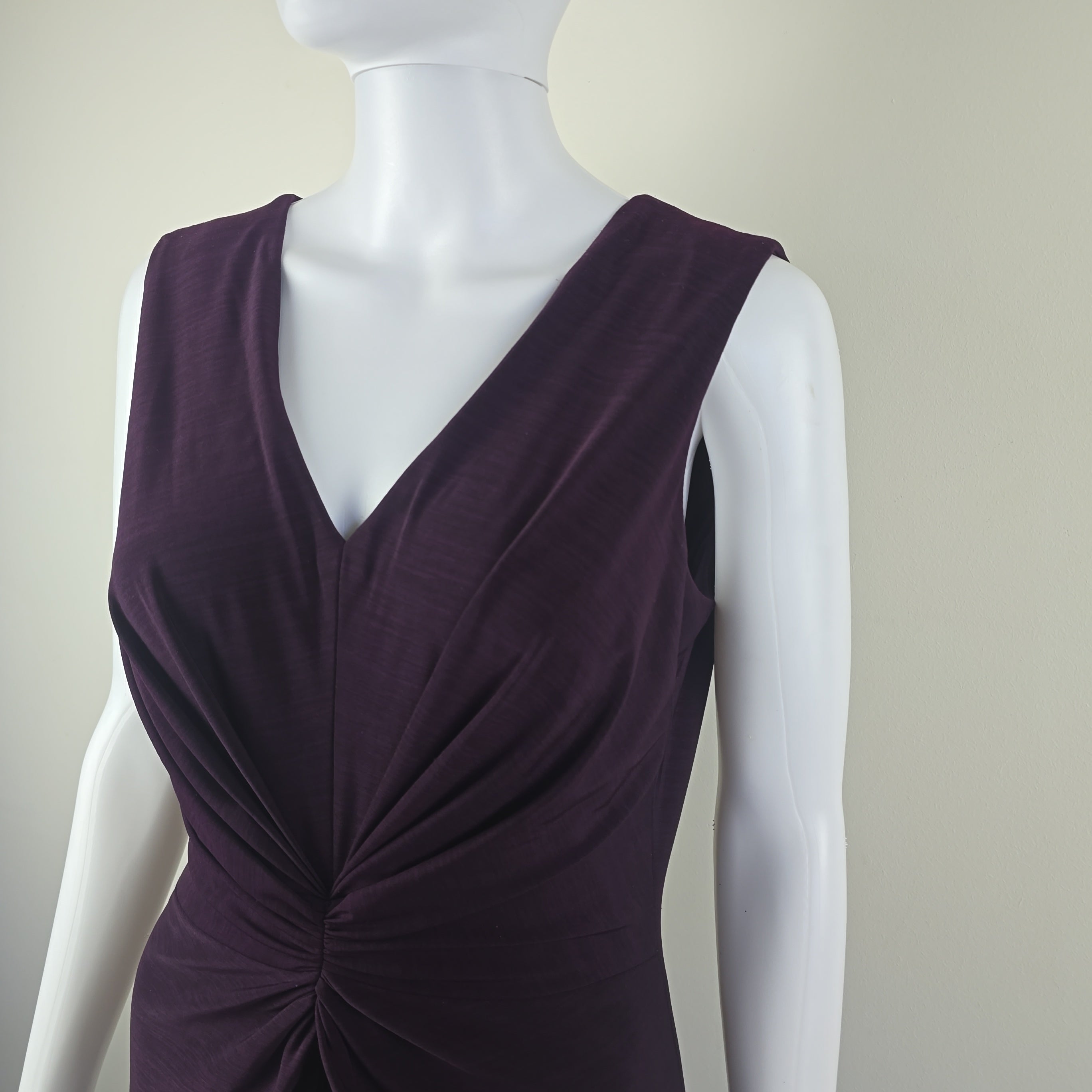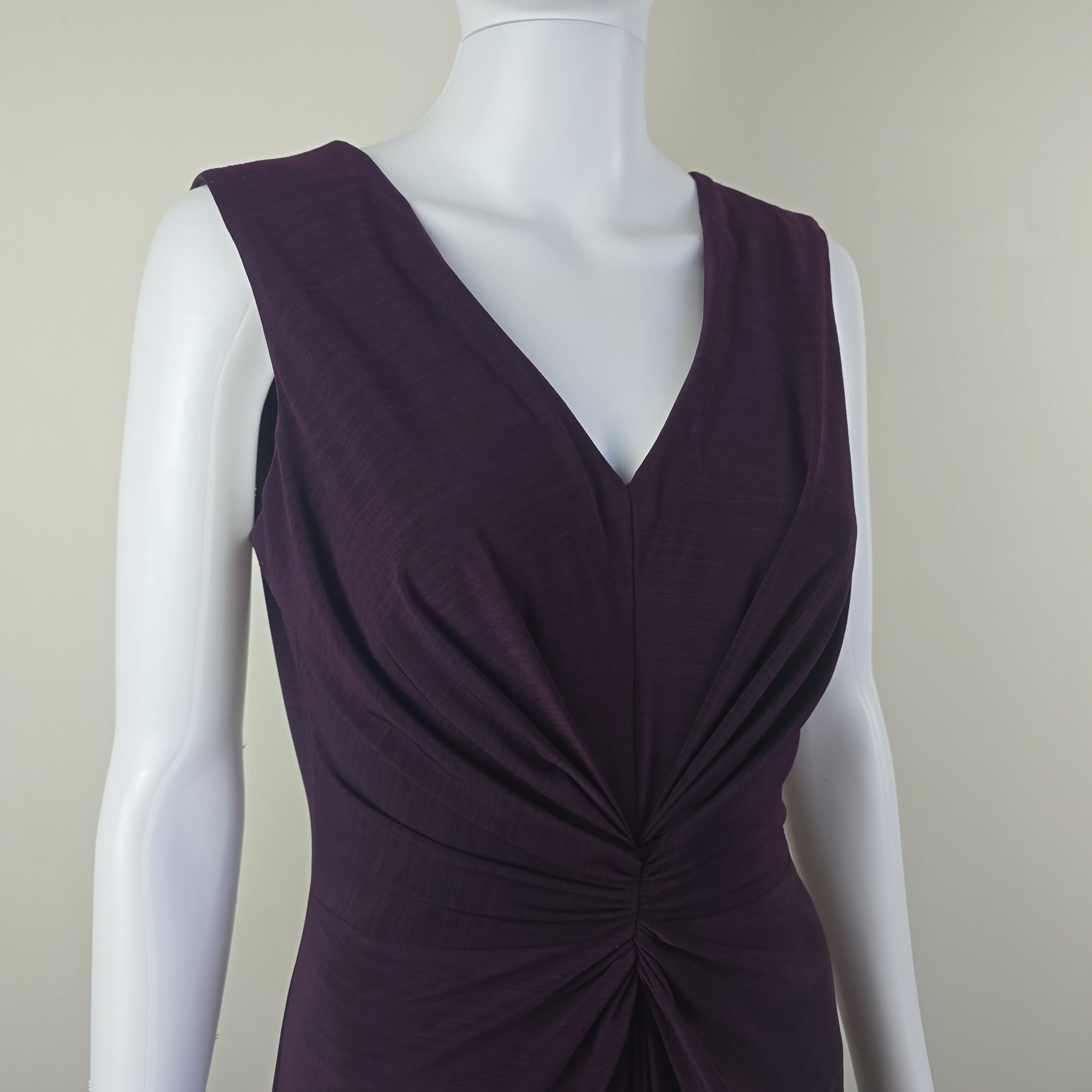 This sleeveless style features a deep V-neckline and elegant central gathering that draws the eye inward and flatters the waist. The maroon silk-blend fabric offers both a rich visual depth and just enough stretch to keep you comfortable while still feeling polished. The dress closes with a concealed back zipper, adding to the sleek, no-fuss look.