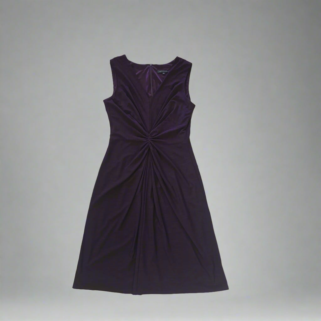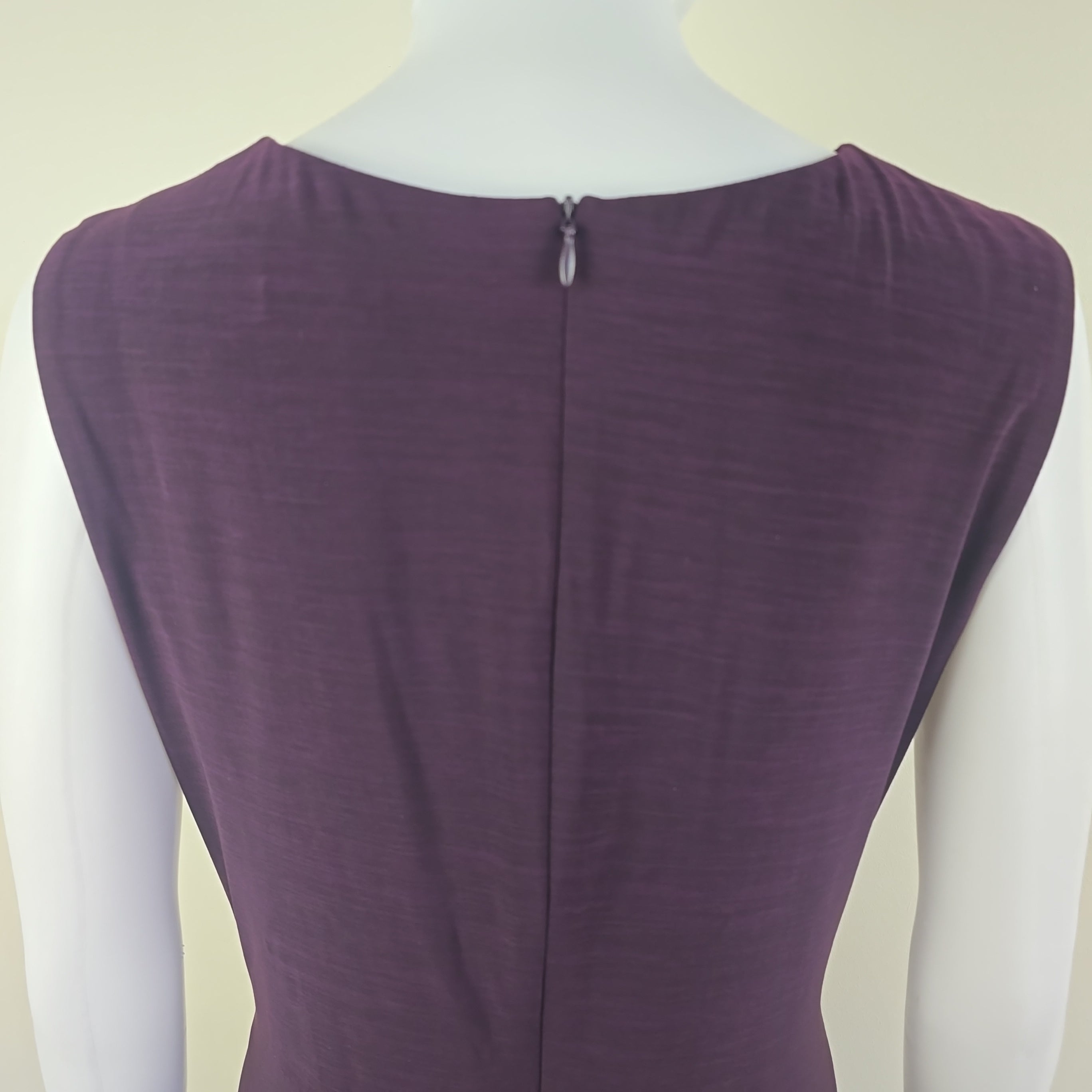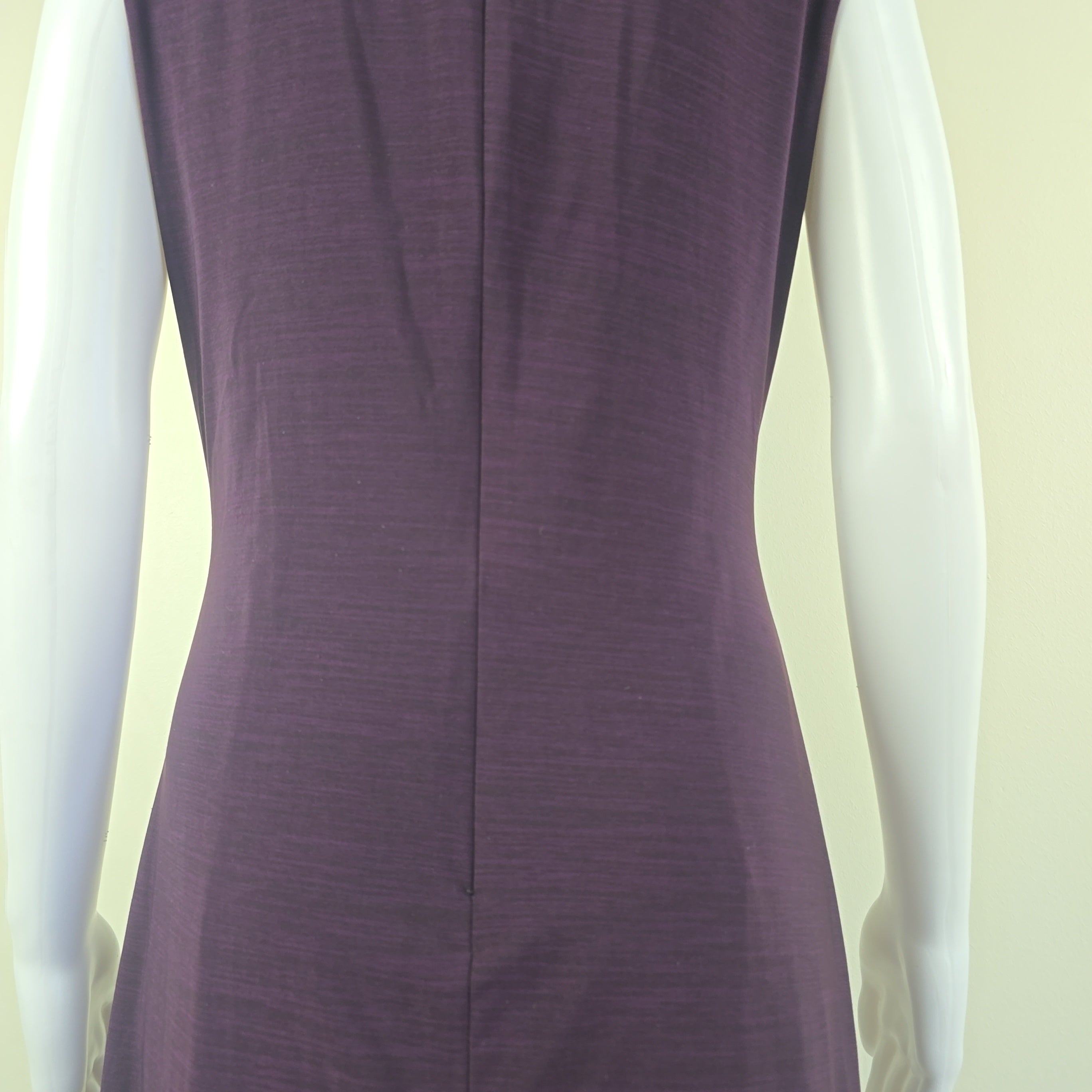 This sleeveless style features a deep V-neckline and elegant central gathering that draws the eye inward and flatters the waist. The maroon silk-blend fabric offers both a rich visual depth and just enough stretch to keep you comfortable while still feeling polished. The dress closes with a concealed back zipper, adding to the sleek, no-fuss look.