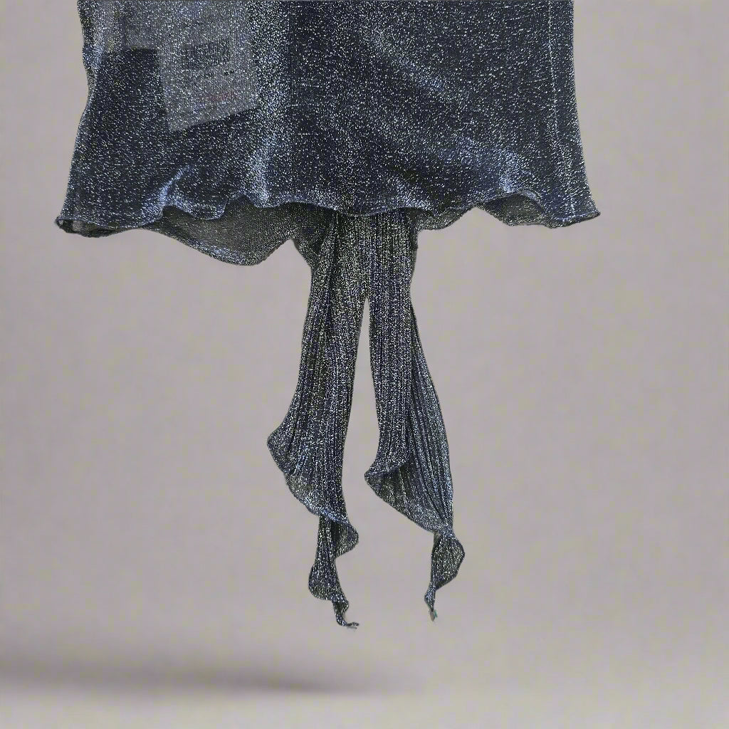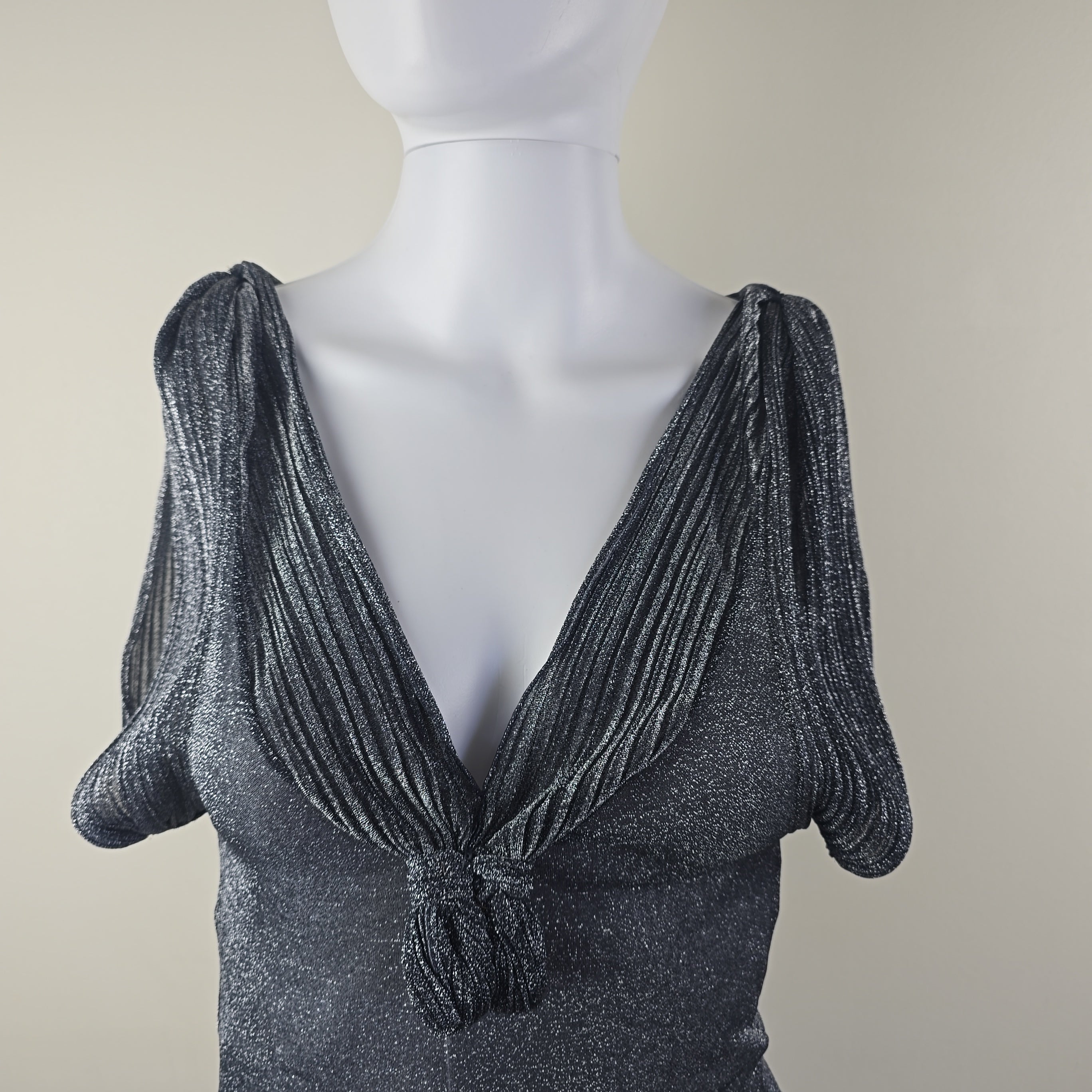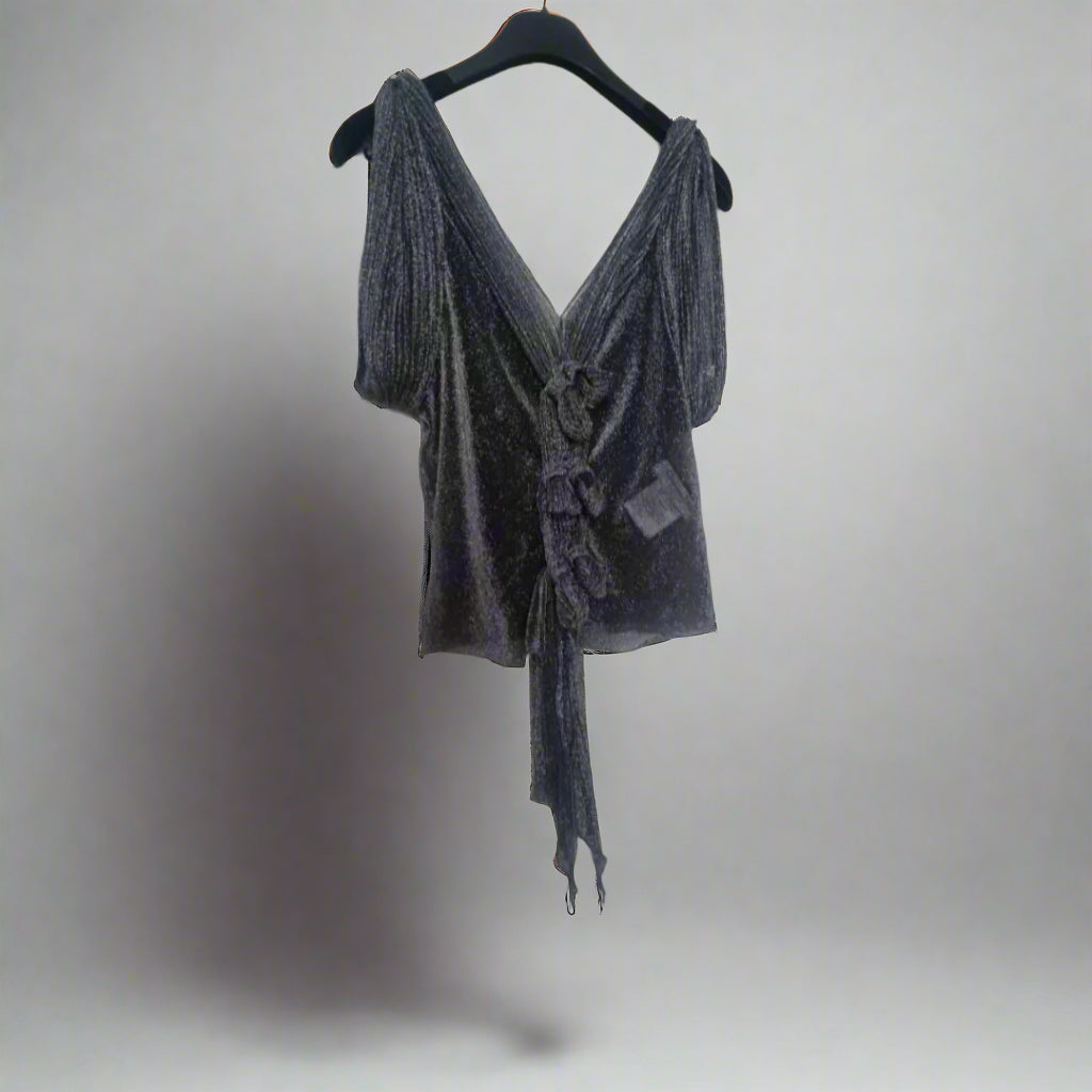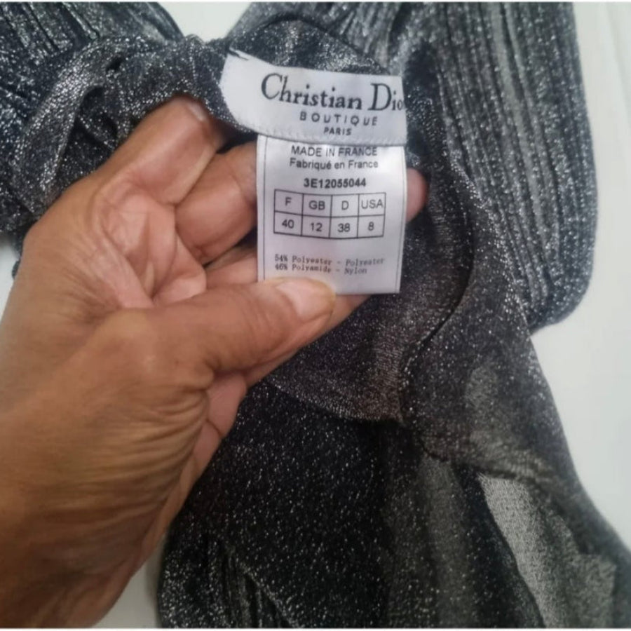 Step into the spotlight with this exquisite Dior Silver Evening Top – a dazzling, designer statement piece perfect for nights out, special occasions, or elegant soirées. Crafted with a metallic silver shimmer, this stretch-fit top drapes beautifully across the body, offering both comfort and glamour in one timeless silhouette.