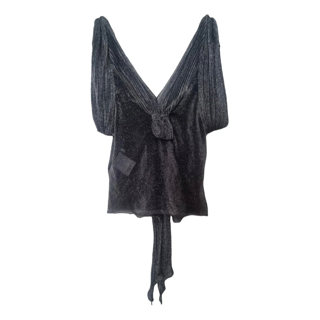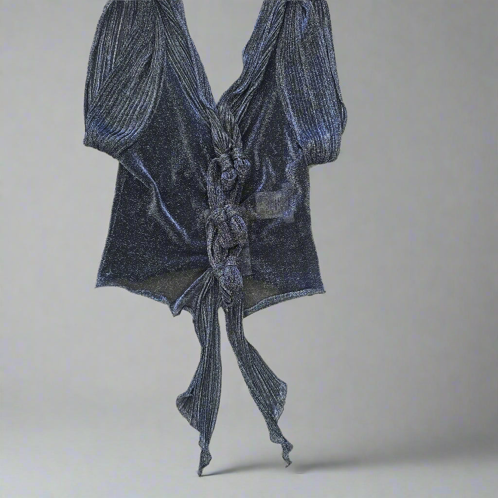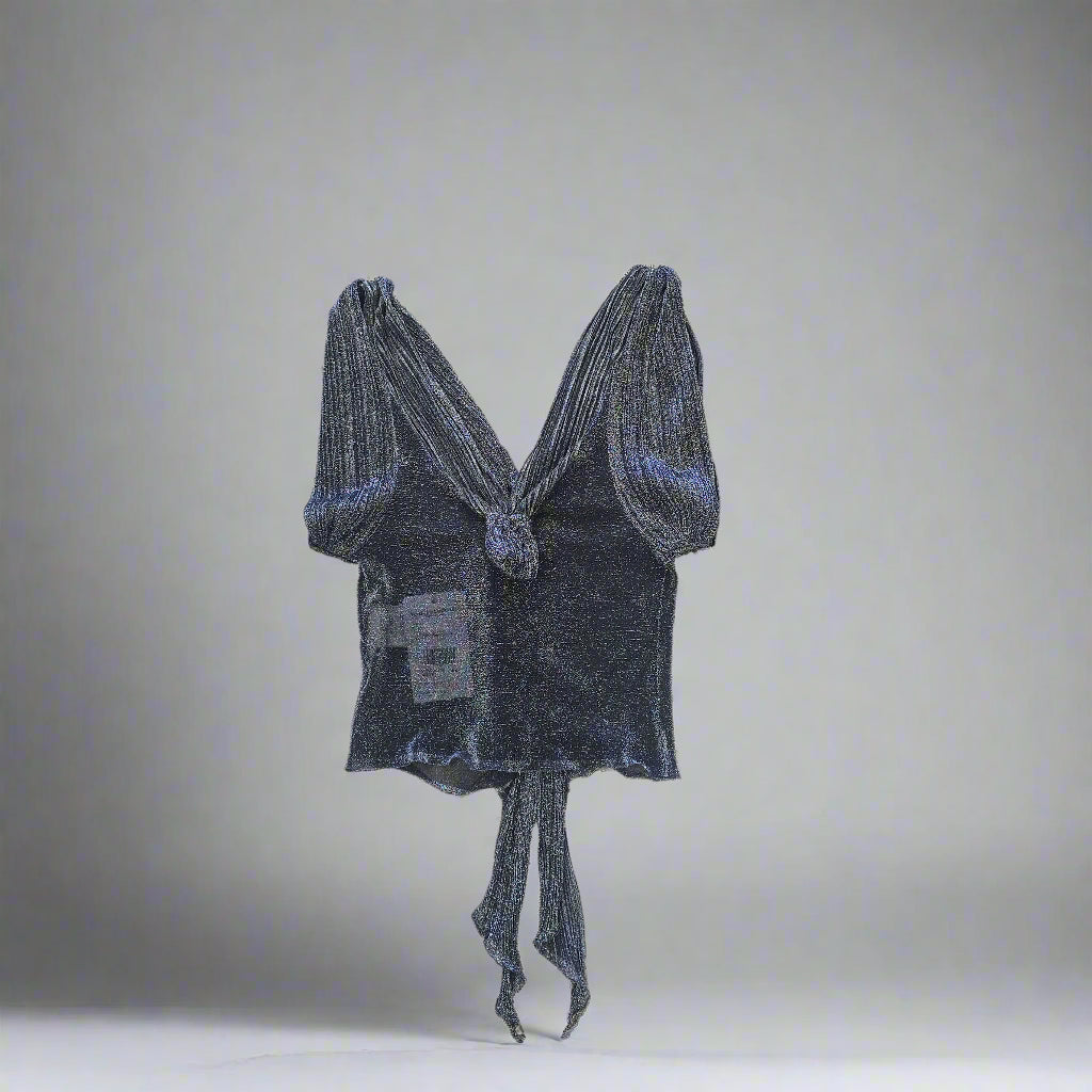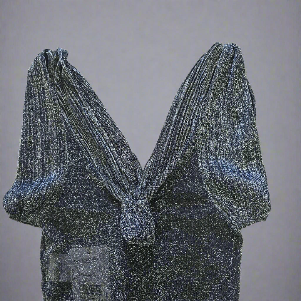 Featuring an alluring deep V neckline, ruched shoulder pleats, and sculptural bows adorning both front and back, this top is designed to turn heads from every angle. The longer central sash detail adds a dramatic finish and flattering vertical line.