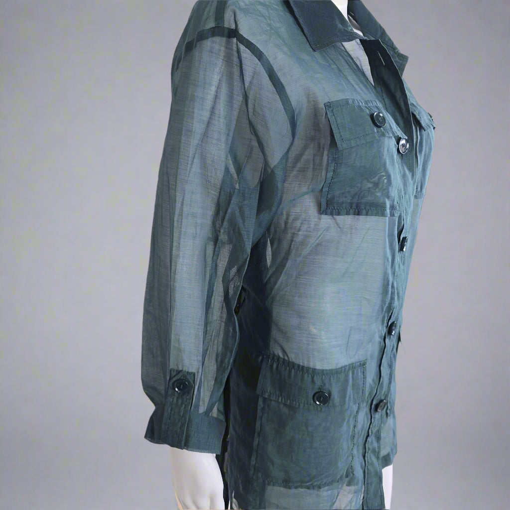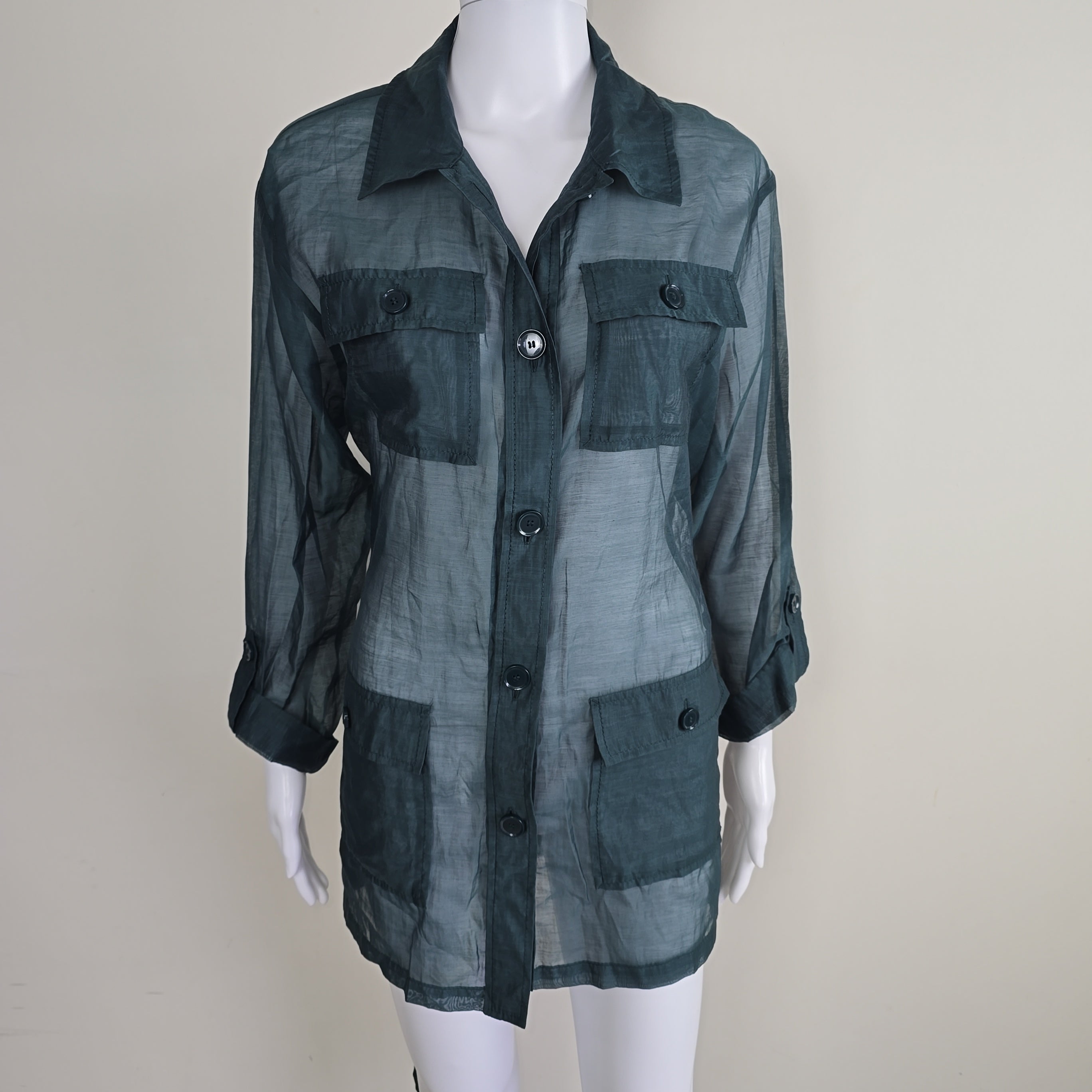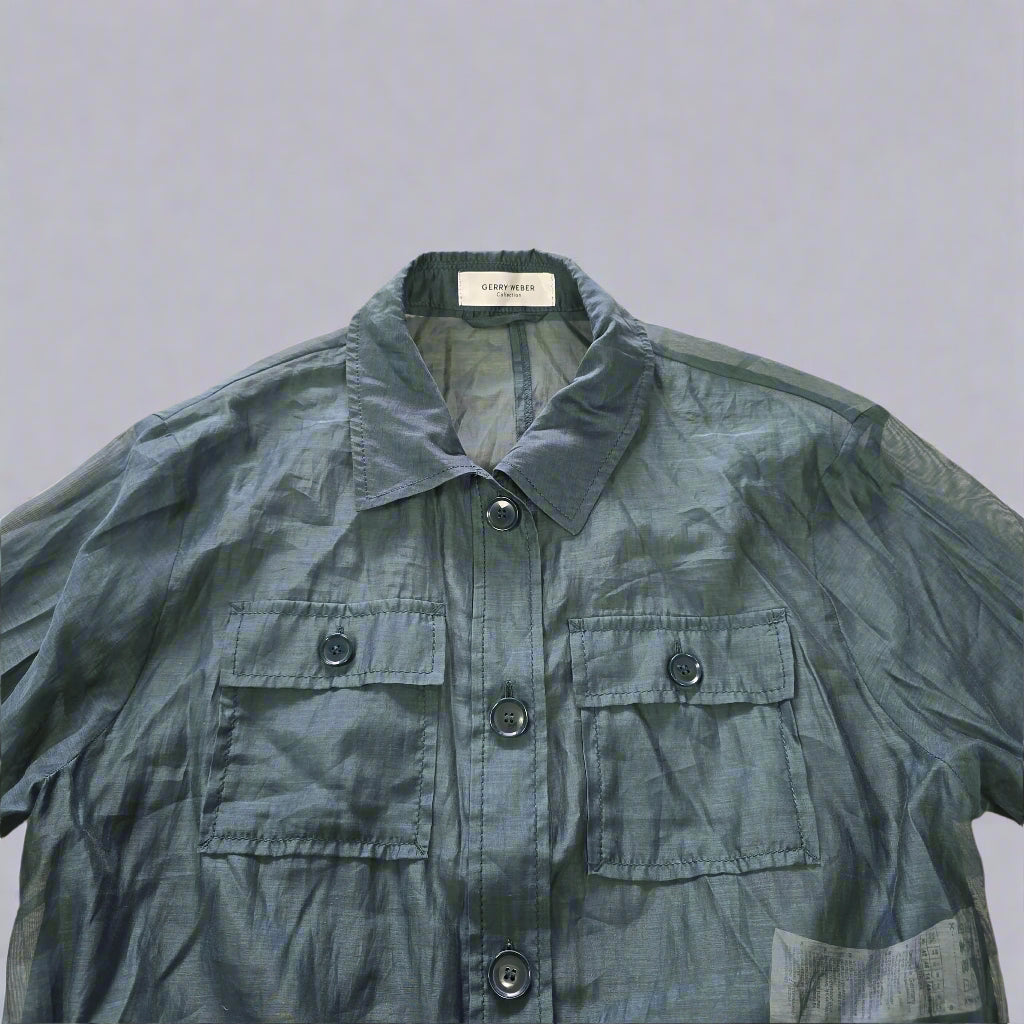 Say hello to your new layering essential. This sheer green shirt from Gerry Weber combines utility with elegance—crafted in a lightweight, subtly shimmering fabric that catches the light in all the right ways. Featuring four patch pockets, a tie waist for shape, and roll-tab sleeves for styling versatility, it’s the piece that does it all.
