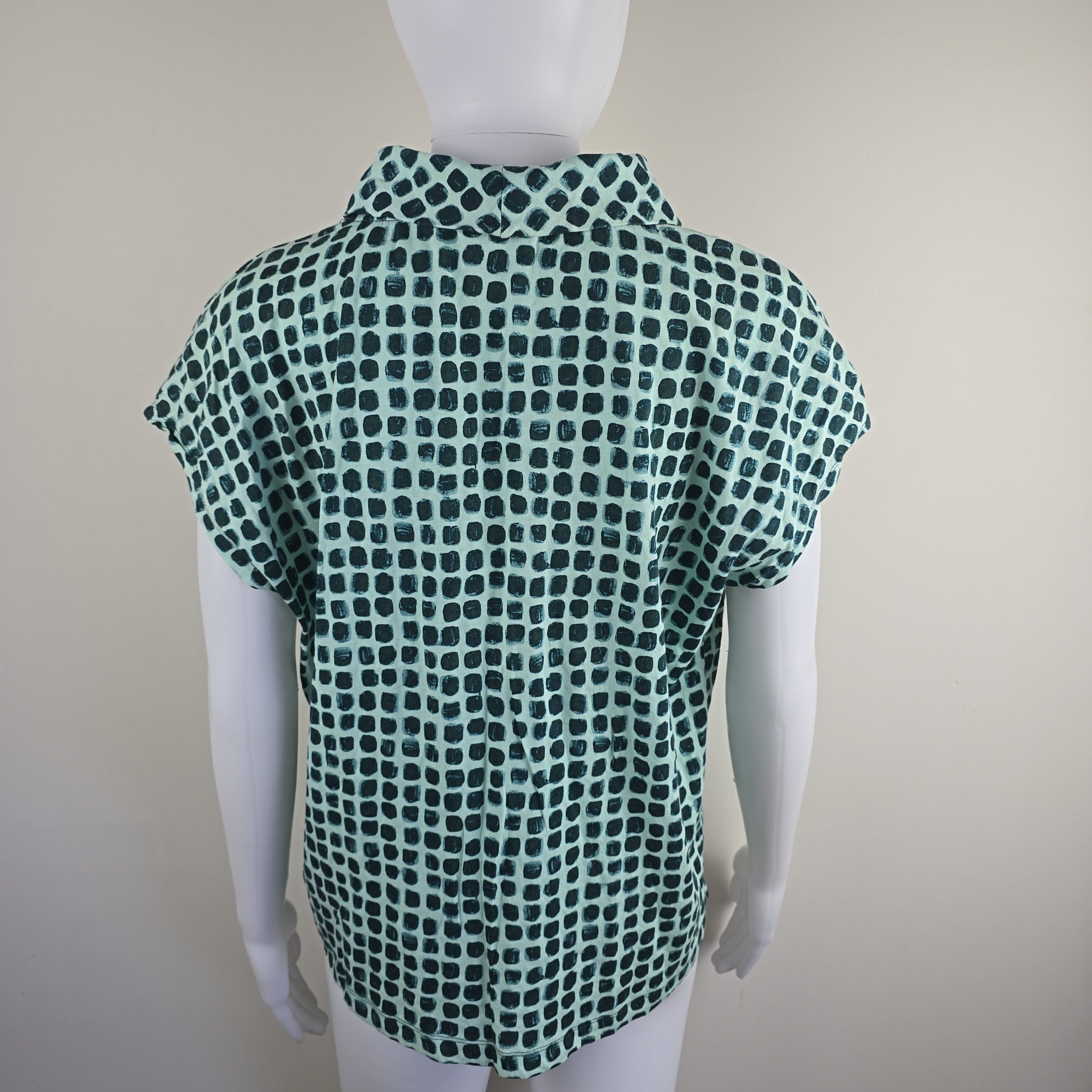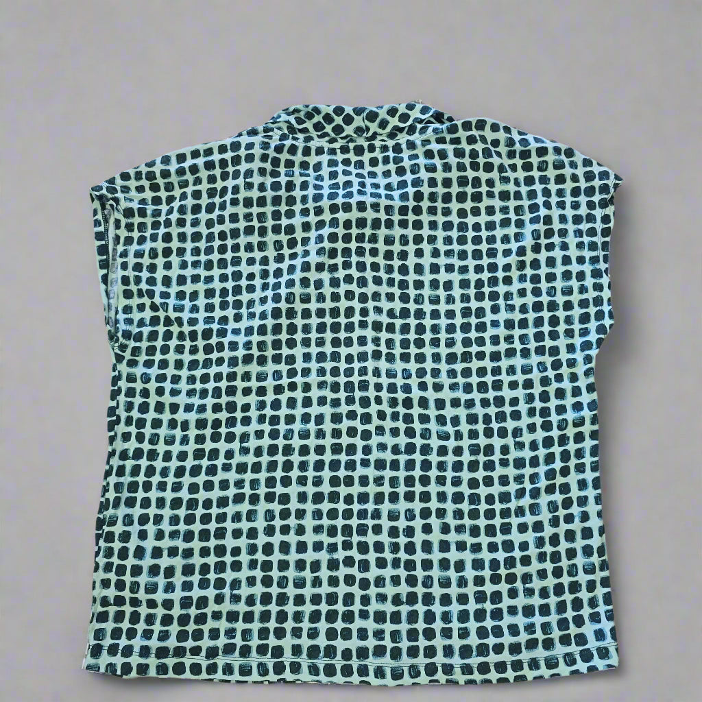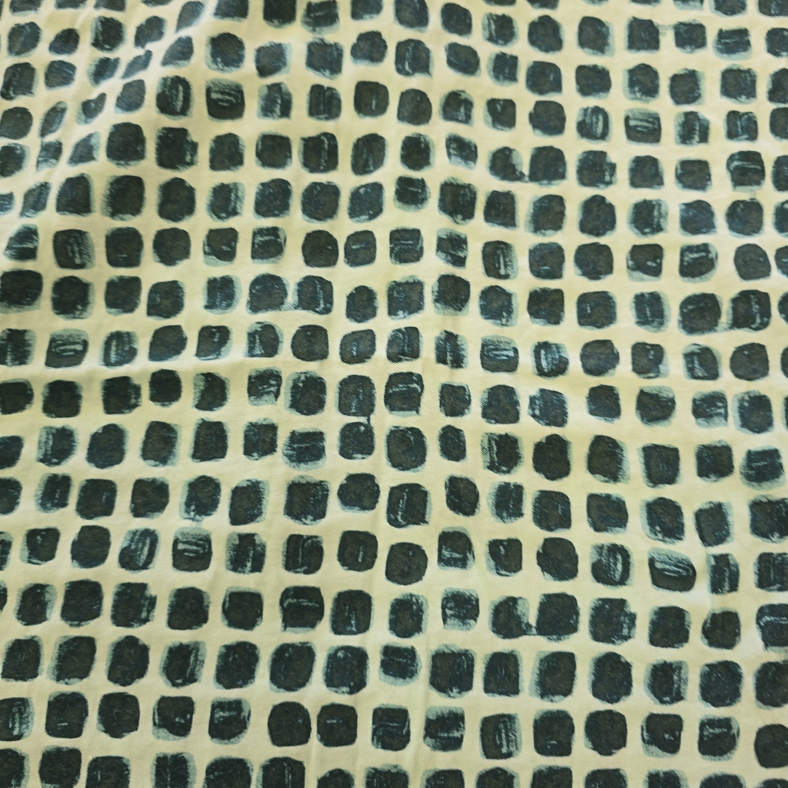 Print: Eye-catching green base with an artistic abstract grid-style print in black