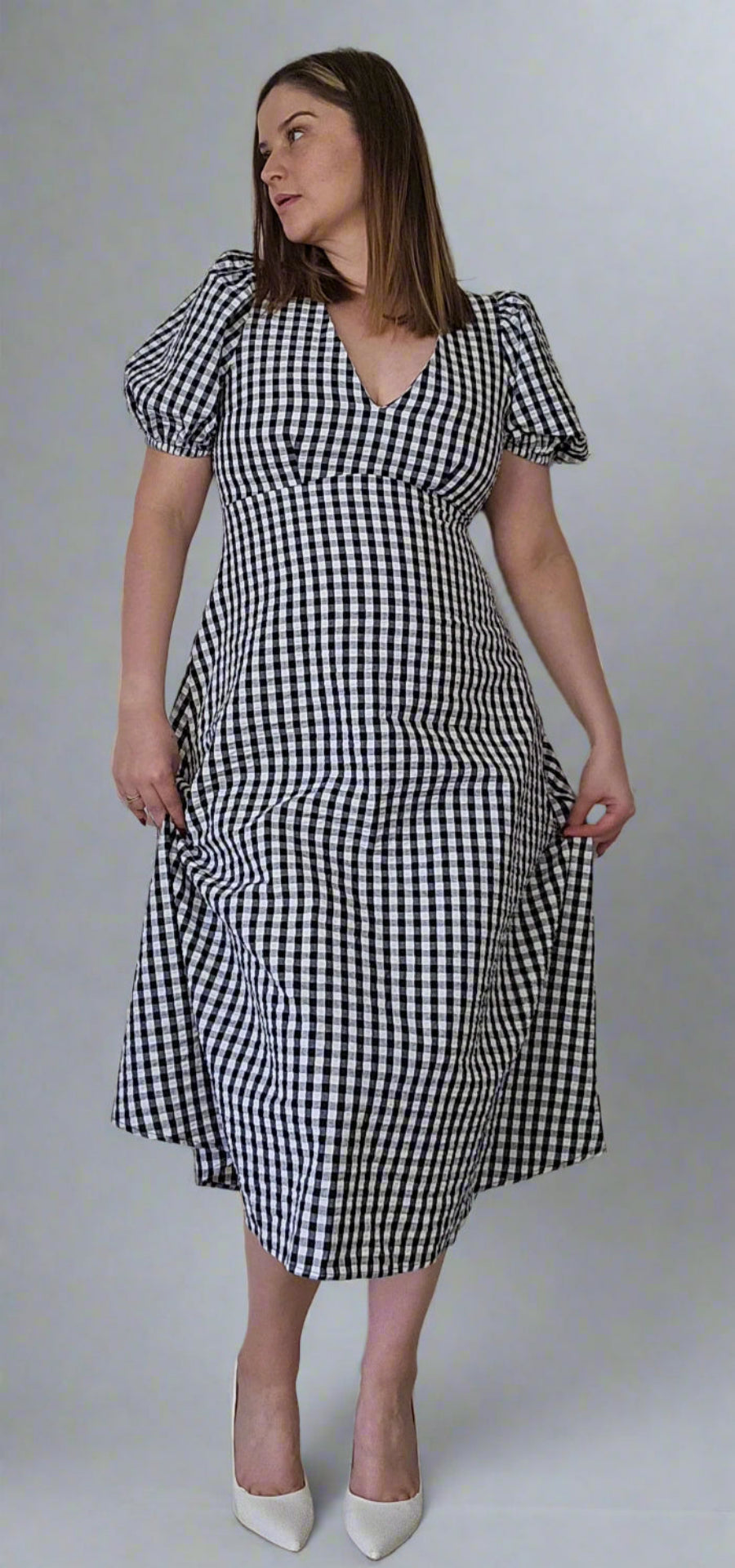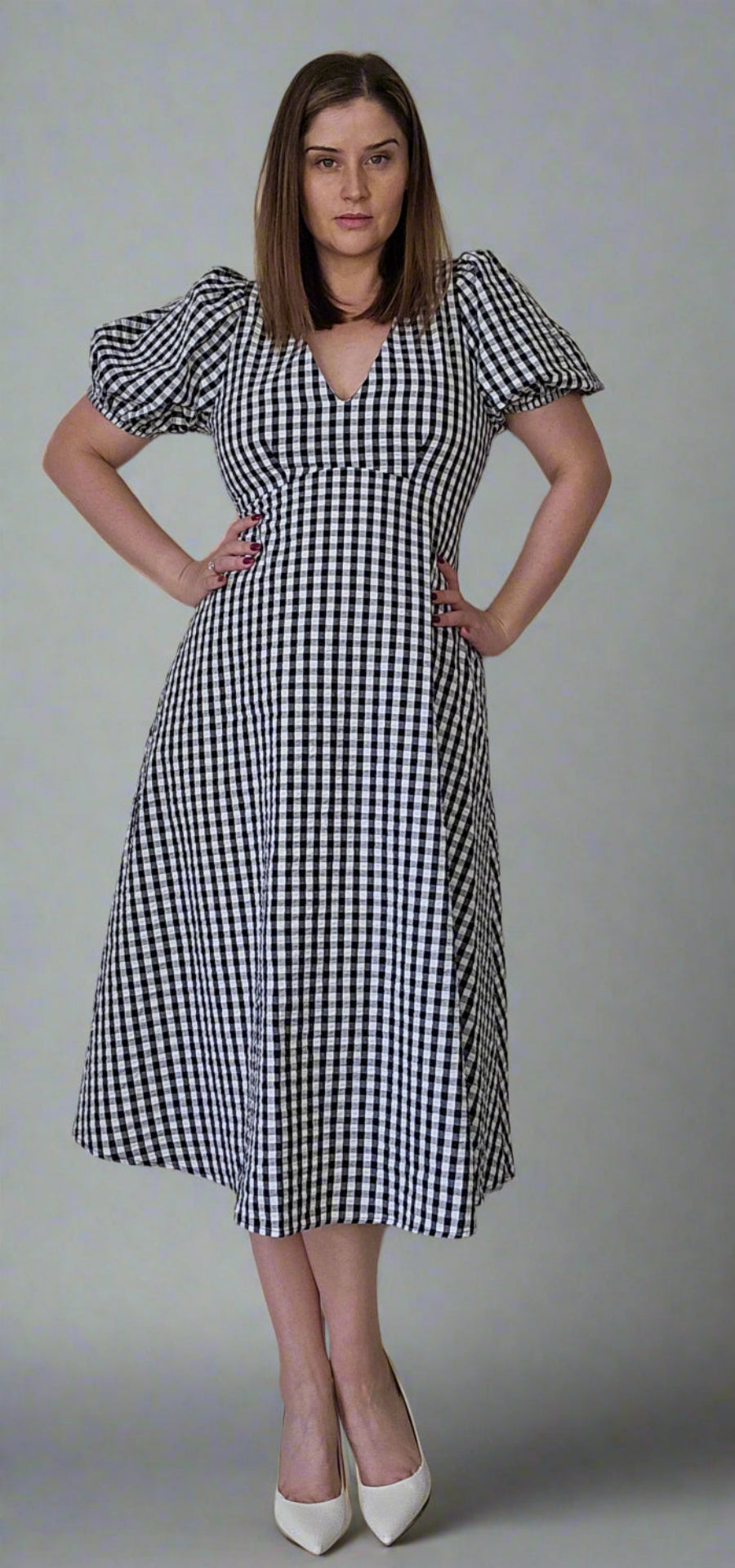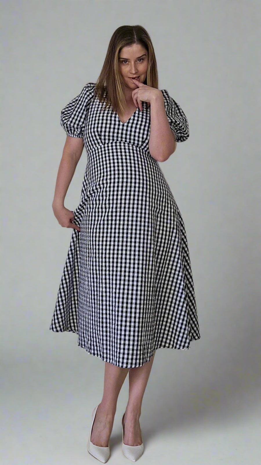 A fresh take on effortless charm — this Lilly Loves black and white gingham midi dress is equal parts refined and relaxed. With softly puffed sleeves, a flattering V-neckline, and a silhouette that skims the body just so, it brings ease and quiet confidence to your wardrobe.