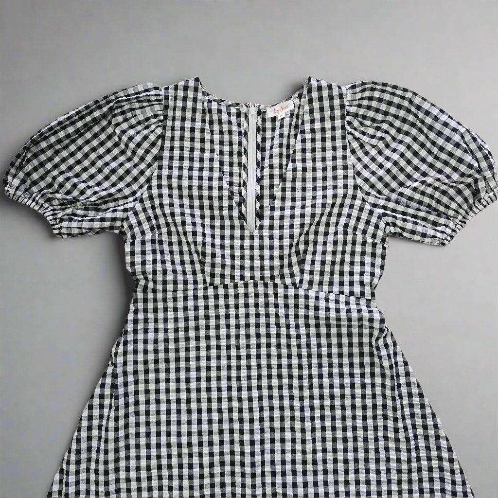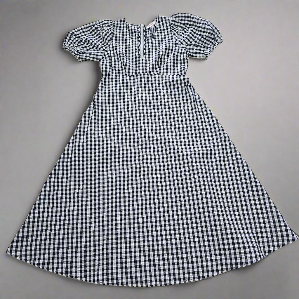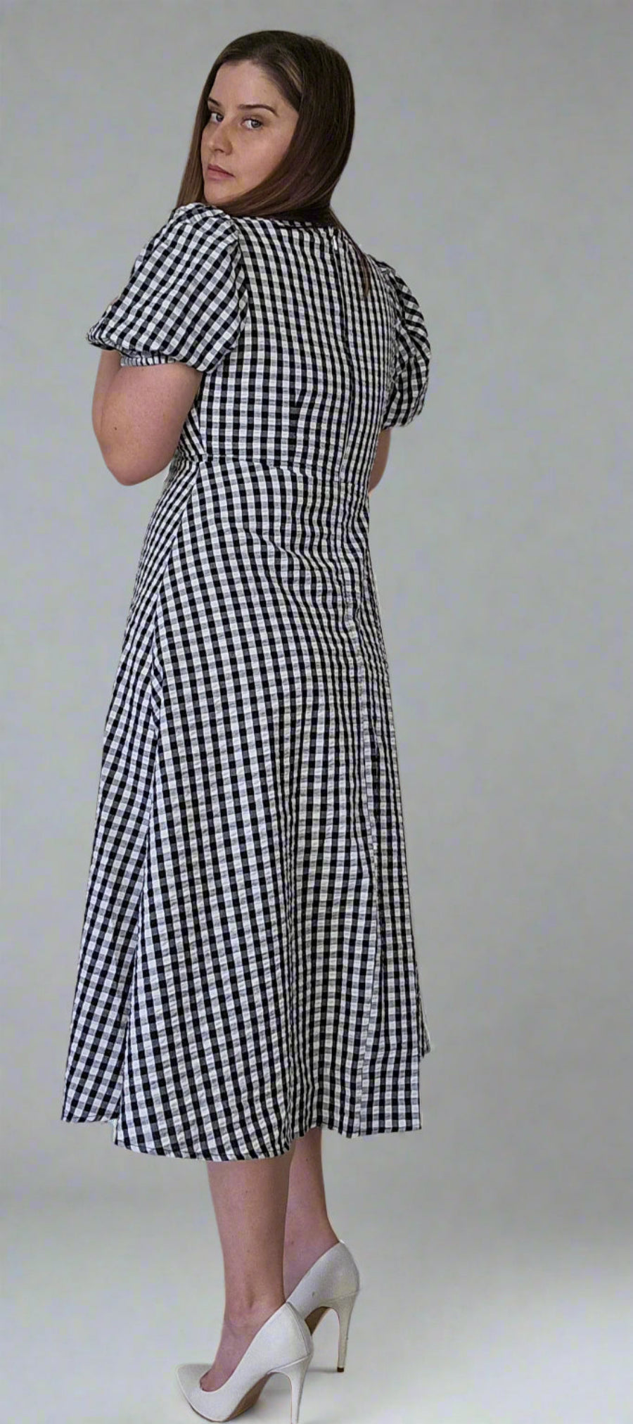 A fresh take on effortless charm — this Lilly Loves black and white gingham midi dress is equal parts refined and relaxed. With softly puffed sleeves, a flattering V-neckline, and a silhouette that skims the body just so, it brings ease and quiet confidence to your wardrobe.