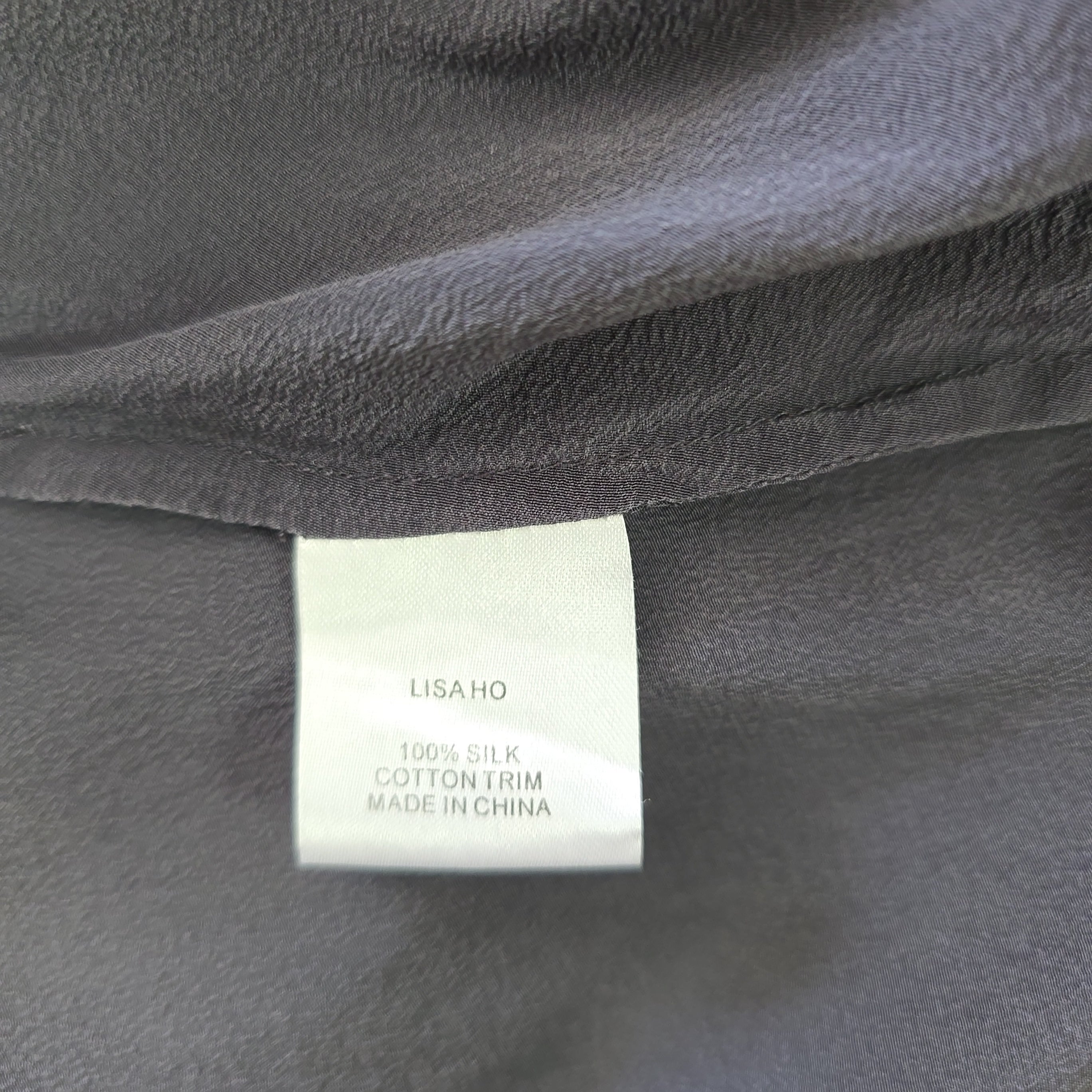 Lisa Ho grey silk dress with embroidered neckline, tie shoulders, and drawstring waist. A sophisticated designer piece with effortless elegance and comfort.