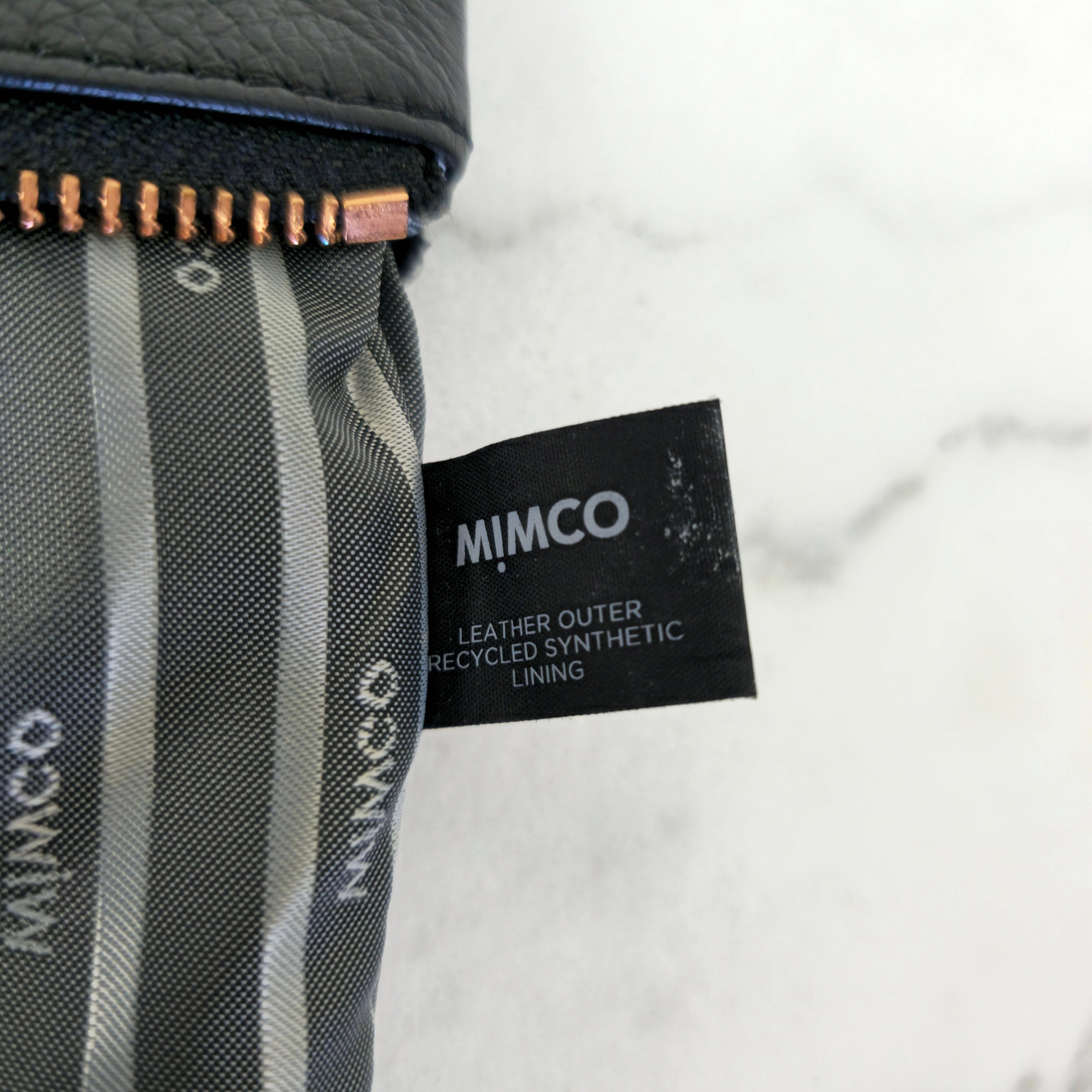 A refined black leather clutch by Mimco with rose gold hardware and glitter logo detailing — versatile, elegant, and perfect for day-to-night wear.