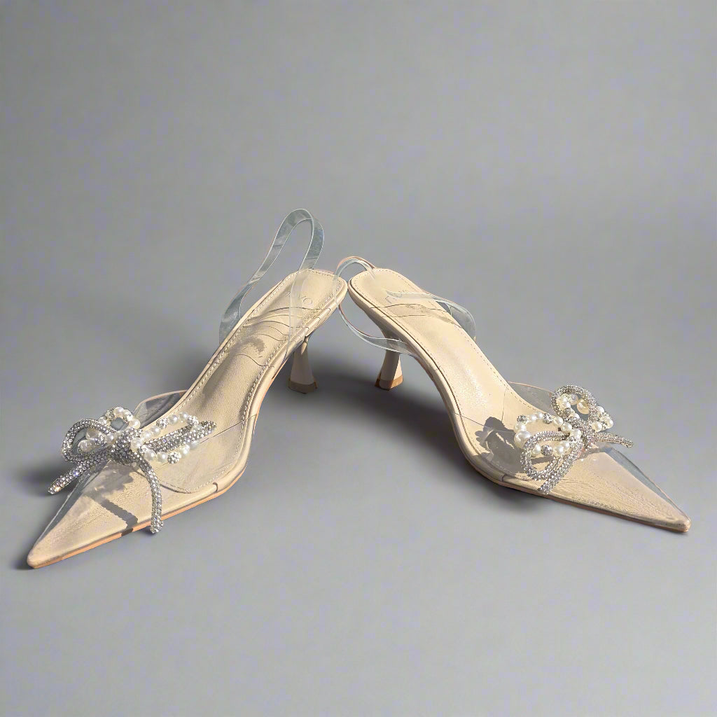 A crystal-clear silhouette allows these heels to complement any outfit — from bridal whites to bold eventwear. The showstopping double bow, adorned with pearls and diamantes, adds a playful yet polished finish that will have people asking, “Where did you get those?”