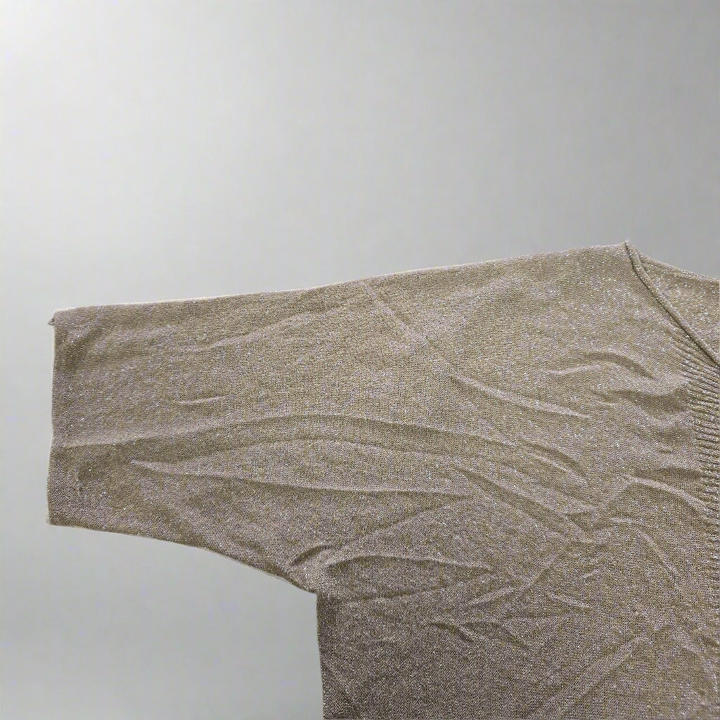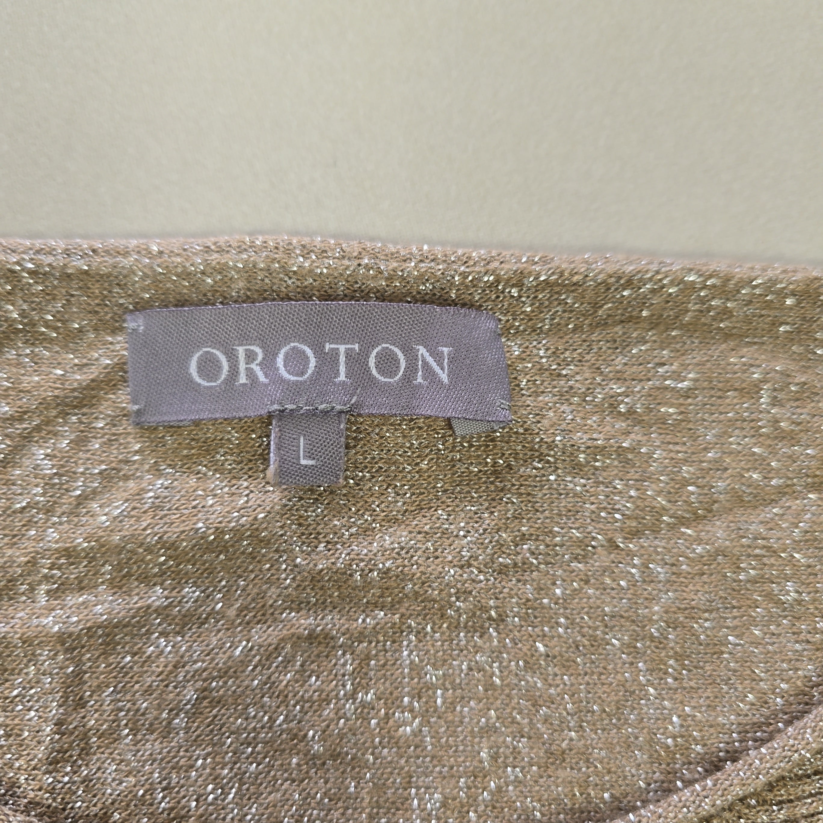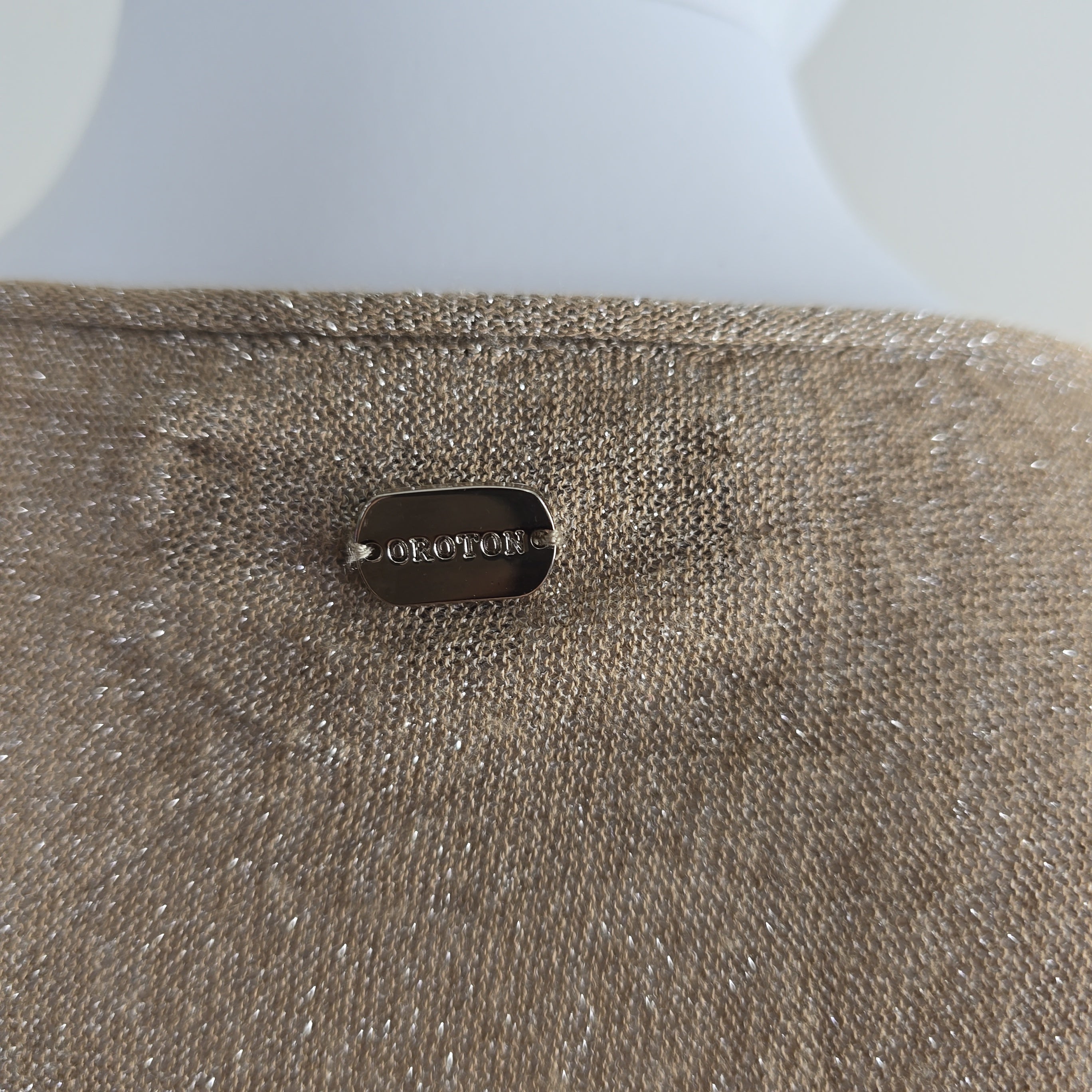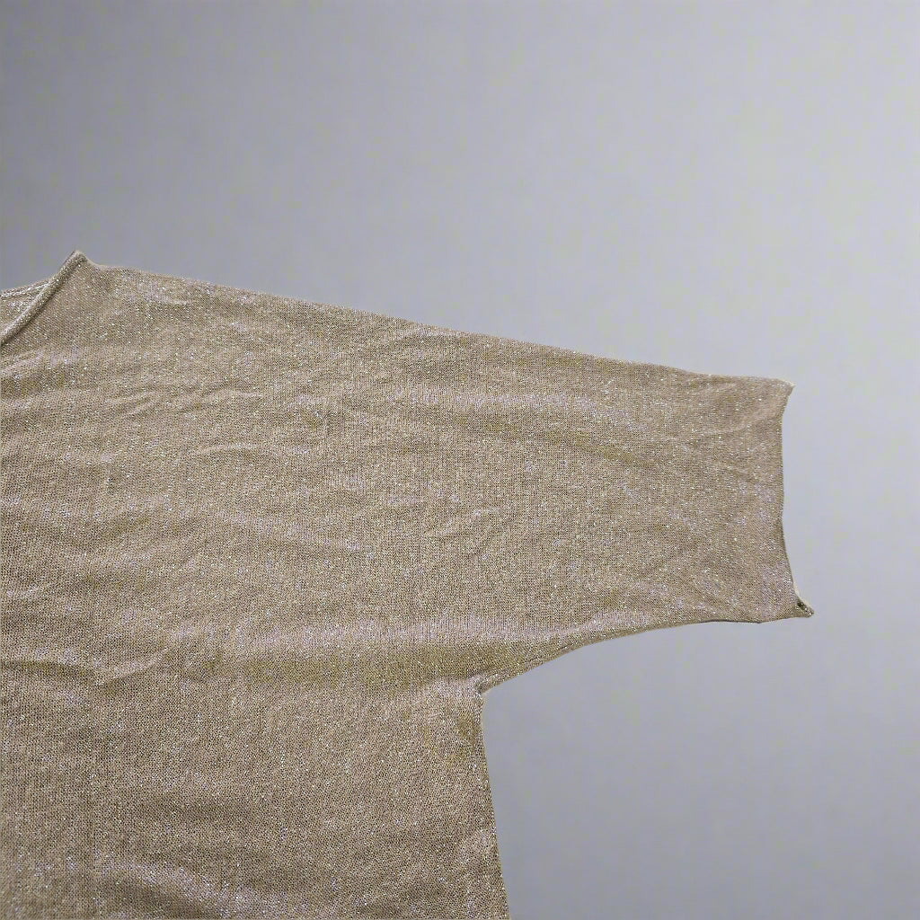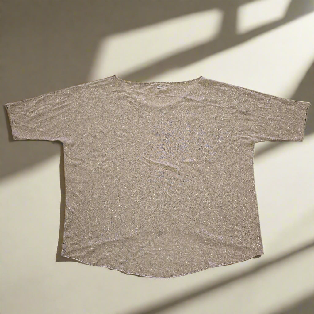 Effortless glamour meets easy layering in this Oroton metallic knit top. With its subtle high-low hem, relaxed silhouette, and sheer shimmer, this top is made for movement and catching the light. Silver metallic threads are woven throughout for that understated Oroton sparkle, and a signature metal badge at the back adds a touch of polish.