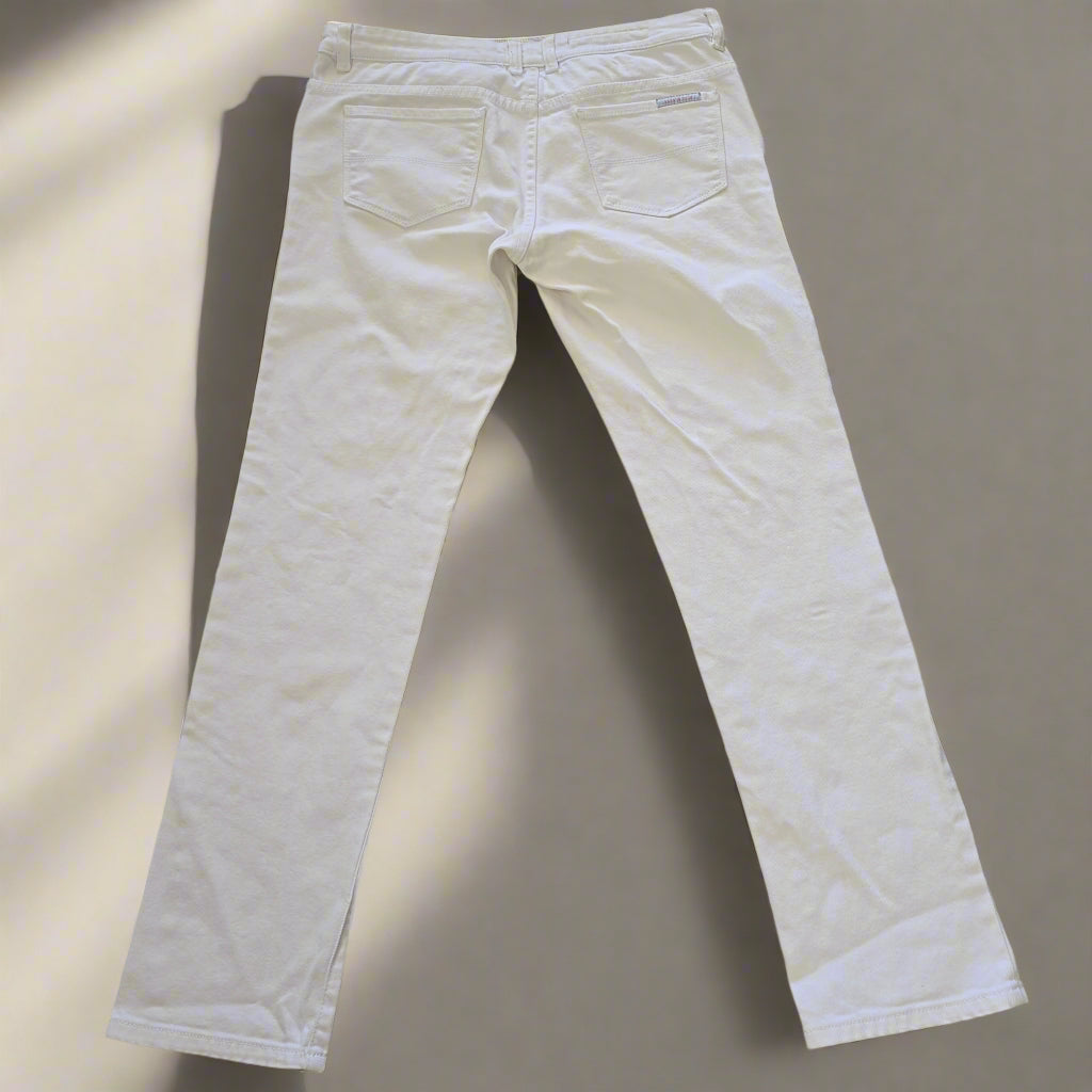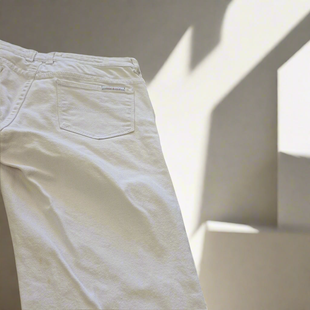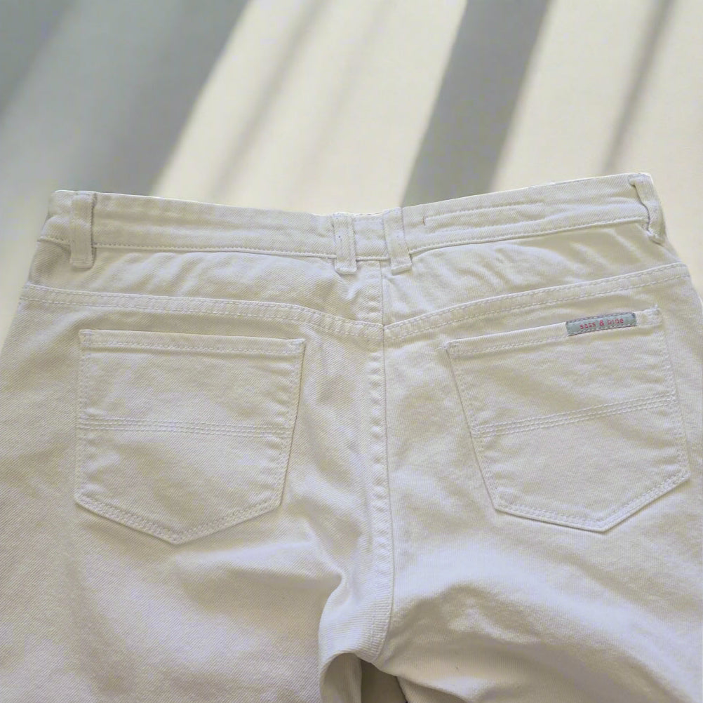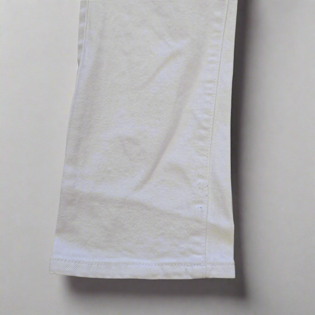 The mid-rise waist and straight-leg cut create a streamlined silhouette, while the crisp white tone brings instant freshness to any outfit. Subtle external marks are present, but they’re minimal and don’t take away from the jeans’ effortless appeal.