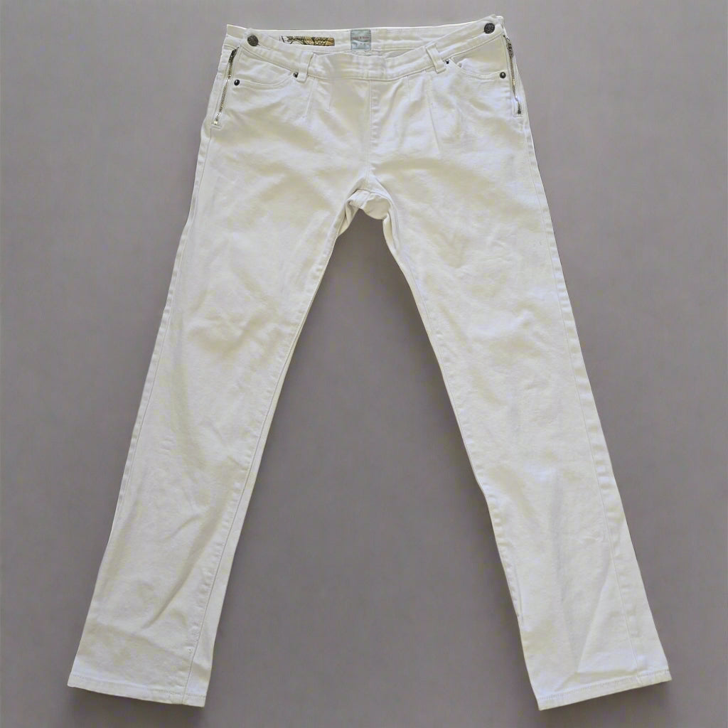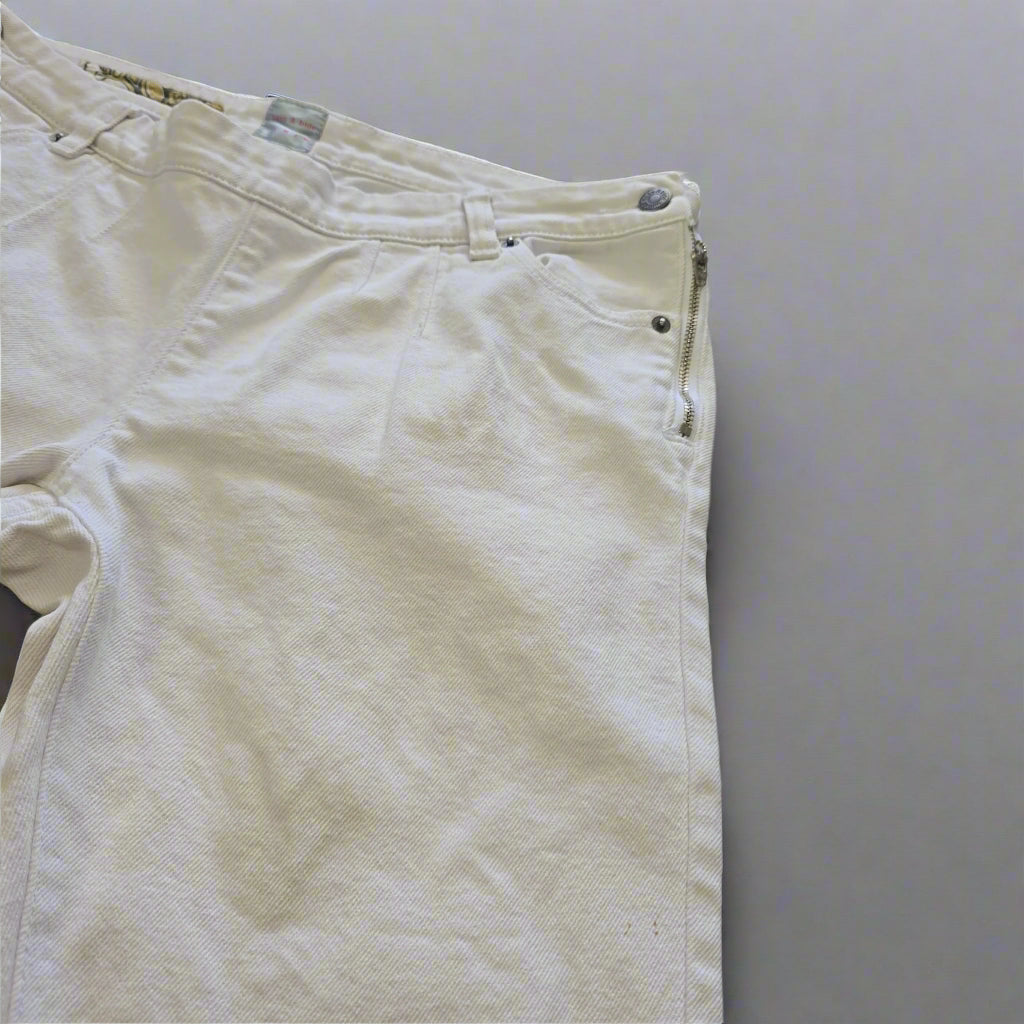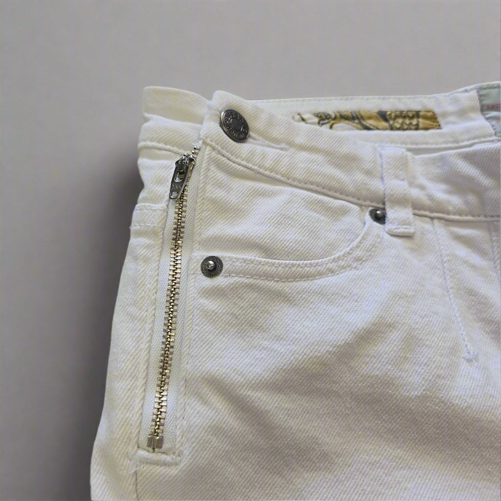 The mid-rise waist and straight-leg cut create a streamlined silhouette, while the crisp white tone brings instant freshness to any outfit. Subtle external marks are present, but they’re minimal and don’t take away from the jeans’ effortless appeal.