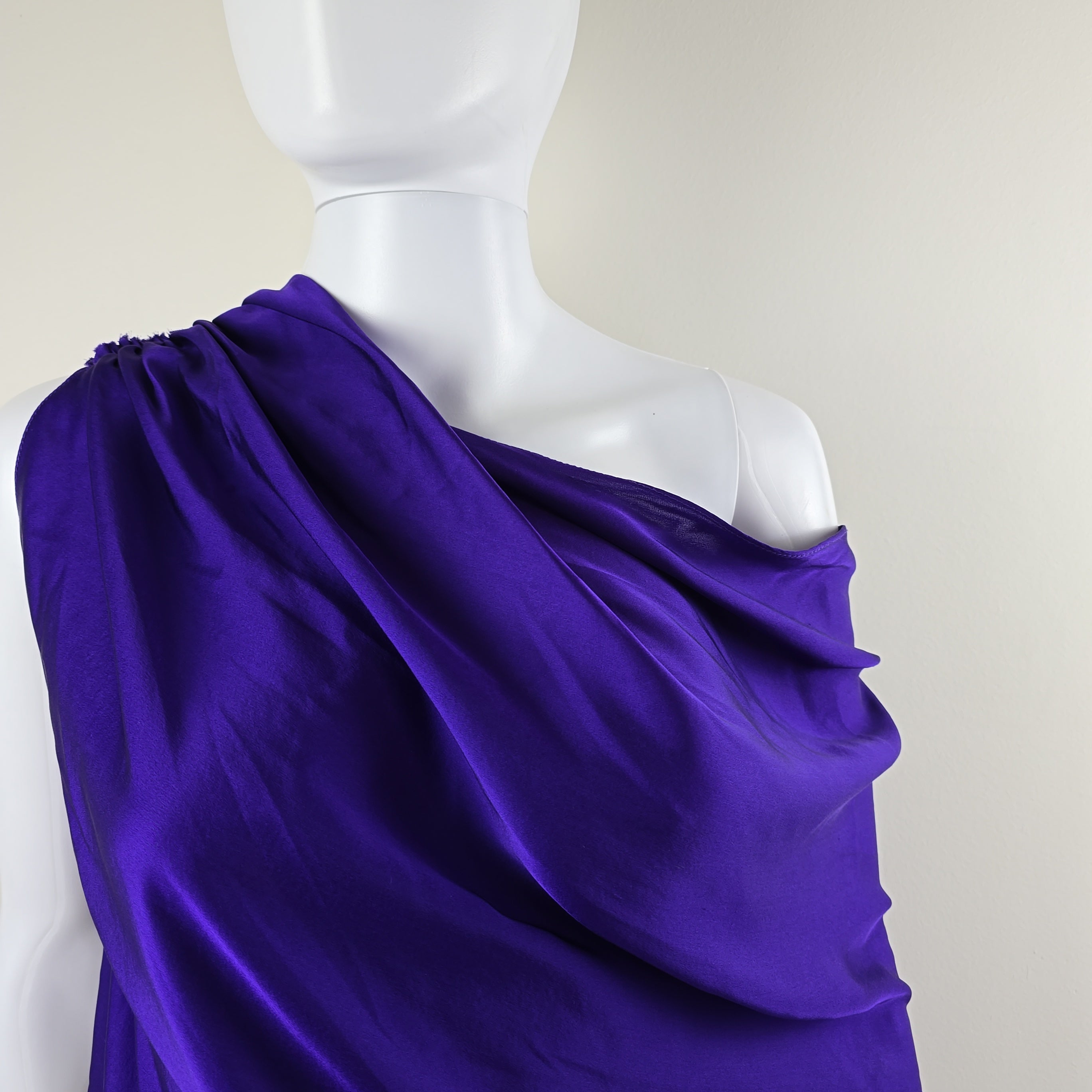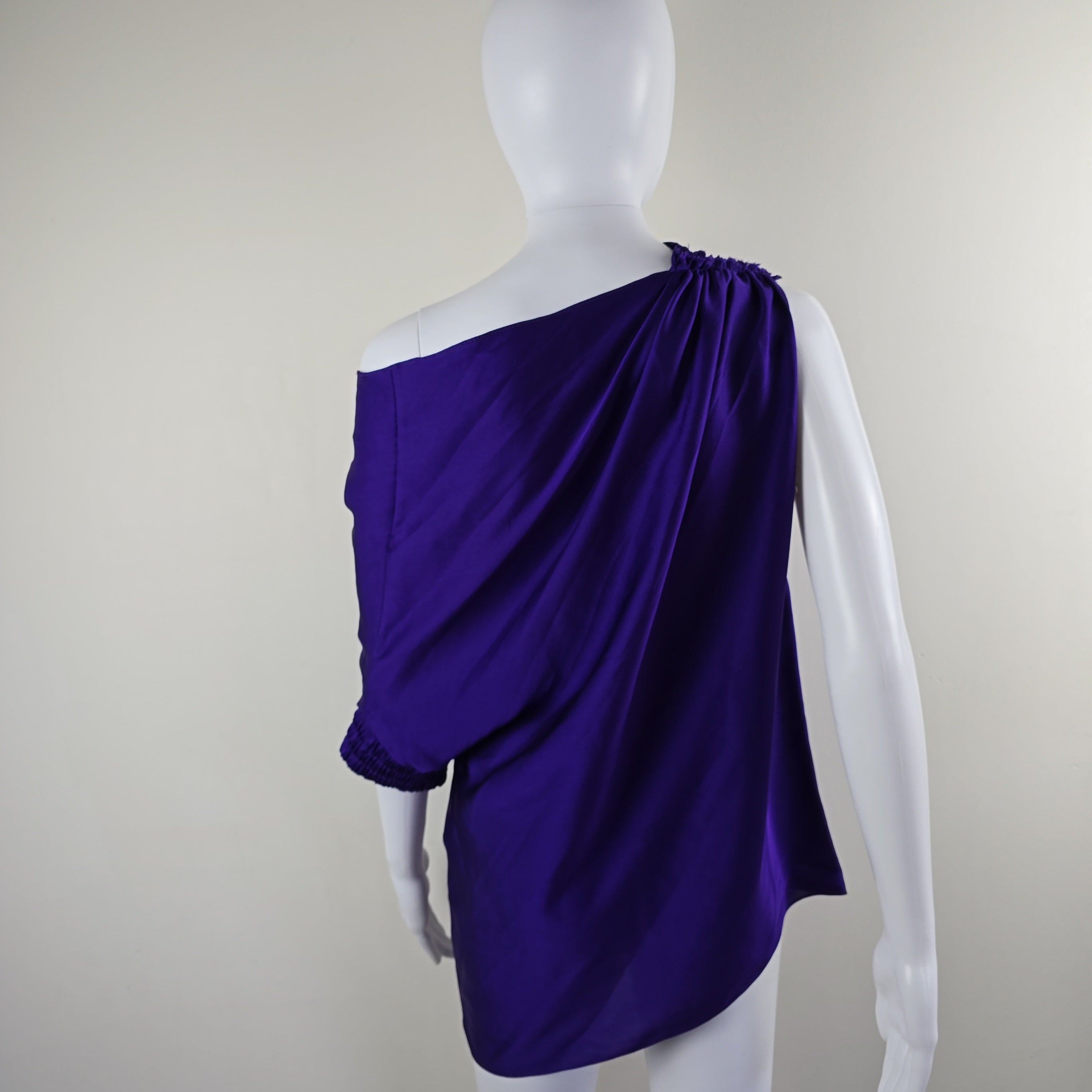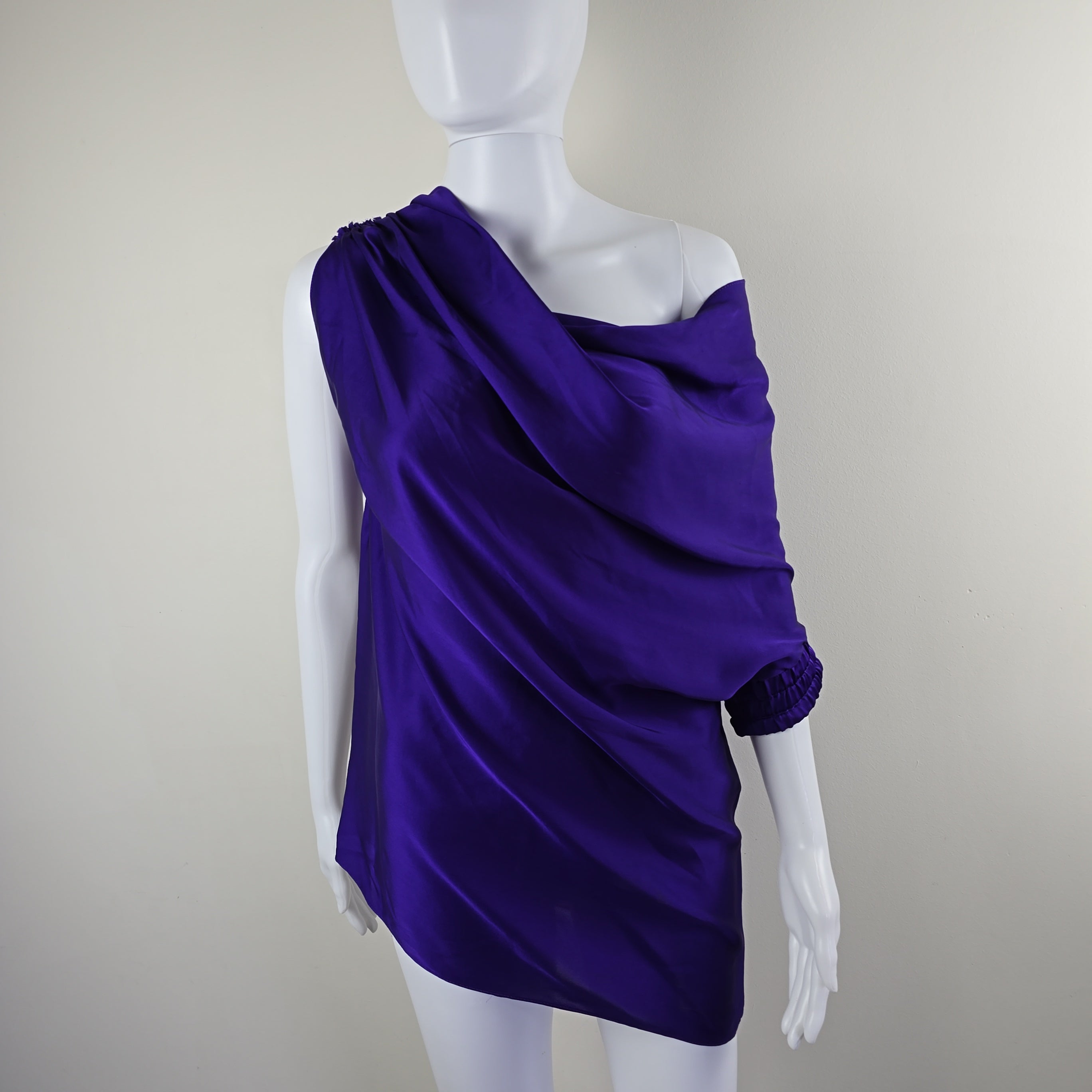 Turn heads with this showstopping Scanlan & Theodore draped silk top in a stunning violet purple hue. Designed in luxurious pure silk, this one-shoulder piece features an elegantly gathered sleeve with internal detailing, offering the perfect balance of bold structure and fluid drape.