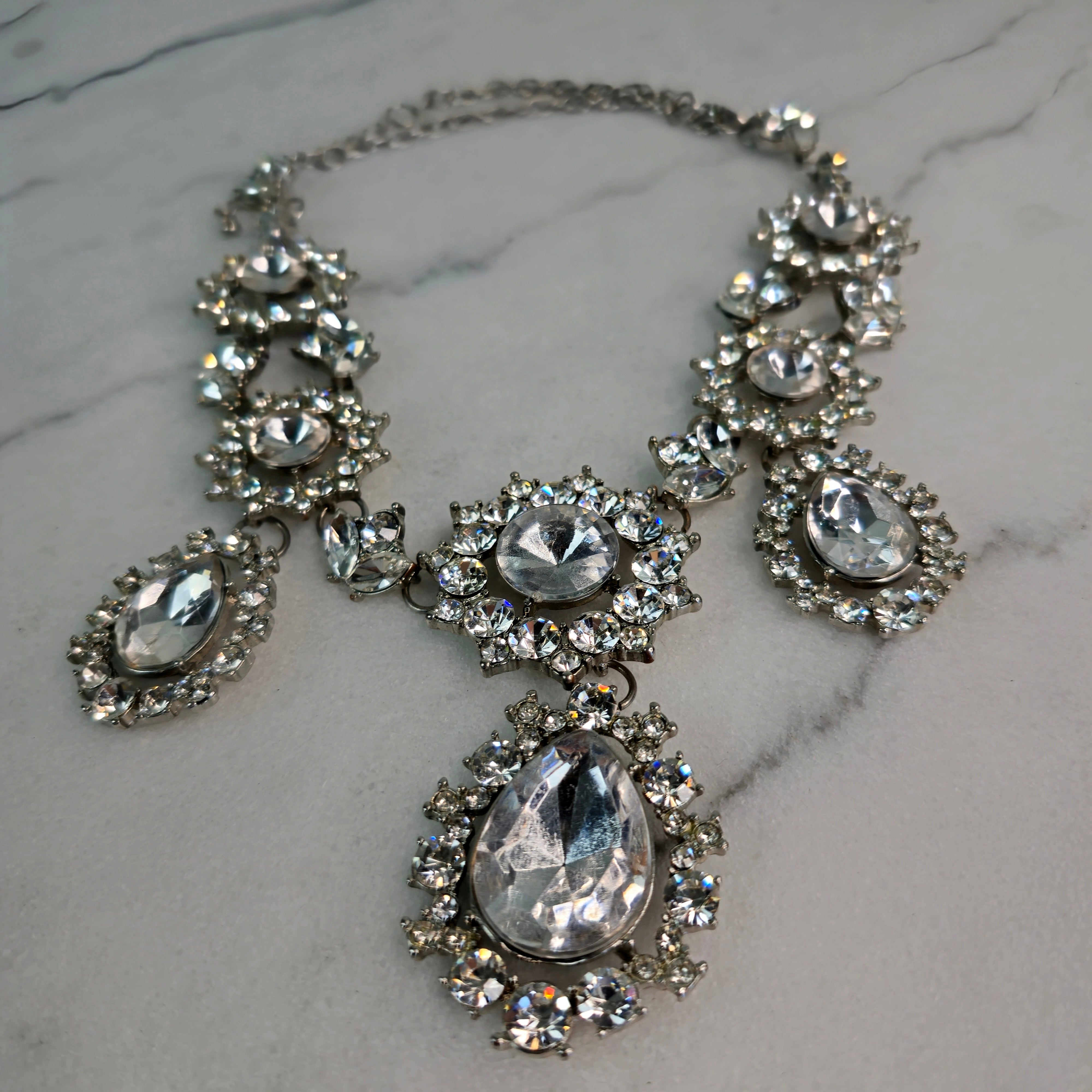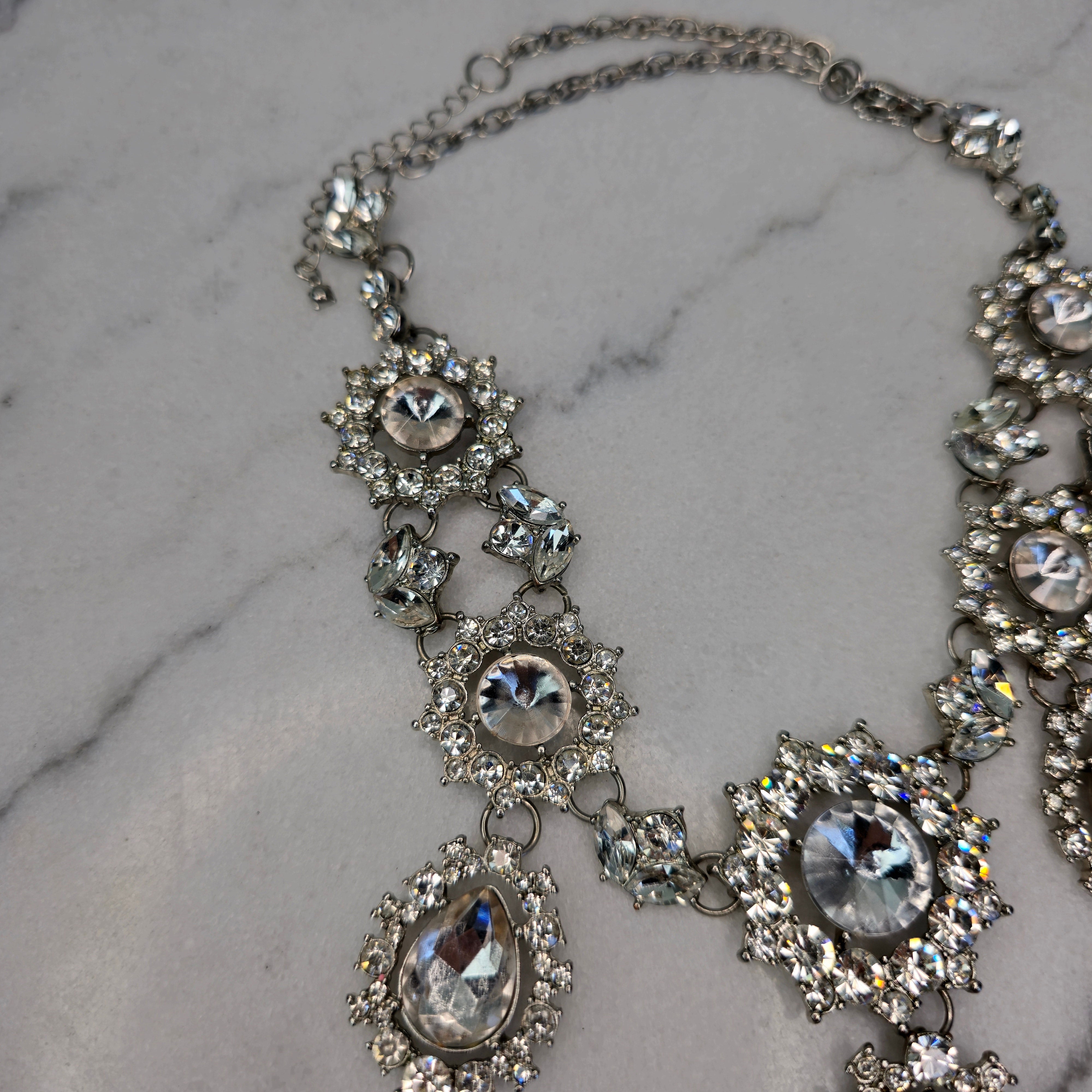 Stone Arrangement: Features a centerpiece of a large teardrop-shaped crystal, surrounded by smaller, round-cut stones for extra brilliance. Additional oval and circular gems extend along the chain, creating a dazzling, multi-layered effect.