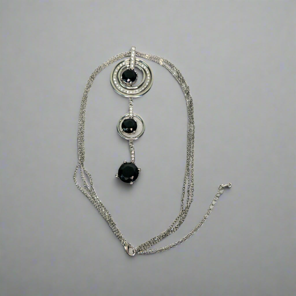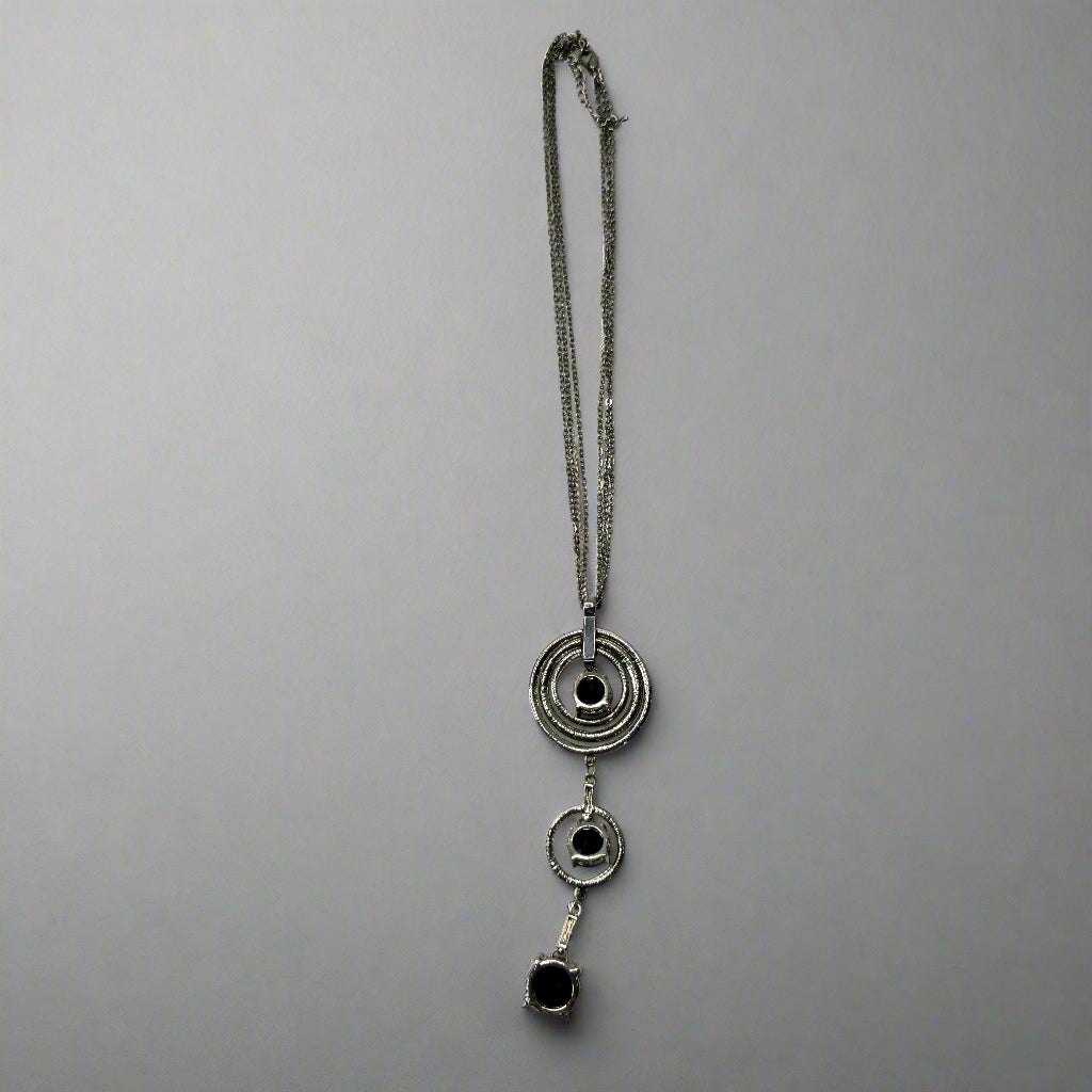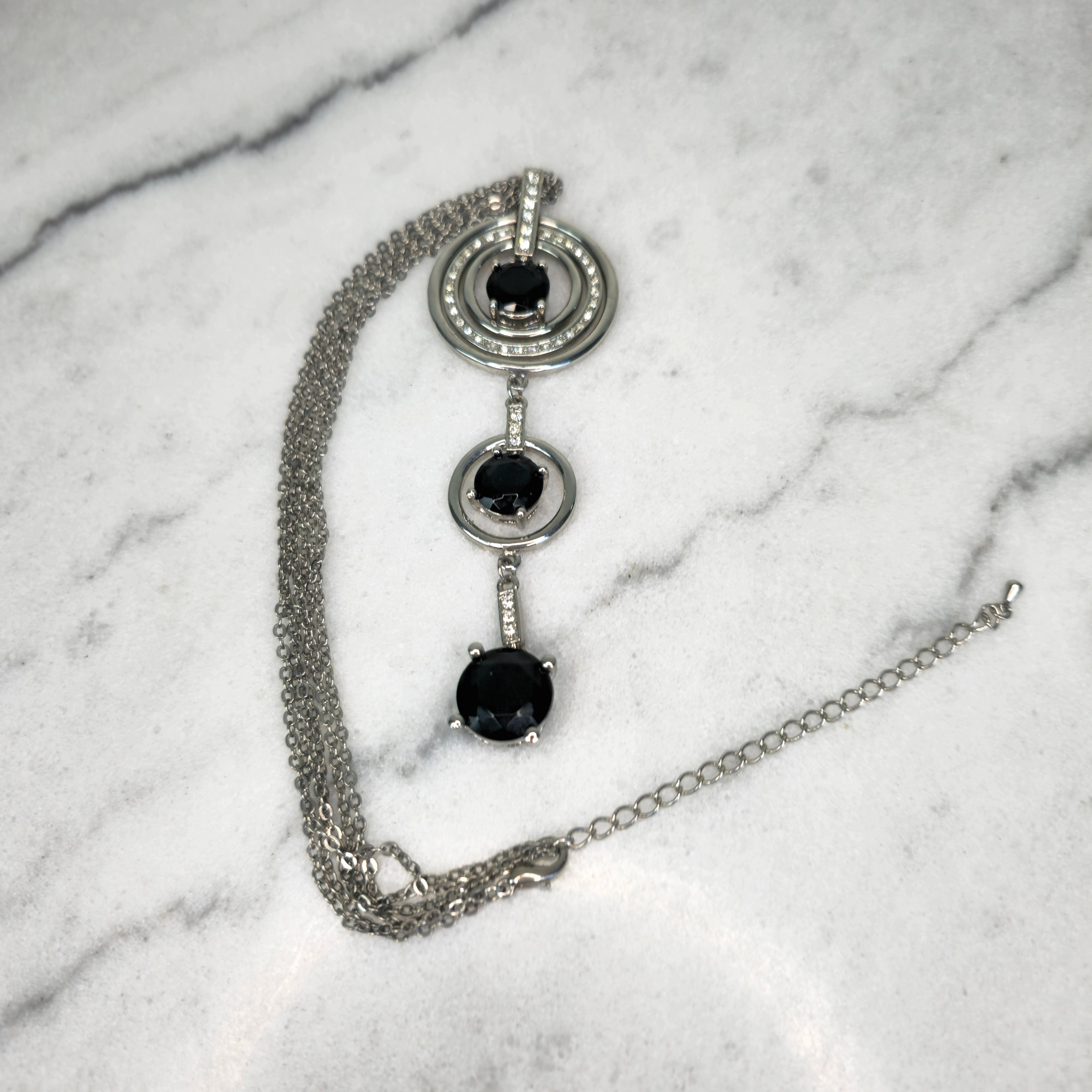 Pendant: Three cascading circular drops, each adorned with a striking black gemstone set within a polished silver frame.