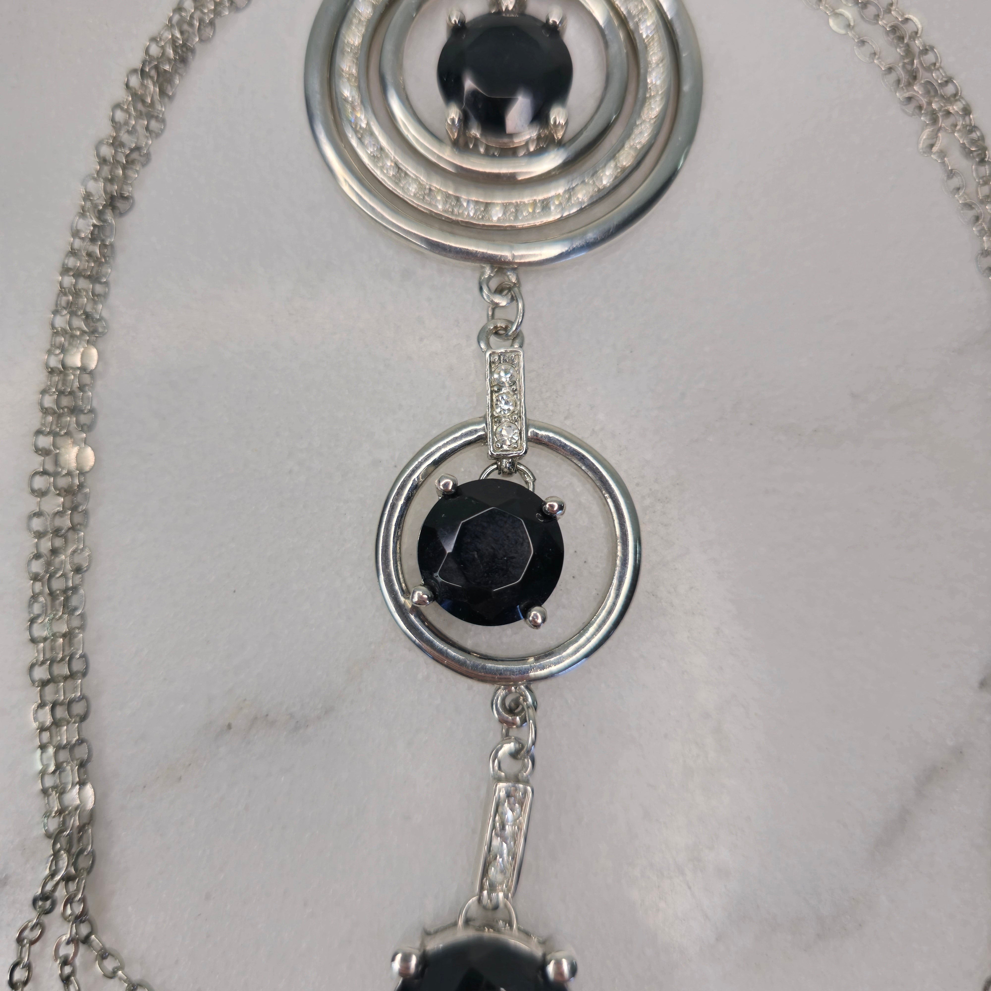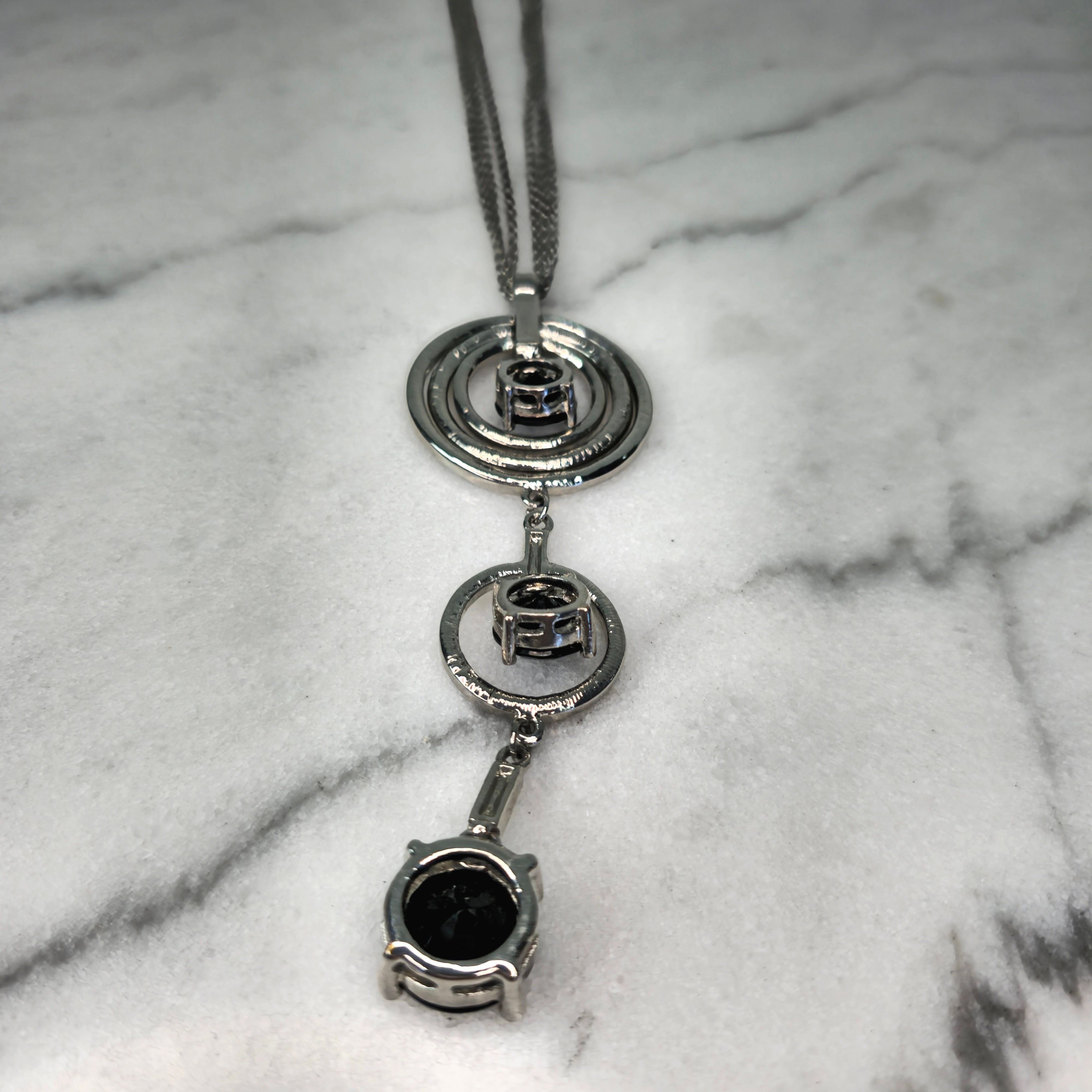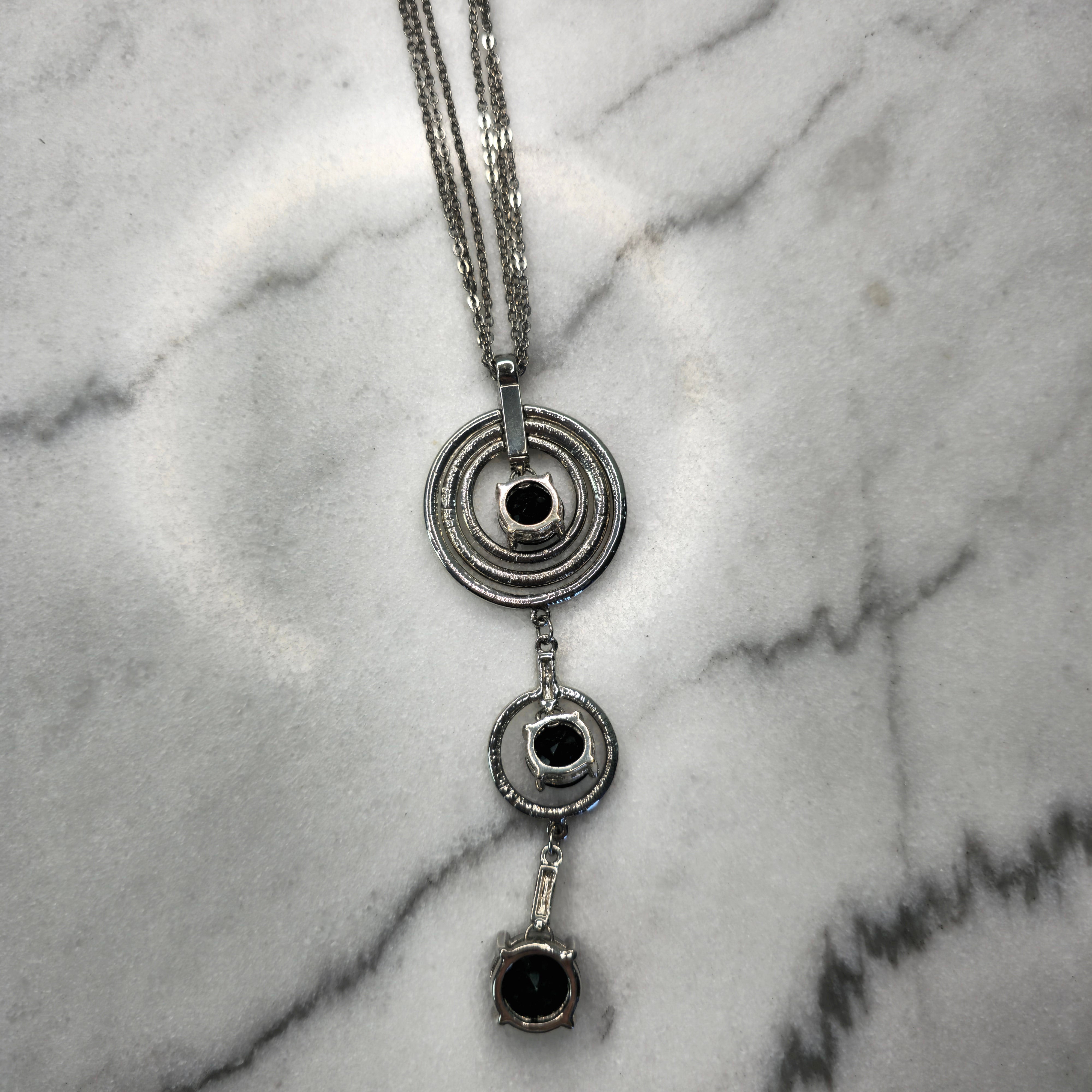 Pendant: Three cascading circular drops, each adorned with a striking black gemstone set within a polished silver frame.