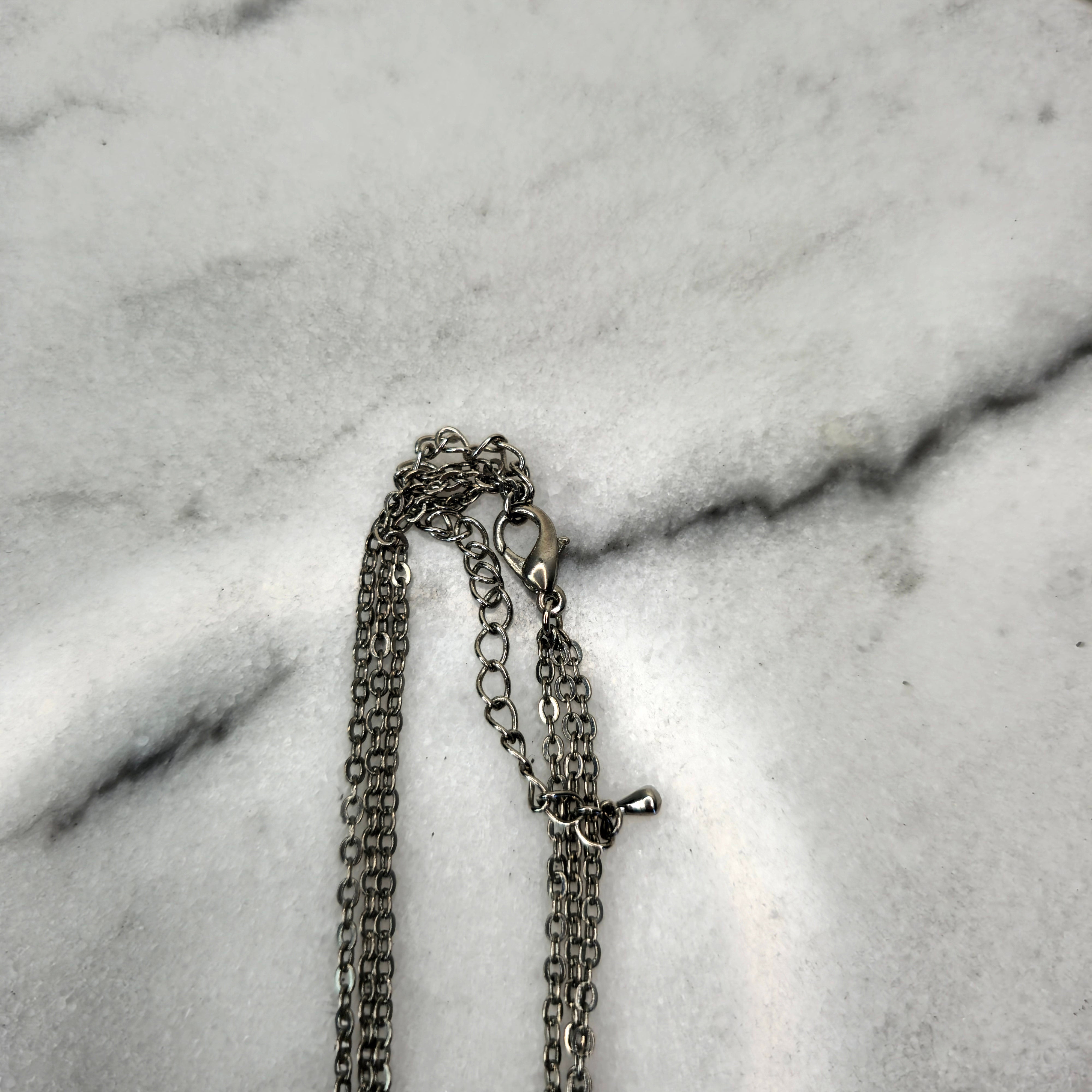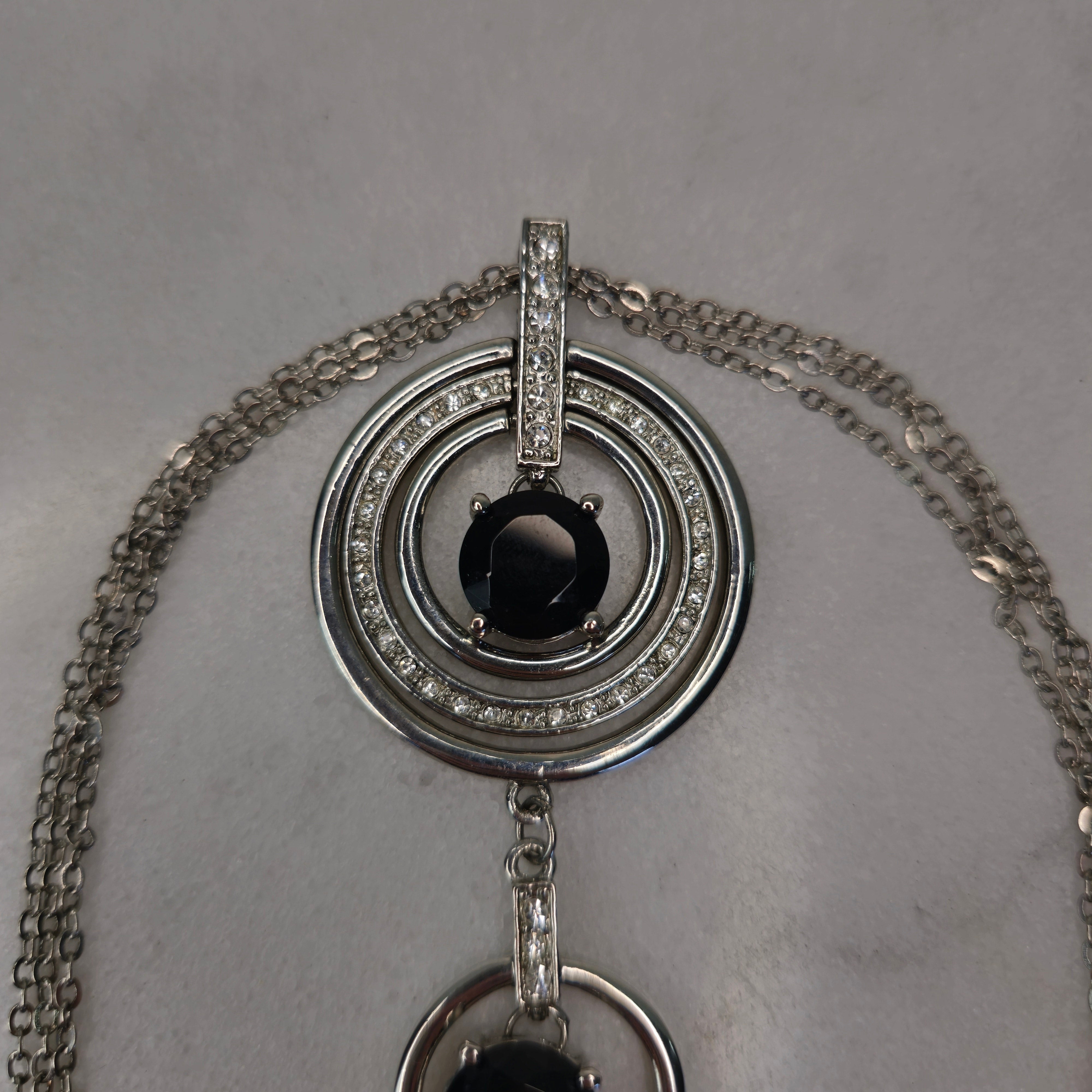 This stunning silver multi-chain necklace features an eye-catching three-tier drop pendant with bold black gemstones and delicate rhinestone accents, making it the perfect statement piece for any occasion.