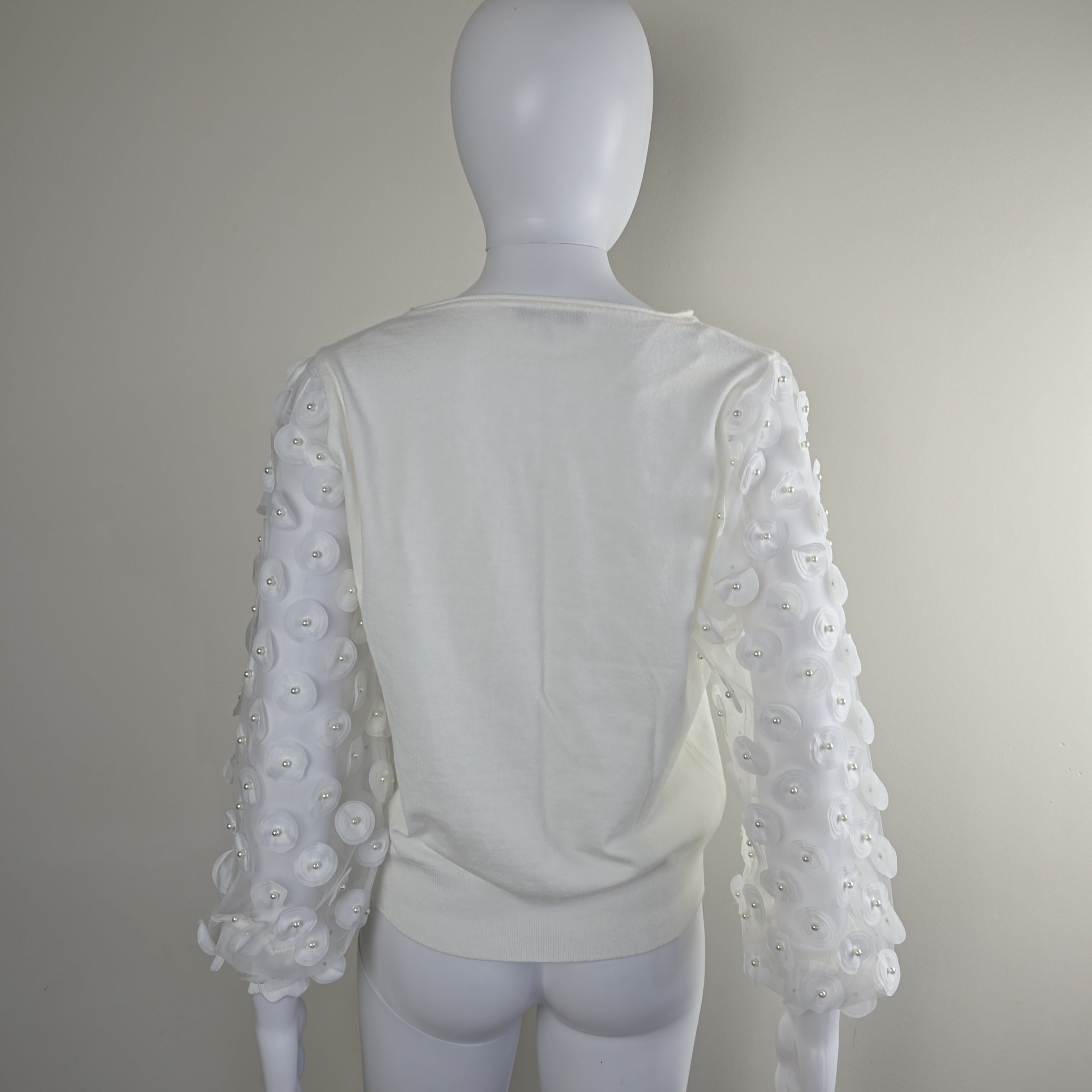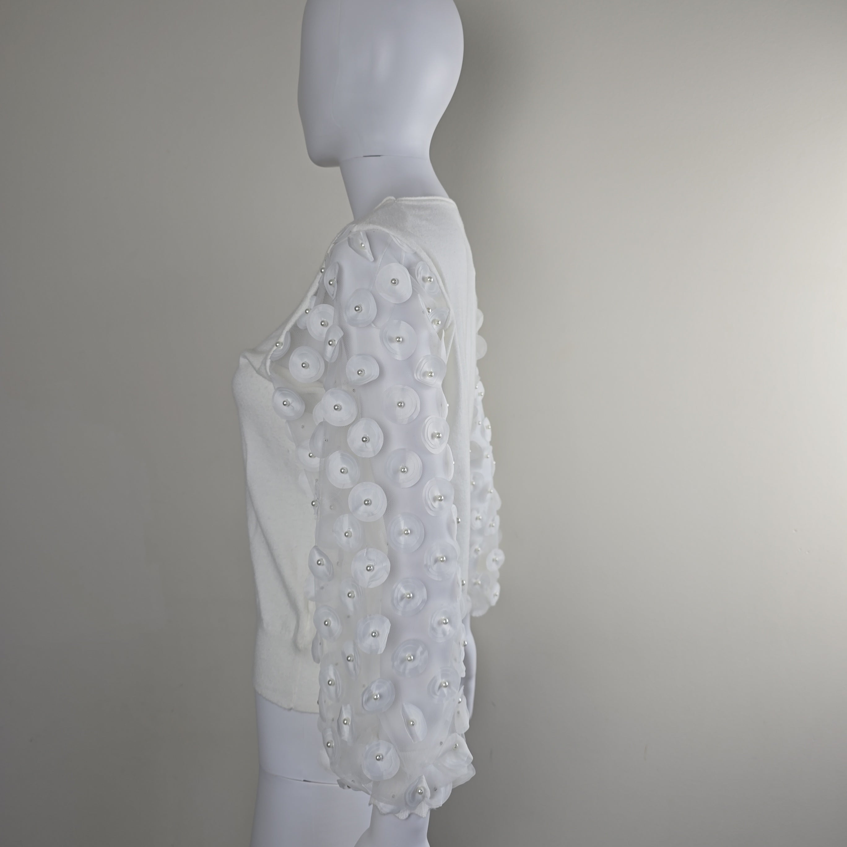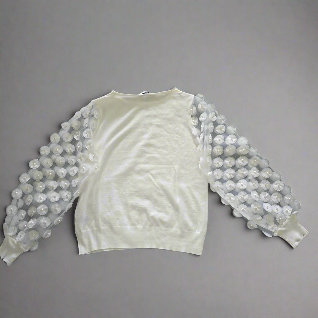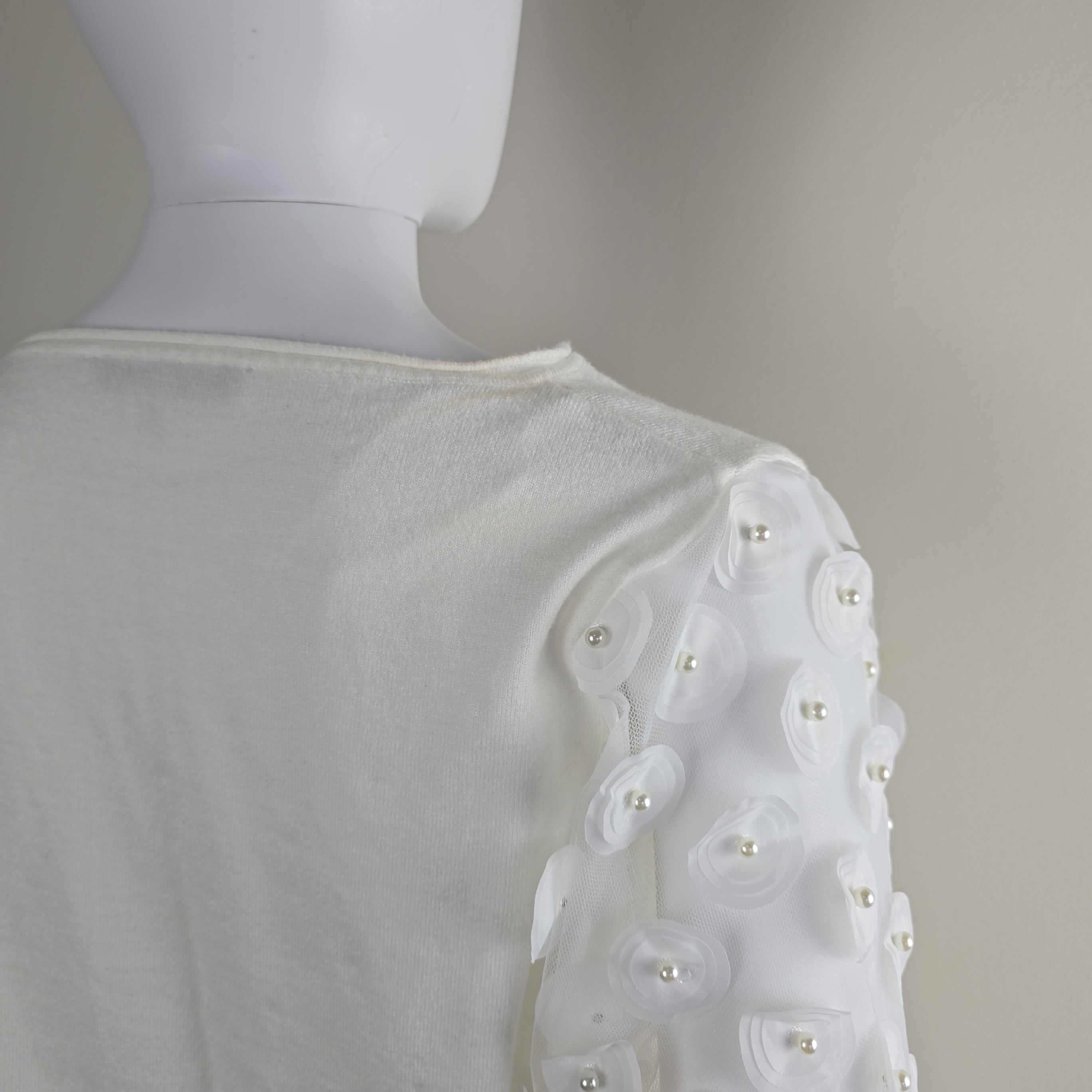 A statement piece with subtle drama — the Siani Milano White Sweater is where classic meets contemporary. The body is soft, stretchy, and beautifully shaped, while the real showstopper lies in the voluminous sheer sleeves, adorned with 3D disc-like flower and pearl buttons for a playful yet refined texture.