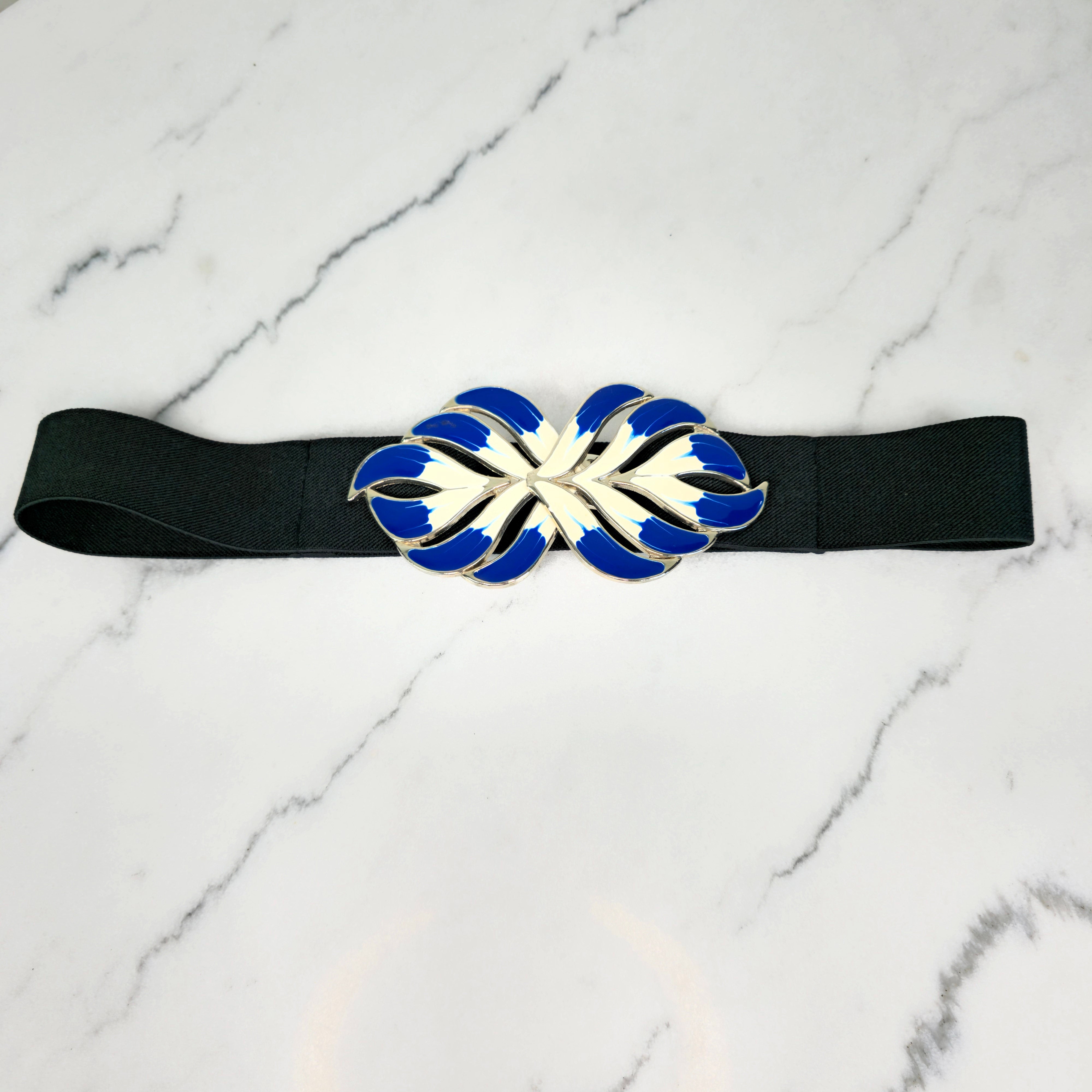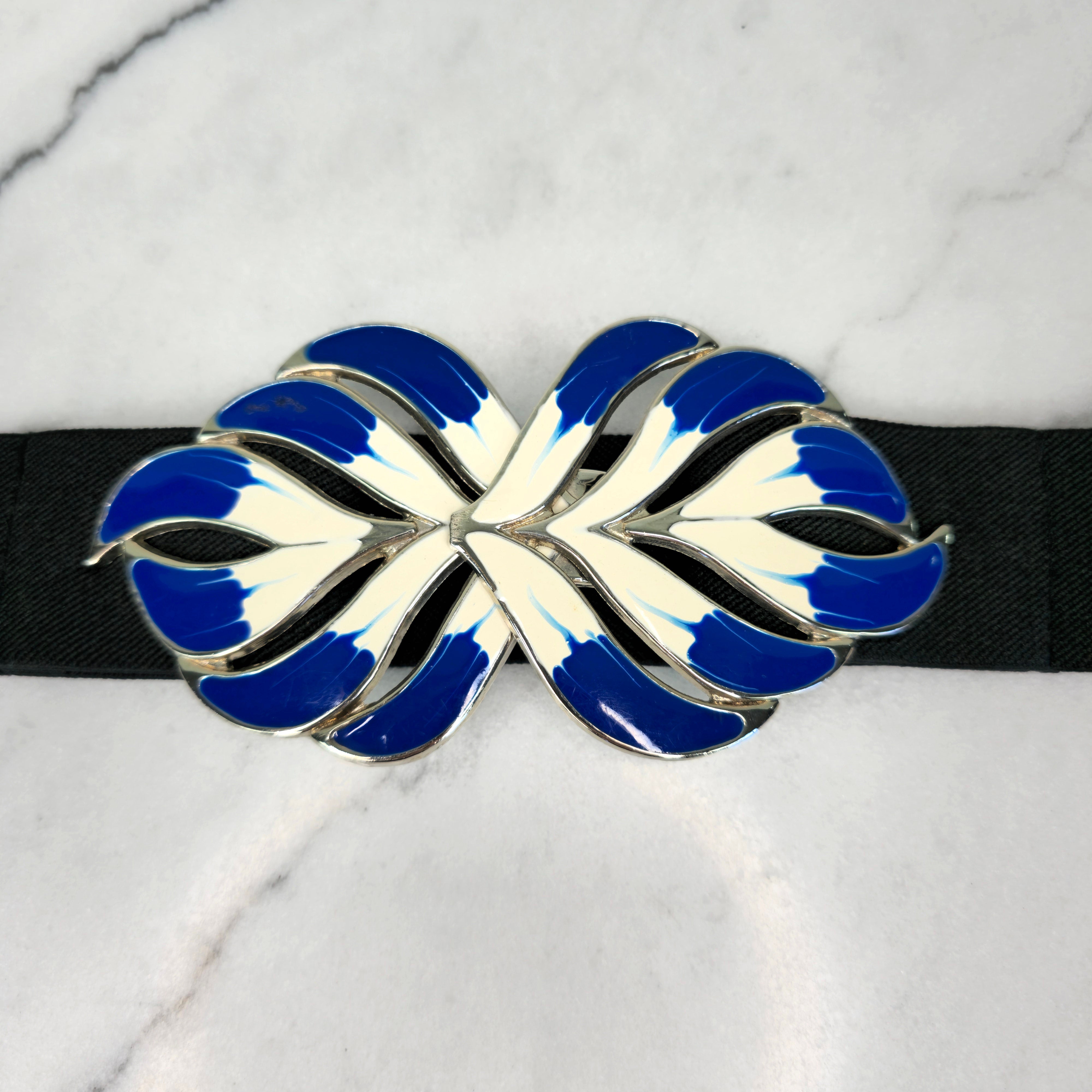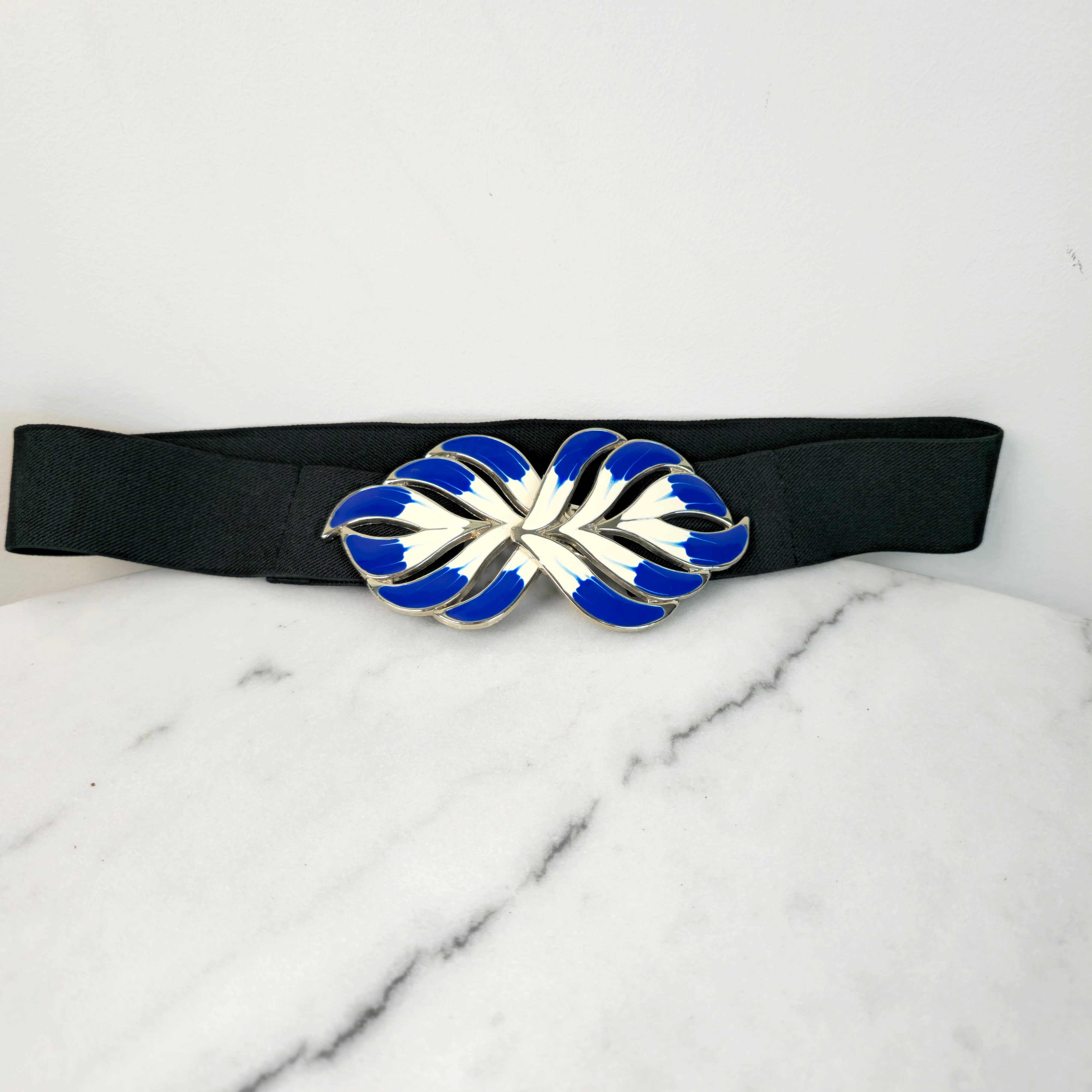 This vintage-inspired belt is a stunning statement piece, featuring a bold enamel buckle with an intricate leaf-like design in vibrant blue and crisp white, set against a polished silver-tone metal base. The black elastic band provides a comfortable and adjustable fit, making it versatile for various waist sizes.
