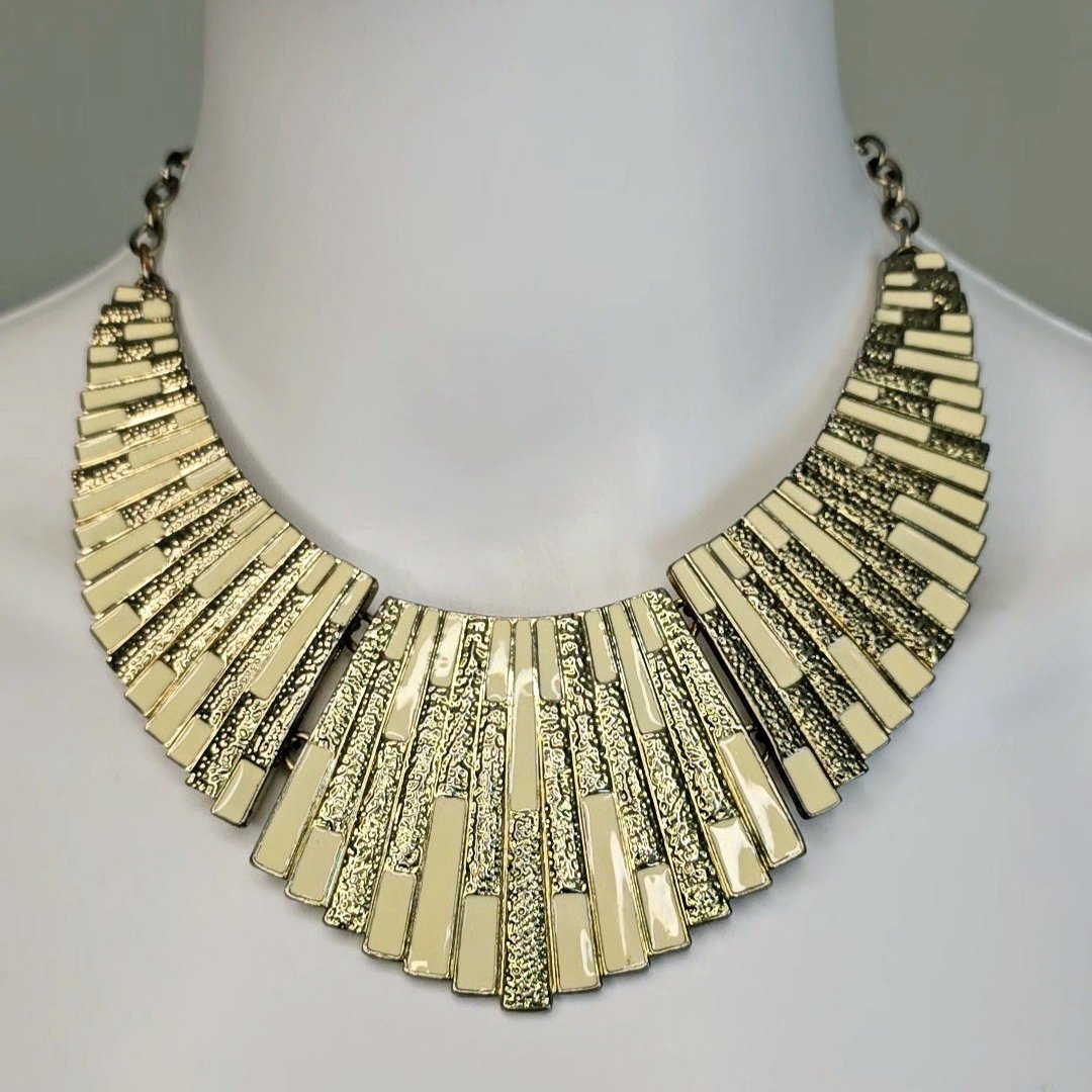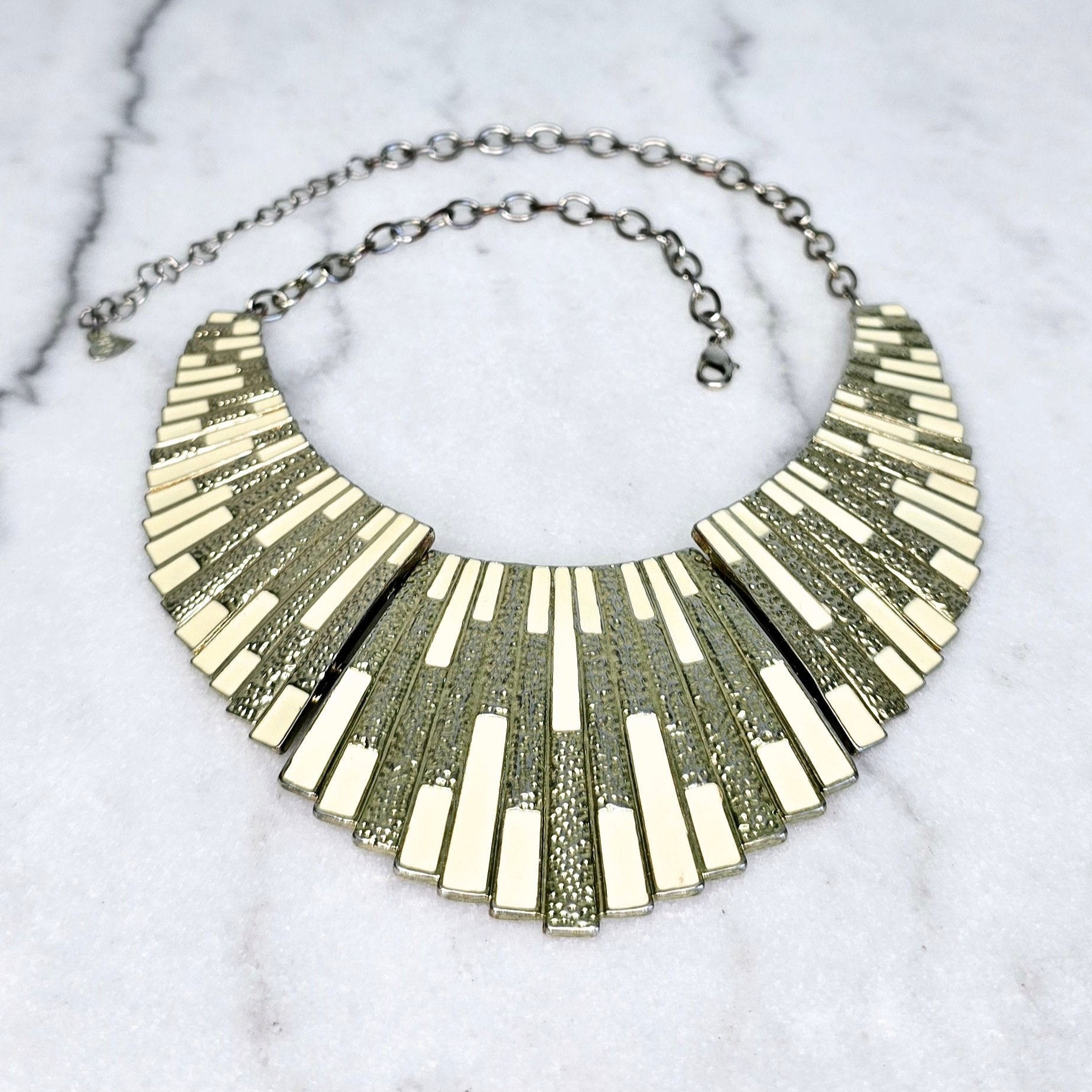 Add a touch of elegance and versatility to your jewelry collection with this stunning piece. Featuring 3 fan-shaped plates, this necklace is designed to sit perfectly on your chest, showcasing a sweeping design.
