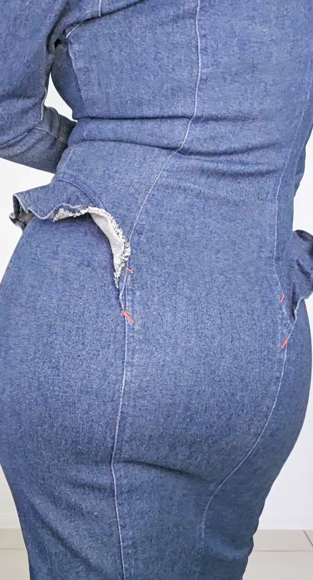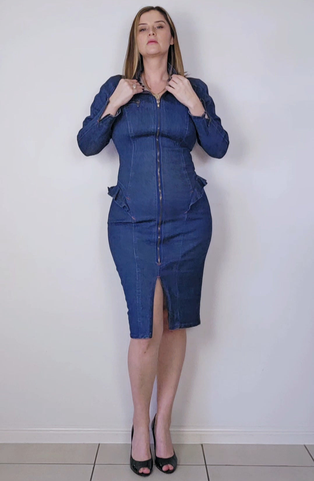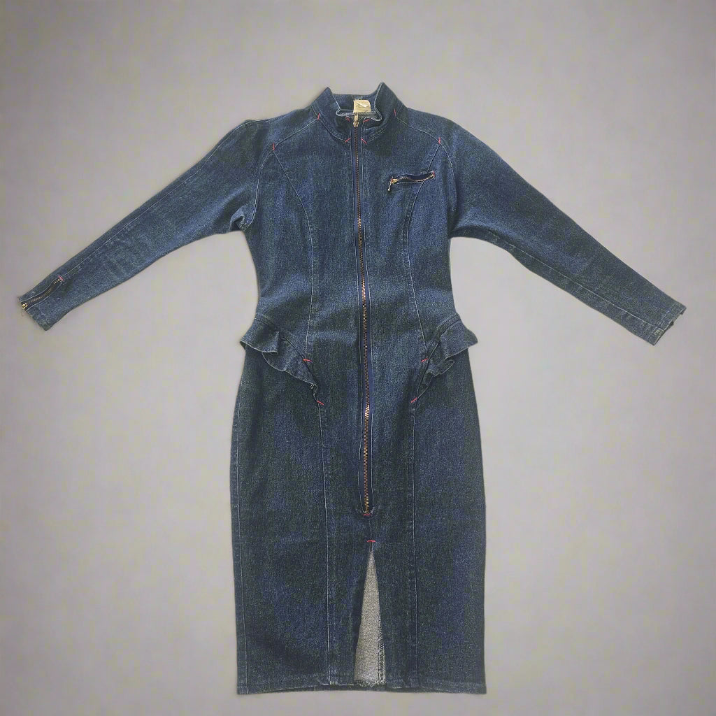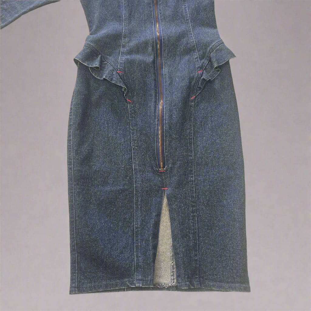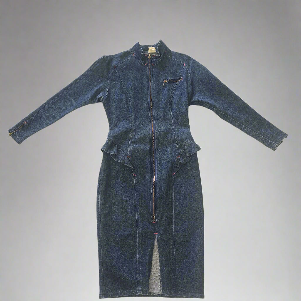 This Scarpa denim dress has a strong 1990s to early 2000s aesthetic. The structured fit, exposed zipper, and peplum-style hip detail are reminiscent of the power dressing era of the '90s, while the denim fabric and bodycon silhouette lean into the early 2000s' love for figure-hugging denim styles.
