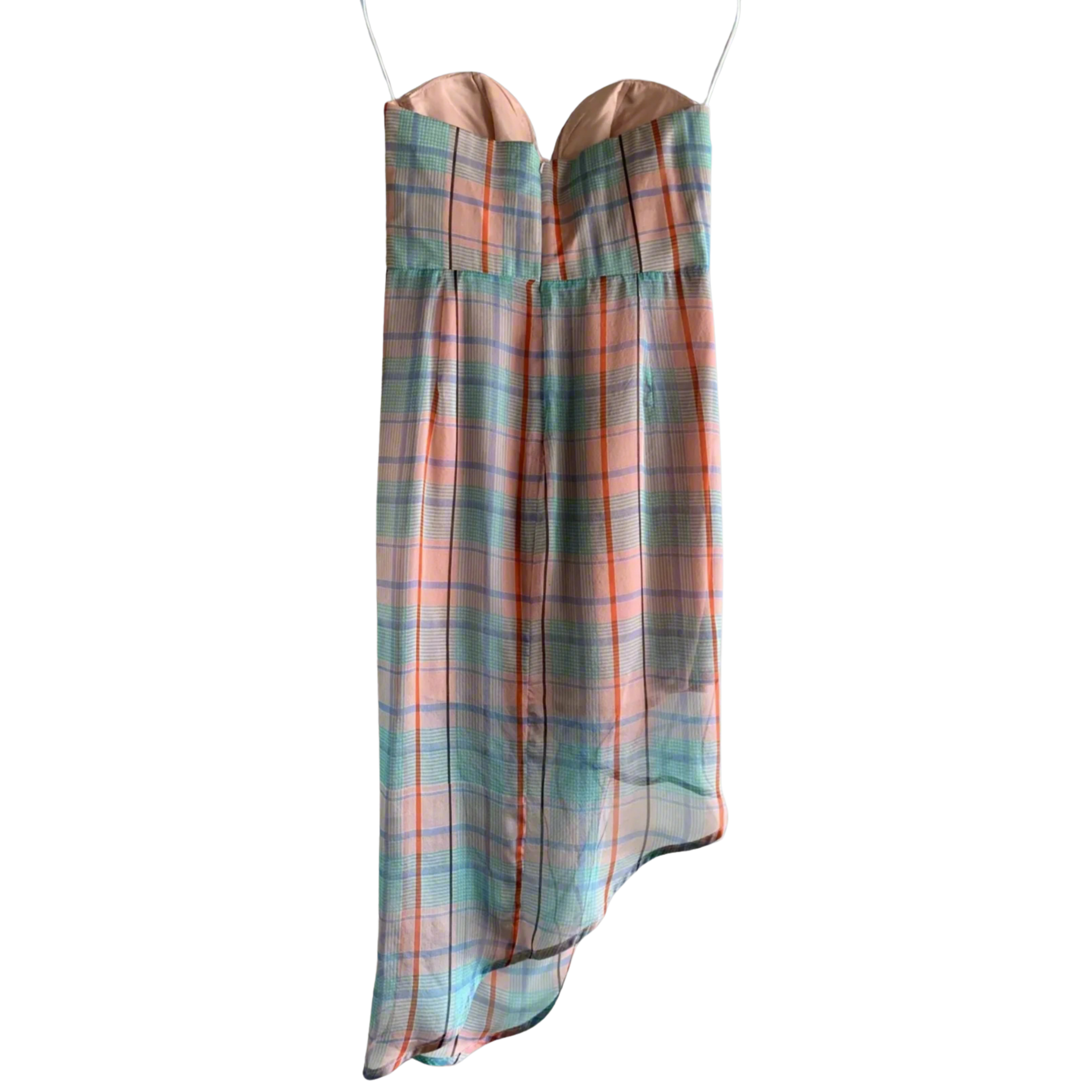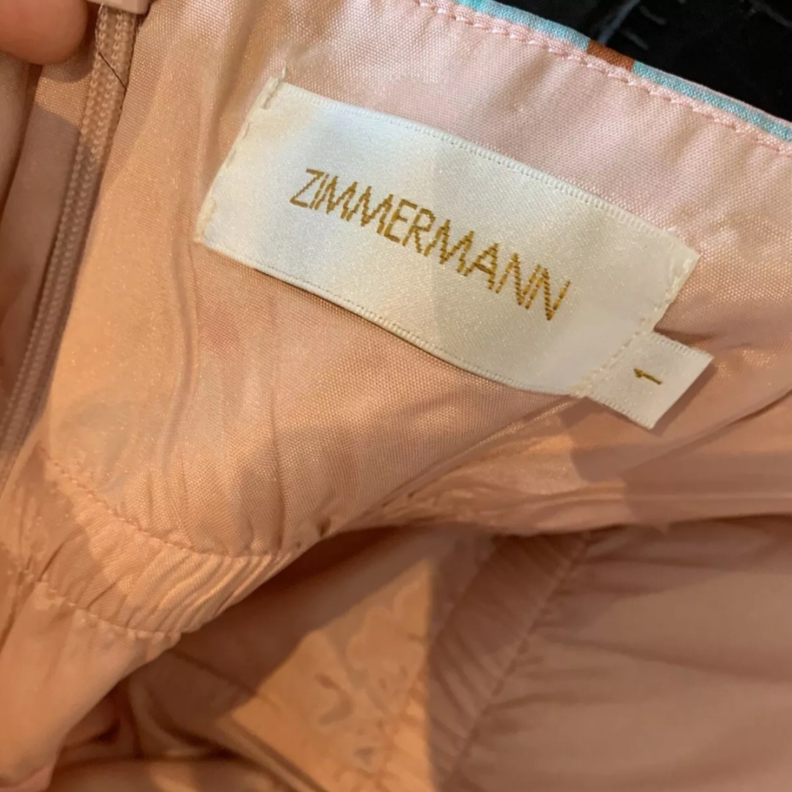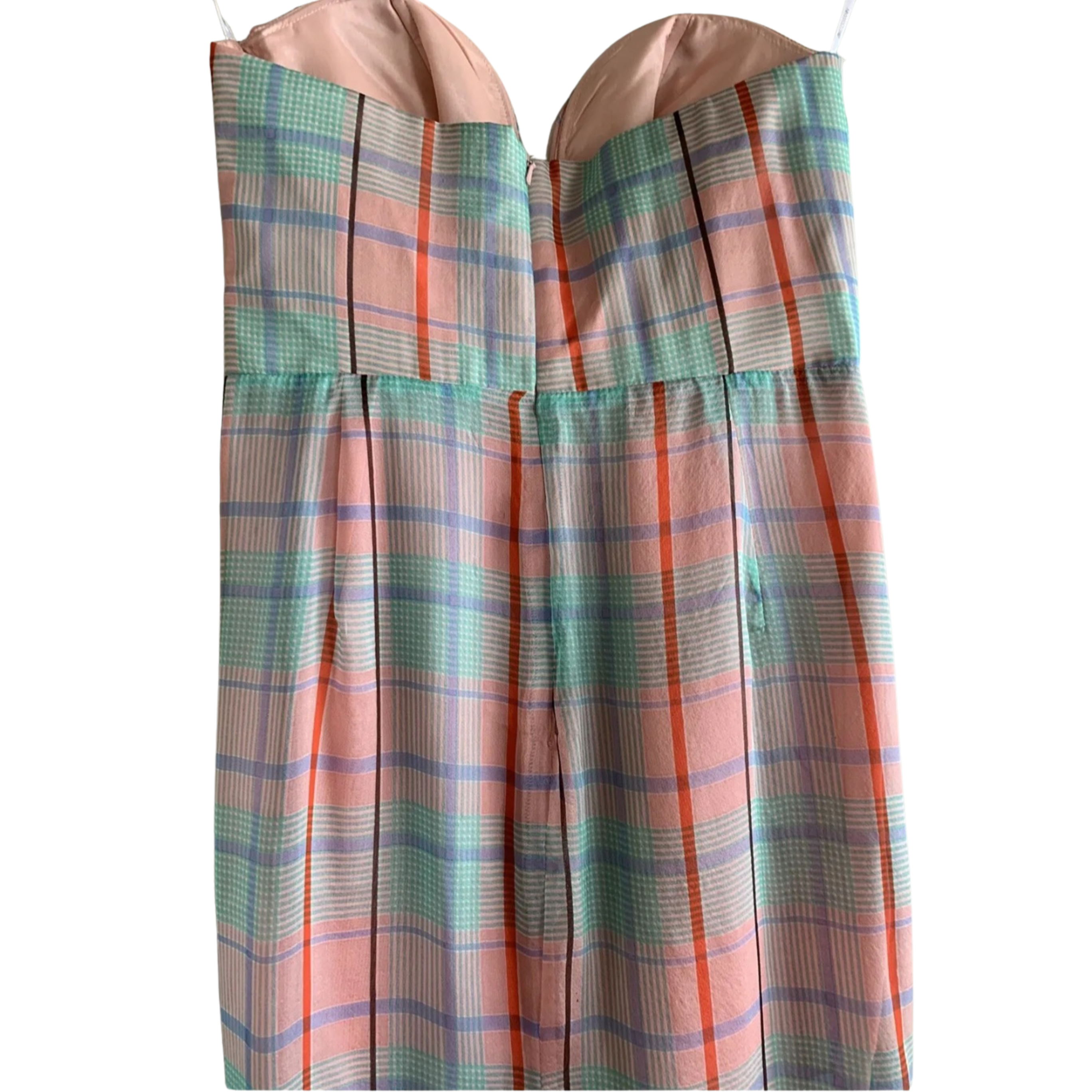 A romantic Zimmermann silk plunge dress in a vibrant pink check, featuring an asymmetrical hem and flowing silhouette—perfect for events and summer occasions.